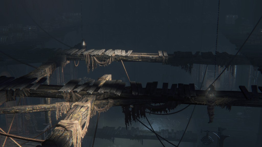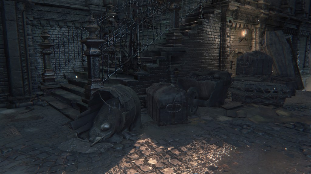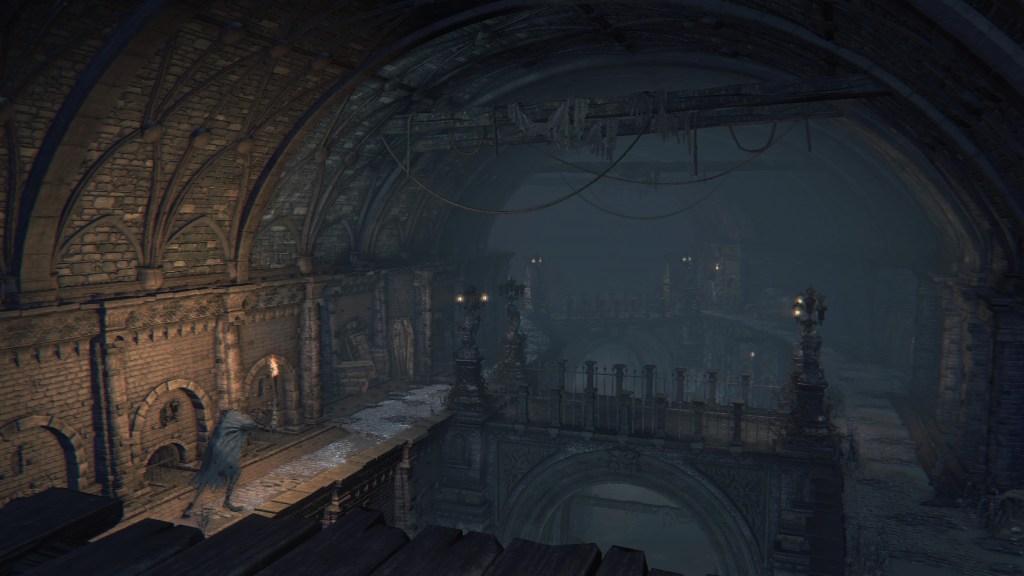 Managing this sewer system alone would provide plenty of work to the residents in the area, and it does look to have been a major hub of activity. An entire dock for dingeys, winches to raise or lower the boats or large supplies, barrels and sacks of those supplies to transport — the sewers look to have served as more than just waste disposal. The “human” enemies there are either shirtless with a spear or wearing a coat with a saw; likely a fisherman and butcher, respectively. Their work seems aimed at extracting the oil carried on their persons, which they then package and move to the city above. Whether or not they also package the leftover meat, relying on fish occasionally flowing into a sewer line speaks to the locals’ desperation to get by. This is not a place for anyone to be if they can help it.