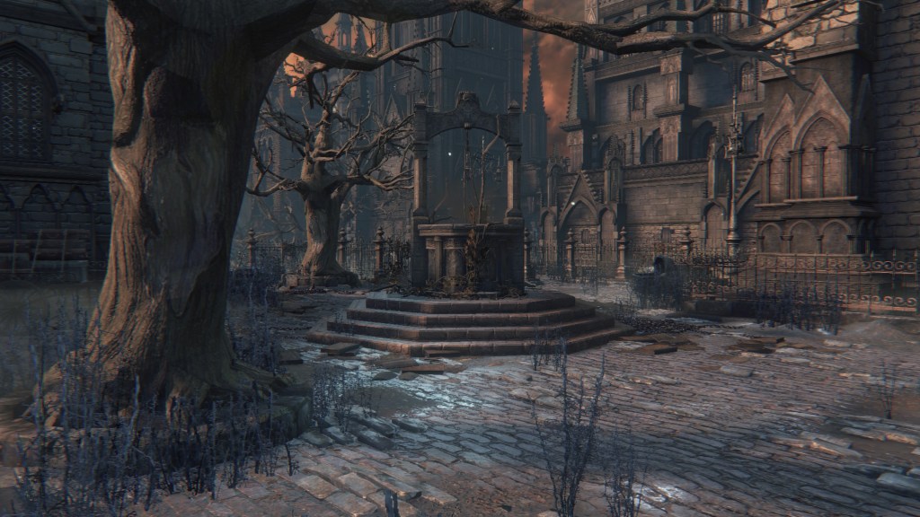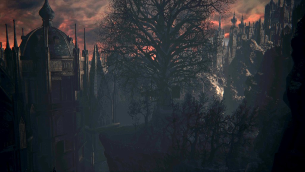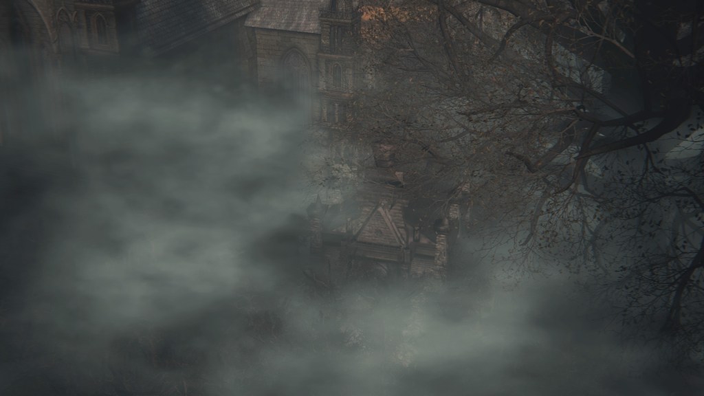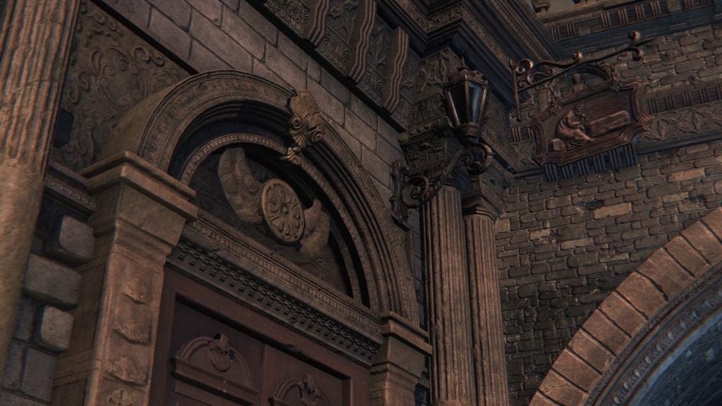 In the meantime, Gehrman settled into his new role. To tinker with his equipment and invent new hunting tools, he established a dedicated workshop. This hunter’s workshop may be built on the site of his fateful prayer. Beside the building is a small cliff curving around to form a slope up to the side entrance. Just a convenient quirk of the land, or was this depression the aftermath of a meteoric impact? There is an inexplicable second side door overlooking the cliff, with the messenger baths in the Hunter’s Dream both centering around this curious spot. And with all the greenery, one tree in particular towering as high as neighboring buildings, the property certainly wasn’t integrated into that urban area at the time. This would make it the perfect meteor site to then settle for harvest and research — then later development.