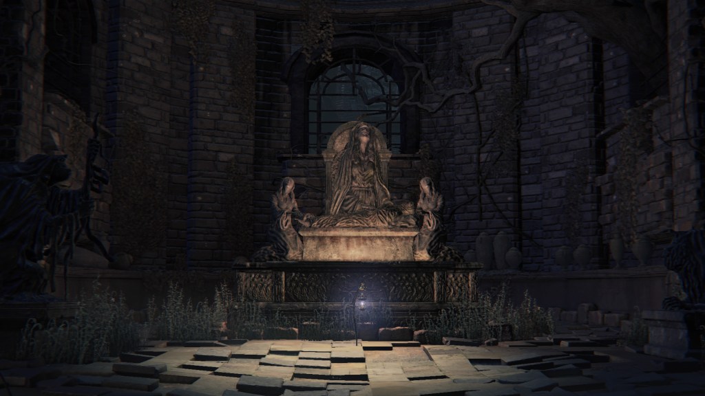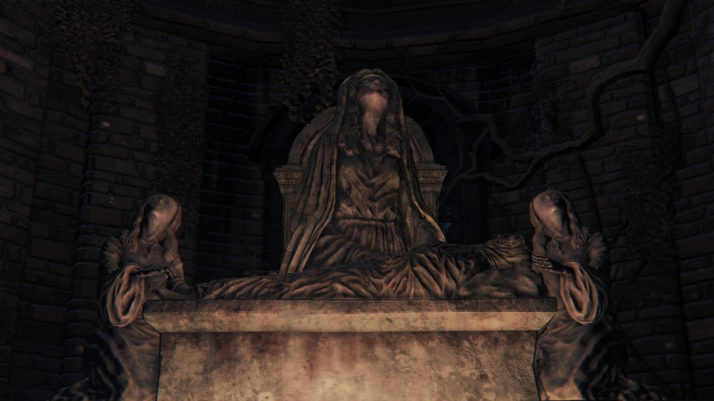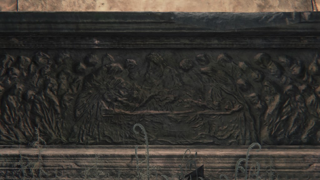With blood drinking so deeply rooted in the culture, it is no accident that the city is built atop Pthumeru. Gehrman acknowledges how few chalices have been brought out from the labyrinth, yet a Pthumerian chalice is enshrined at the large church in Old Yharnam. This “Holy Grail Church” (聖杯教会) also features an altar with reliefs of two robed women placing a body on a table before a larger hooded woman, countless others crowding around to watch. Upon the altar sits a statue of the same women presiding over the body wrapped on the table; surrounding them, two figures of hunchback men in bandages on their knees. This set up impresses these women as spiritual healers looked to for guidance regarding disease. More effigies of men masking their affliction pervade the city, sharing motifs with those in the Chalice Dungeons. All of this betrays Pthumerian influence, as does their burial practices. Graves are erected on the city streets, purely ceremonial given that they sit cluttered atop cobblestone. Nonetheless, it shows the Pthumerian compulsion to leave these markers for interment underground.