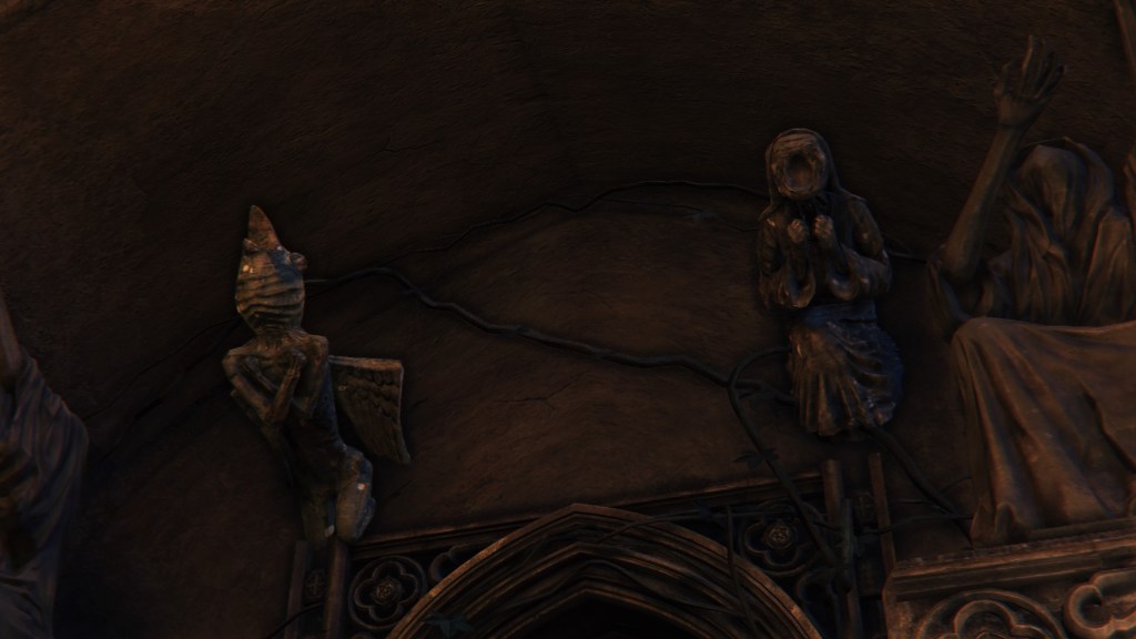 All these differences reflect a Pthumerian origin point at Yahar’gul. When the settlers first came from underground, they settled at the bottom of the valley where direct sunlight would be less prevalent. With memory of their heritage fresh, their icons would depict their gods and the transcendent transformations all descendants of Pthumeru strove for. But life above ground is a completely different experience, their funerary culture now threatened by scavengers like crows. And as we witness throughout the region, there are no shortage of crows ready to gobble up the carrion, to the point that they can only crawl on their fattened bellies. The gargoyles thus came to depict the birds of death as the demonic entity to ward off evildoers, coinciding with memory of the Great Ones fading. Rather than address the gods directly, the later church has the human figures almost universally look toward the sky for guidance — the new distance from their gods, the arcane, and their religious roots nowhere more palpable. They still prayed to cure illness, but the form they prayed to was forgotten.