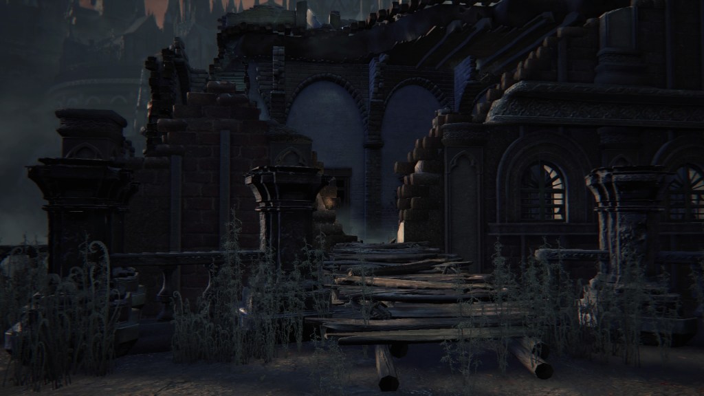 The hunters first looked to setting up a home base in town. One of the ruined brick buildings is home to a number of hunter corpses along with one chest storing the tempering blood gemstone acquired from certain beasts in the area. On the outside, makeshift wooden platforms and bridges cross into neighboring edifices. All of this appears designed for hunters to quickly navigate around town from the high vantage point of this building’s upper floors. And inside that base of operations is a hunter’s note bemoaning that they must burn everything with the town “nothing but” beasts. They clearly tried keeping the scourge under control even as they prepared for the worst, explosive jugs of oil left around many of the buildings we explore. Yet at some point, too many of the populace were becoming beasts. Either the hunters risk all be overwhelmed by a horde, or they cut their losses and save those left atop the valley. They chose survival.