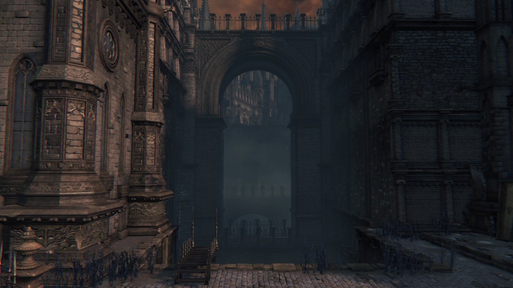 On the south side of Yharnam City lies the shady part of town. Gilbert confirms the place isn’t normally traversed by outsiders, and for good reason; the south side looks to be for the poor working man handling the dirty jobs. The area’s most prominent feature is its main sewer line spanning across the valley to the Cathedral Ward, connecting the two sewage systems. This also appears to be the nexus for the whole system, as the valley’s river flows into the rock face directly below the south side. It is that part of town’s job to pump up the water collected in the earth and distribute it to the rest of the urban topside, hence those streets are lined with manholes, wells, and hand pumps. Indeed, Old Yharnam has none of this infrastructure, the closest being a reservoir; anything more was superfluous, being so near the river. Yahar’gul similarly maintains mere open channels as the river flow is redirected through town. Only those later settling further up the valley needed better access to the water.