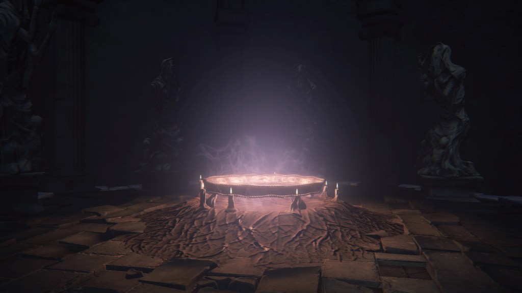 Gehrman recommends we follow in our predecessors’ footsteps in seeking the chalice enshrined in Old Yharnam. Hunters apparently borrowed the holy grail from the church whenever they found themselves incapable of handling the larger, more fearsome beasts. The reason, of course, was that it could be used as a catalyst for a ritual in the Hunter’s Dream. At one of the grave altars, offerings of things like arcane haze were made to transport the hunter to the chalice’s dungeon of origin. This version of the underground ruins proves to be another dream tailored to our offerings, certain materials deciding not just which ruin we visit but what state it will be in and who we will find lurking inside. In short, it is a supernatural form of simulation training, hunters testing their mettle against threats which existed — or at least could have existed — in the labyrinth at whatever period the ritual produces. The church chalice only takes them to the uppermost levels of the ruins, but if they find more from deeper dungeons in the dream, they can then bring it back for use in the next ritual.