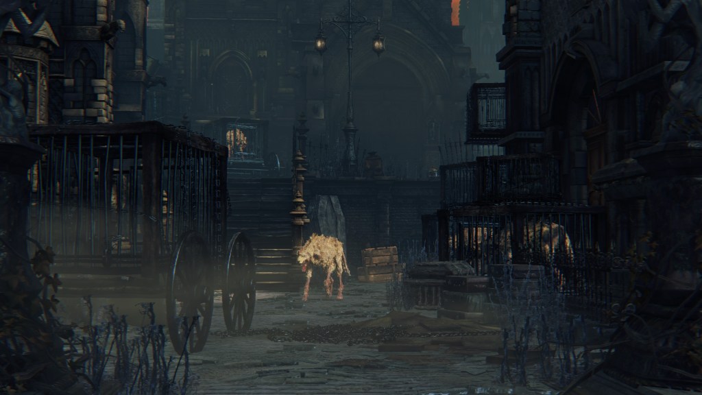 Ironically, one of their most effective “tools” then wasn’t designed in the mechanical sense. We see that dogs have been used in beast hunts since the old hunters. The breed accompanying them in the Hunter’s Nightmare resembles the Doberman, which serves primarily as a guard dog. In other words, the old hunters repurposed the pets protecting their domiciles as hunting hounds, their job to keep the beasts at bay while the owner went in for the kill. This breed evidently wasn’t ideal, however, as modern Yharnam uses another resembling the Irish Wolfhound; a dog specializing in hunting beasts the shape and size of wolves and bears. Most likely, the guard dogs died out, requiring the new and better-suited breed be brought in — the rabid hounds in the cages they were imported in stacked together on one side street in town. Even so, fighting beasts with beasts is a wise move, since there is no better tool than something that can do harm without the owner having to risk getting close.