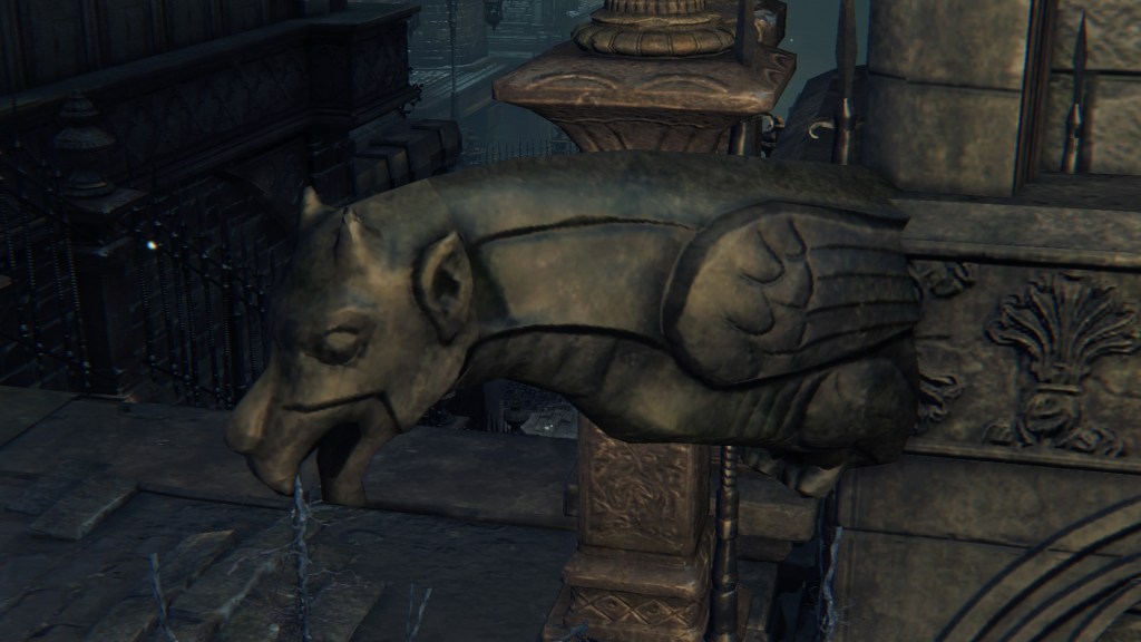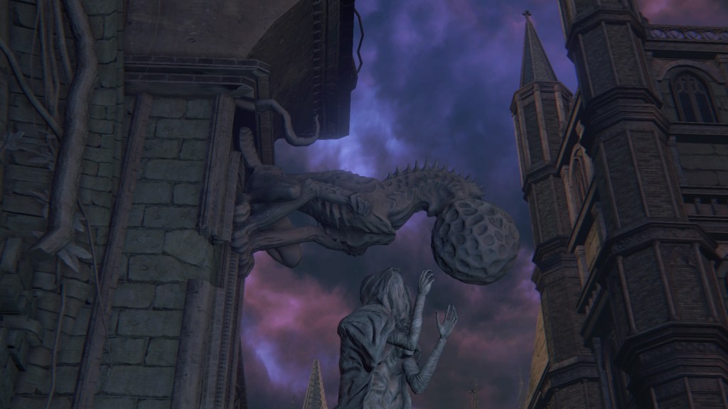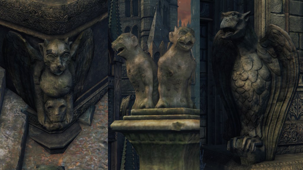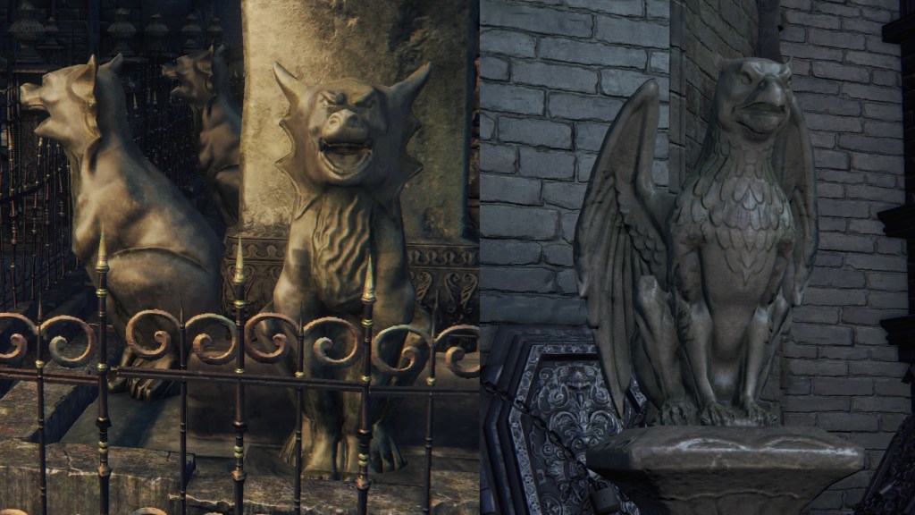 Proof of this earliest site still exists in Yharnam city. Yahar’gul is large enough to be considered its own town, a district distinct from the parts of Yharnam now regarded as the “old city”. However, its neighboring position suggests that it is still part of the city, even older. Although the localization claims that the modern School of Mensis are the village’s “founders”, descriptions to the Yahar’gul set only assert that the School “presides” (主宰する) over the place. Local hunters wear iron armor of soldiers from a bygone era, presumably collected from town. The name itself is unlike any other, uniquely Lovecraftian in style. Indeed, the Lovecraft influence pervades the architecture, buildings adorned with gargoyles in alien shapes; contrasting those in Old Yharnam, which take on a distinctly avian flare. More specifically, the Yahar’gul gargoyle heads resemble Amygdala, which is fitting since statues of the Great One and star children are also found around town. This is especially true at the city church, where the “gods” are enshrined alongside the same idols of veiled men hiding their illness seen throughout Yharnam.