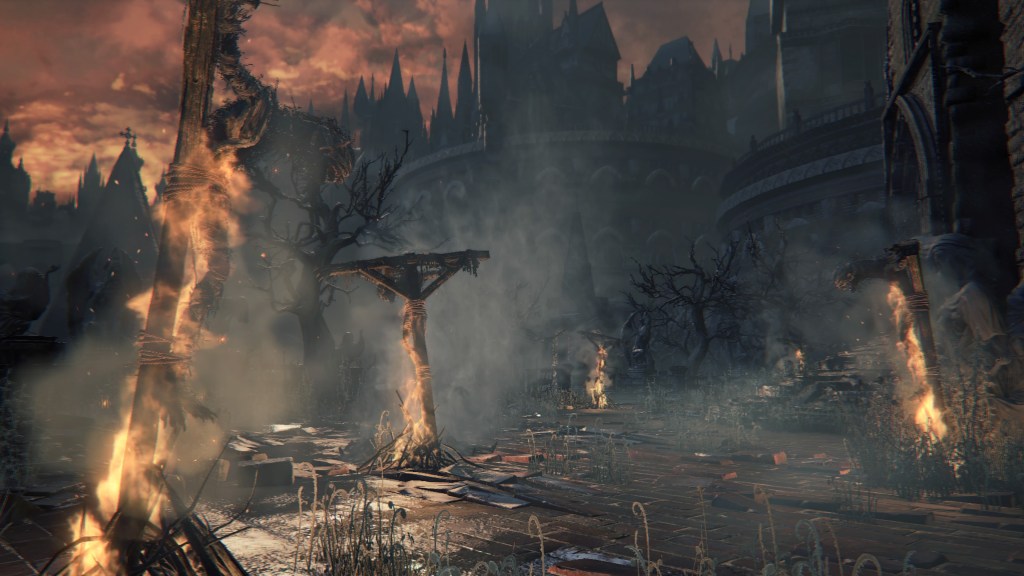 As various item descriptions relate, the old city suffered a massive outbreak of the beast scourge, resulting in its fiery cleansing. The ones performing that cleansing were, of course, the hunters, wearing specially damp equipment designed at the workshop so that they could leap through the flames without fear of getting burned themselves. Covered in soot, they hunted the beasts trapped within the purifying boundaries to ensure none escaped — although nonsensical considering enough time has passed for the ruins to suffer serious overgrowth, we will find no shortage of beast patients burning on crucifixes throughout Old Yharnam. But the blaze also trapped the people — again, while nonsensical, piles of charred men are still smoking all around the area. This was intentional, as the Hunter’s Torch used in the incident was designed to burn beasts and humans both, anyone infected, and the charred hunter set’s description only mentions the sufferers of the disease, not the beasts. So many innocents were sacrificed in order to stop the scourge, and this decision wasn’t made lightly.