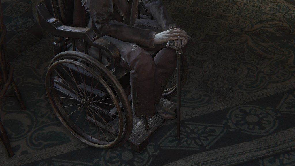 However effective this was, it is presumably why Yharnam today is home to so many old men in wheelchairs. Official websites make note of this point, indicating that most even count themselves among the wealthy — they are affording those fancy wheelchairs somehow. They have also retained their weapons over the years, which include not just pistols and rifles like most Yharnamites but also gatling guns and flamethrowers. How were these wheelchair-bound men so consistently affluent, armed, and aging? If they were retired hunters, this wouldn’t be a surprise. After all, the workshop wasn’t a charity. With the explosion in beast cases, hunters must have been paid handsomely for their key and highly specialized contribution to society. We also see the more militant arsenal developed for their use. Aging out of the role is likewise a given, especially when losing function of a leg from extended constrictions to blood flow. Better to retire a cripple than become an impediment, either as dead weight or another beast to hunt; many understand that fact, even if only out of fear of the blood.