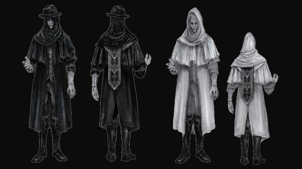 Other aspects of the uniform similarly follow from the founders, and they took heavy inspiration from their old school. Many church garbs borrow directly from Byrgenwerth, employing some combination of vests, long coats, or thick cloaks. The main distinction between ranks thus became color and complexity, which extended to headwear. Most clerics don hoods and, oftentimes, brimmed hats while the top brass wear blindfold masks styled after Willem’s own. This is demonstrated by the three figures at the surgery altar. Two hooded clerics flank the third bearing a longer holy cloth and tall blindfold mask. His status as their superior is reaffirmed by his thin ribbon tie brooch, which is also only seen in the highest-ranked cleric attire. The Blindfold Mask’s description confirms that it signifies direct lineage to the Provost’s teachings, so of course they would be worn by his former students-turned-church fathers. As for the actual clothing, the base ranks wear black while higher ranks dress in white.