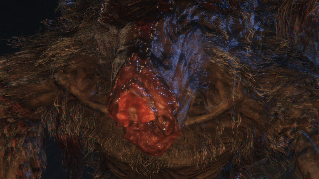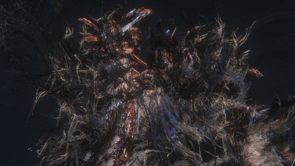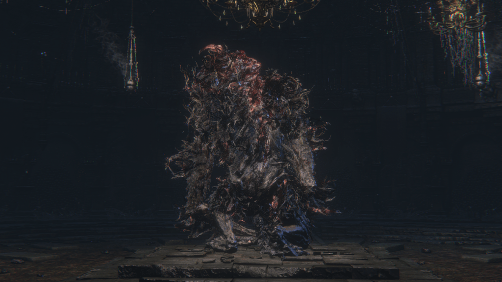 And so, his best bet was finding one in the labyrinth. This is why the Bloodletting Beast knew not to search Isz — the church founders had been exploring that ruin since they were students, with no sign of an infant Great One to be had. Laurence’s only hope for a child was with his predecessors in Loran or the queen residing somewhere in the lower reaches of Pthumeru. If he brought anyone else on this expedition, he long since left them behind, alive or dead, by the time he reached Lower Pthumeru as the Bloodletting Beast. The journey to there was not without resistance, the beast cleaved open all along the back until becoming the scar across his head. Was this injury suffered before or after the transformation? Considering beasts’ regenerative abilities, more likely before. In that case, the man was left with no choice.