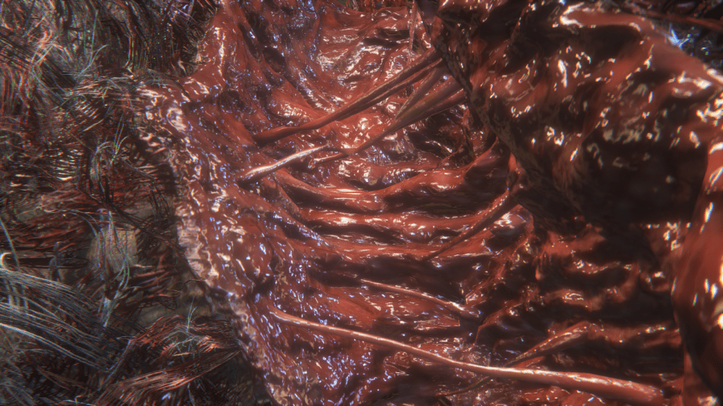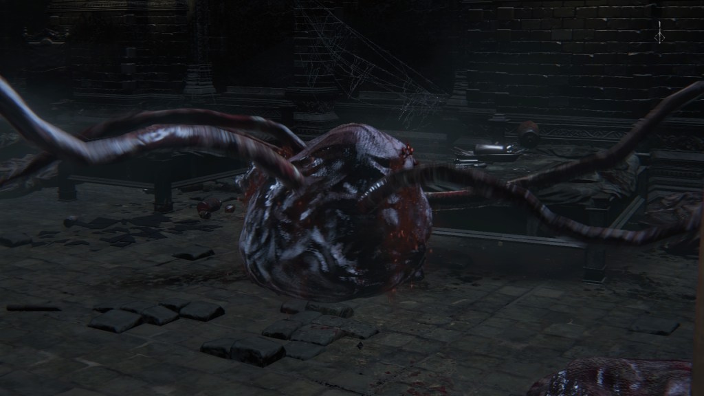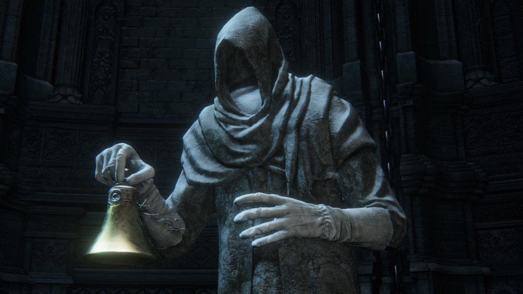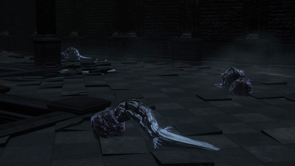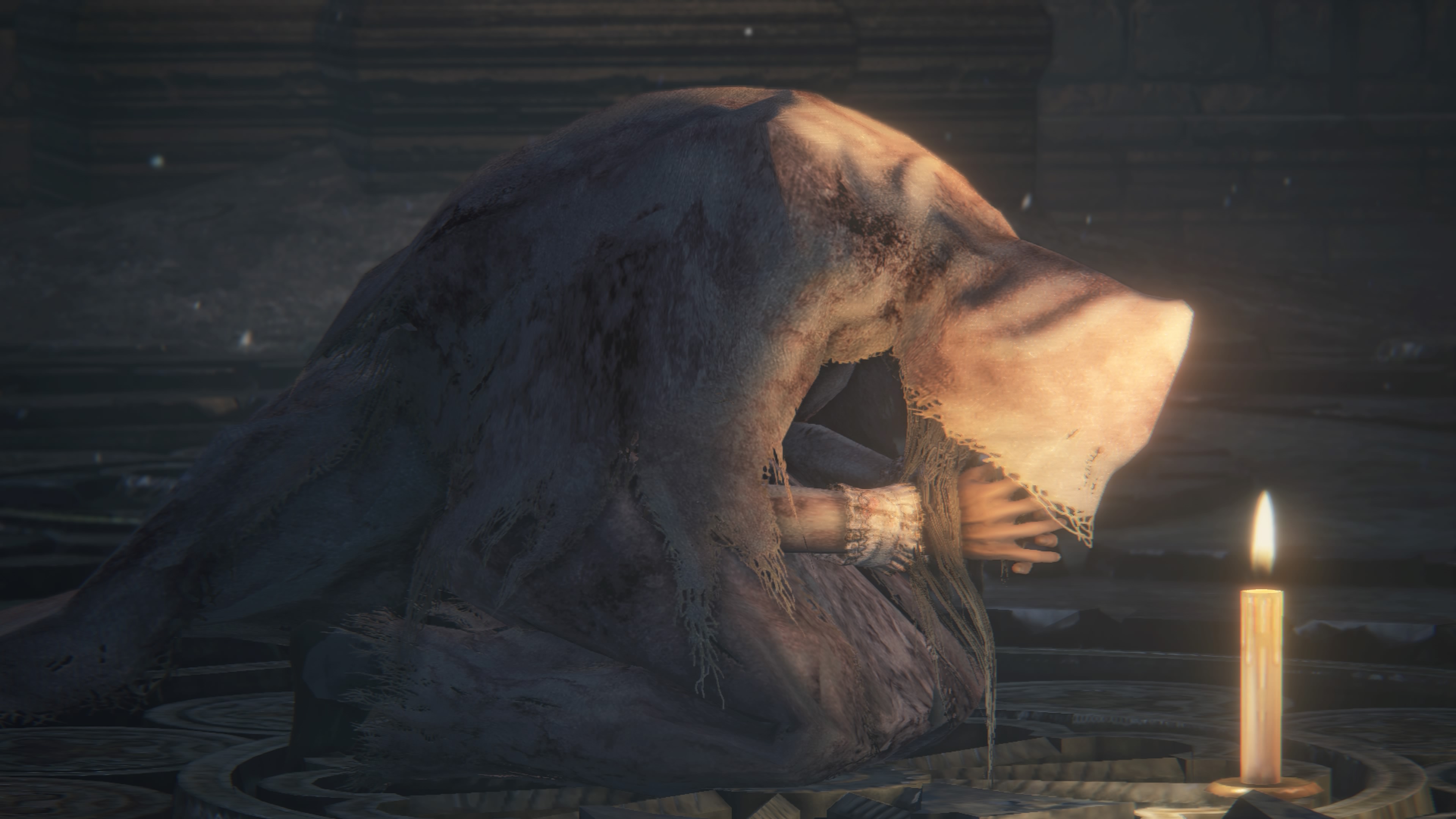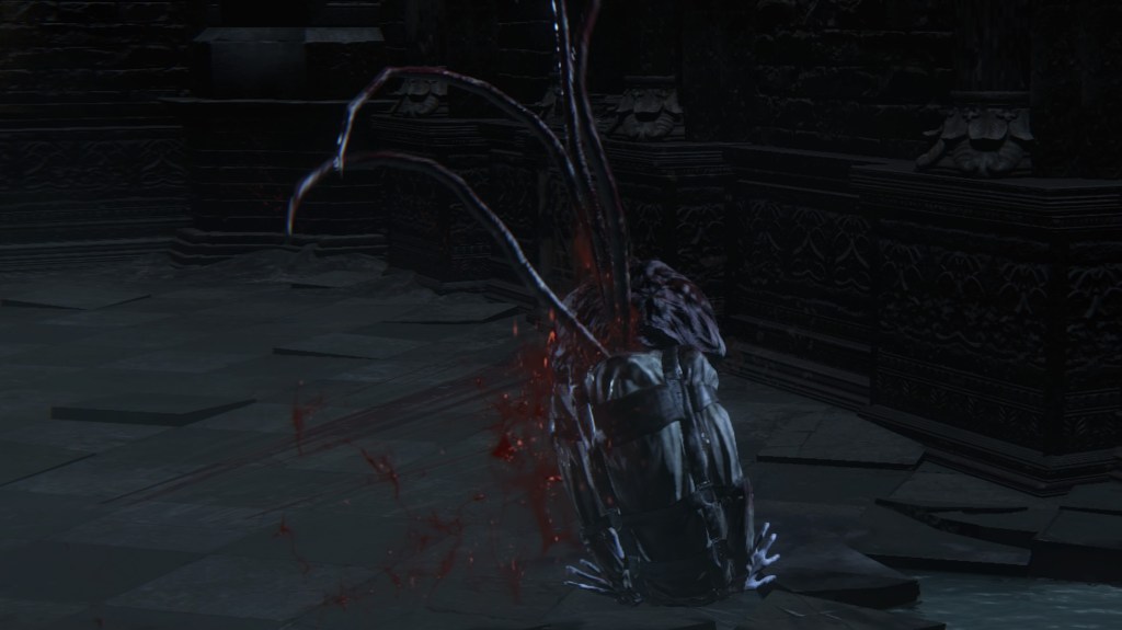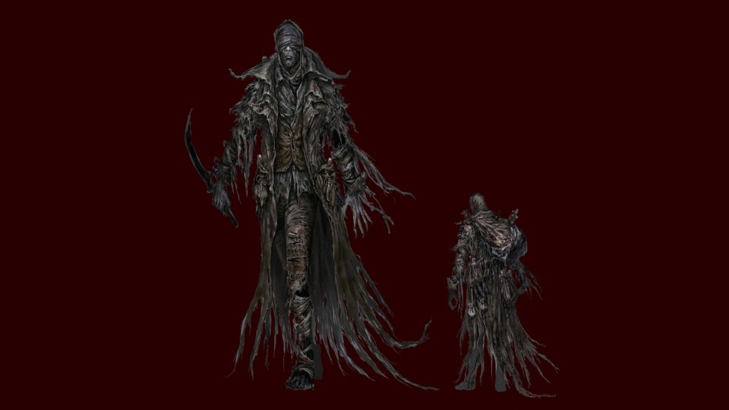 In all likelihood, the bell-holders double as the precursor to the present-day dismantlers. Aside from a general silhouette, both enemies share a weakness to bolt attacks, not to mention use of axes and armor. They are also both dubbed “executioner” (処刑人) internally and in localization. However, the modern product is more refined — their closest thing to tentacles being the dreadlocks tied beneath their cloaks. By every metric, they are still human, only physically larger, stronger, and not requiring a bell to control. This does cost them as large a size and the use of arcane arts, but they are nonetheless well-suited to hunting and dissecting beasts. When it came to massive shock troops defending Cathedral Ward, Pthumerians served as adequate replacements. There were still enough concerns to encase them in a full suit of armor, and their loyalty to various factions no longer aligned with the Grand Cathedral affirms that their diminished intelligence hasn’t changed. But overall, they are an improvement.