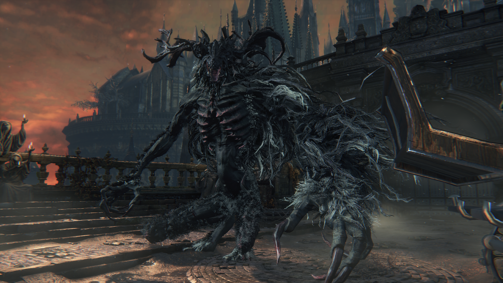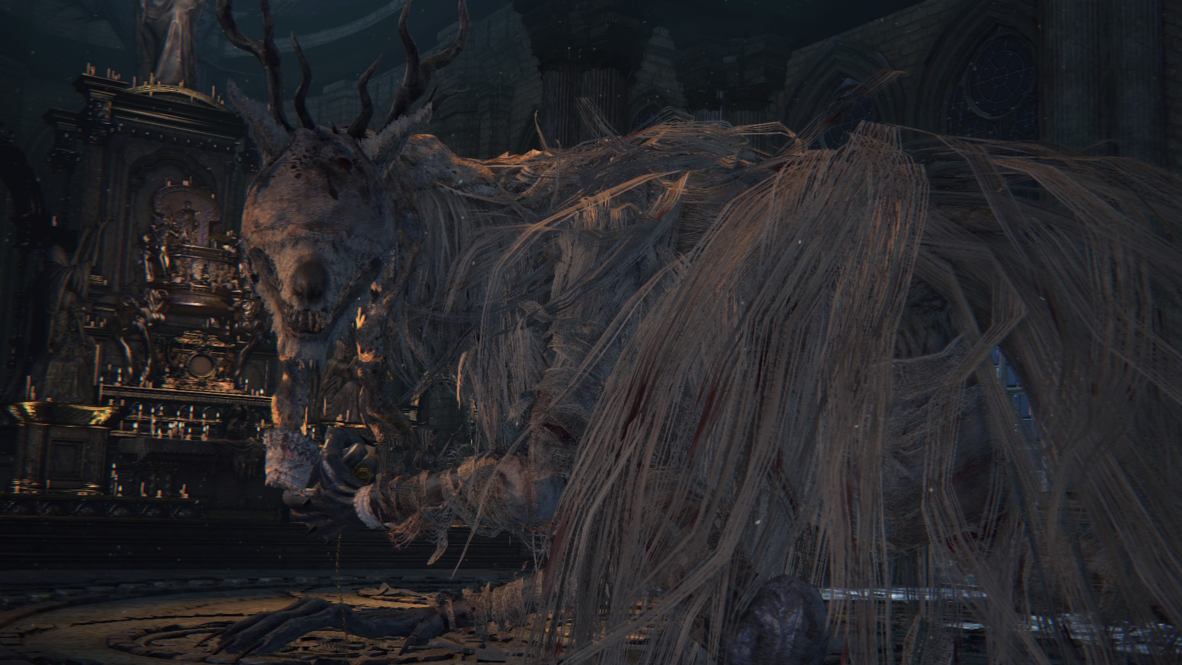 With so many bodies left under their care, it is easy to see how Laurence and his ilk so quickly subsumed the role of Yharnam’s old spiritual body, eventually converting into a religious organization of their own. This went so far as to take over the old church itself. The Church of the Good Chalice is now the den of a blood-starved beast. This is notable because, in its thirst for blood, the flesh peeled forward from the creature’s own back has formed a “hood” over its eyes. Such blocked eyes are common to the Healing Church’s beastified clerics. Though each instance is clearly coincidental, it befits those carrying on the work of Byrgenwerth, mirroring Willem in blocking out physical sight to focus on the “mind’s eye” as Miyazaki explains in a Future Press interview. Put simply, such beasts are reliably former affiliates of the Healing Church — to this point, another blood-starved beast hangs dead in the ministers’ first church, a congregation of beasts revering it. The Church’s popularity knew no bounds, so of course only they could be trusted to be pastors for any church in Yharnam.