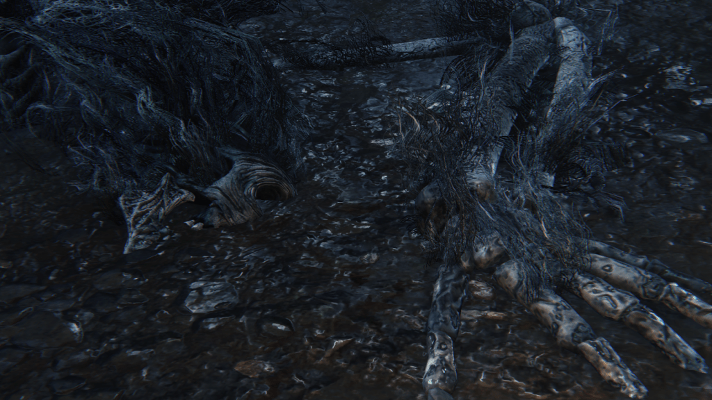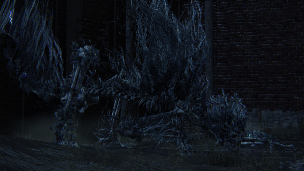 Behind large doors at the end of Old Yharnam’s main street lies the mostly rotted remains of Paarl. Being a darkbeast, he is roused back to life at our approach, but this doesn’t change the inference that the boss has lay dead there for some time. The lamp location is dubbed Graveyard of the Darkbeast, with his bones half-buried in said yard. We can thereby infer that Paarl was led to this out-of-the-way location boxed in by both Old Yharnam and Yahar’gul’s architecture. There he was hunted and subsequently sealed behind the doors, preventing anyone from disturbing his rest all this time. Evidently, this was a situation where the hunters didn’t have the time to make sure the beast stayed dead — such as during an already pressing beast epidemic. Official websites do allude to the darkbeast boss as not necessarily being ancient, as is the case in Loran, but a descendant of the now defunct town consumed by the scourge, like with Paarl. And what does Paarl possess except the Spark Hunter Badge associated with a member of the church workshop, making him another cleric hunter born and serving locally.