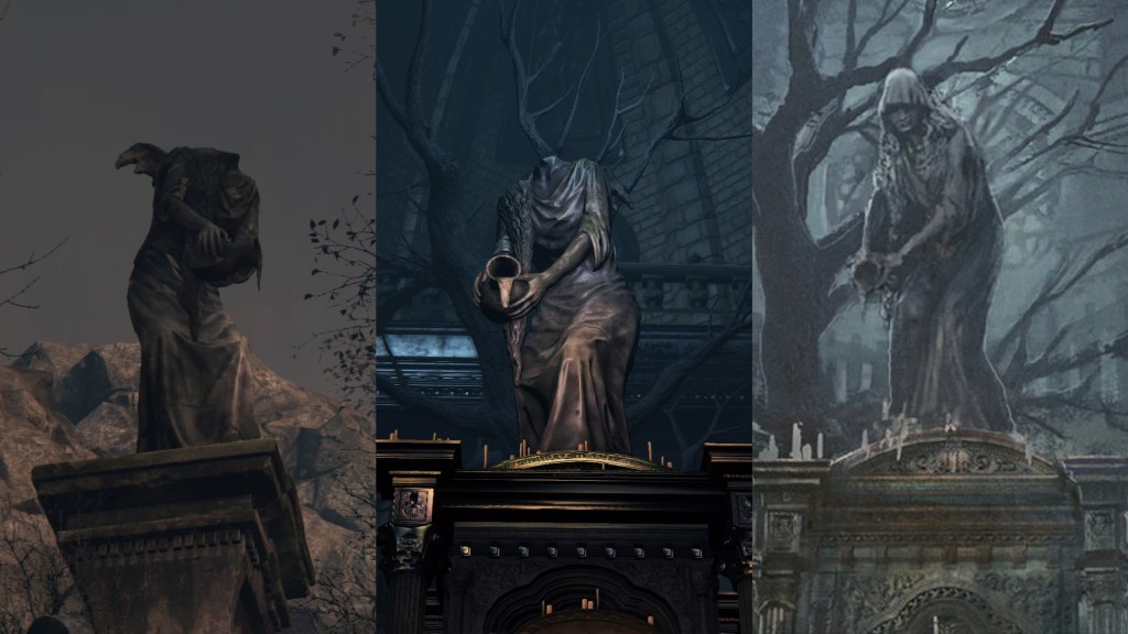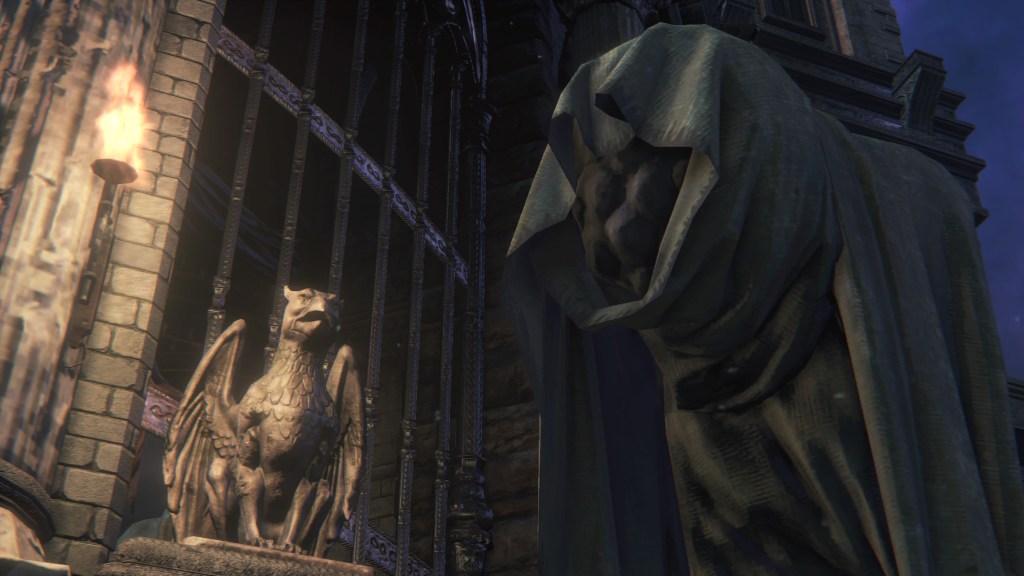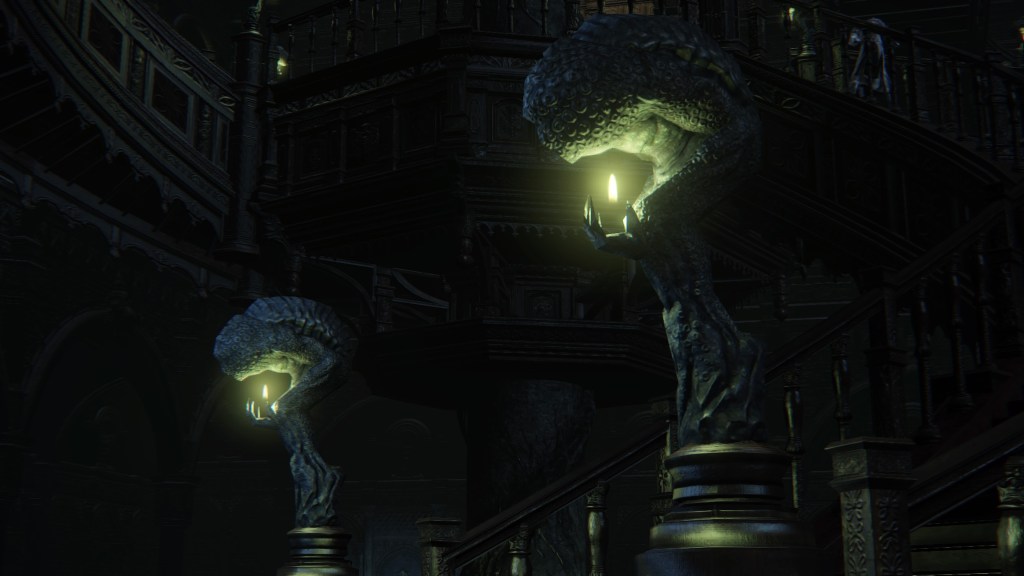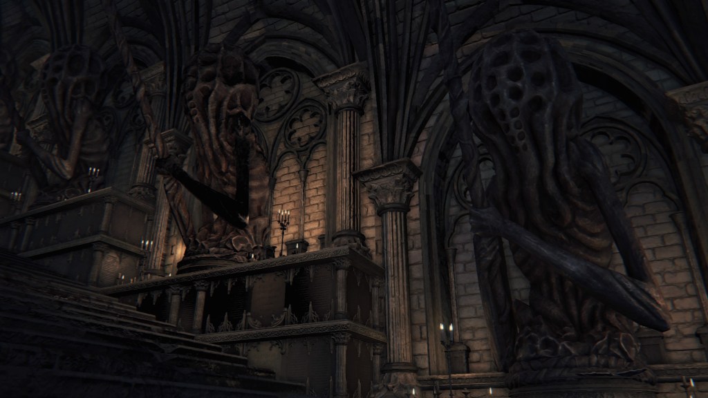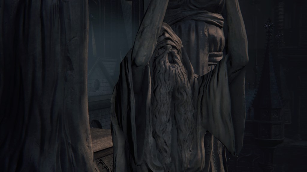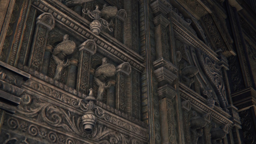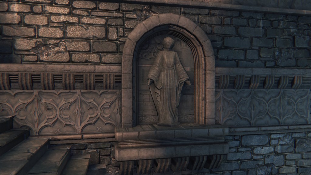 Littering Upper Cathedral Ward are statues of many-eyed eldritch abominations with staves, an obvious allusion to its residents plan for acquiring eyes inside the brain and transcending to Great One status. At the same time, the shrouds obscuring these statues are an implicit admission that the traitors were conscious about the ethics behind their true goals. There is a reason that we only see these many-eyed statues without the shrouds in parts of the cathedral complex hidden from the public eye; the one exception are incredibly tiny figures ornamenting the main doors — the entryway otherwise has us greeted by Amygdala in another blatant attempt to portray the Church as a continuation of the city’s traditions. They adopted the pretenses of a religion, but the church fathers were always using it as a front to advance their research into the arcane. Most of the unshrouded effigies serve as lamps, holding flame, because the clergy sought to grasp the stars’ enlightening radiance. But no sane man would accept being a lab rat for such a self-serving goal, so the Healing Church’s true nature was left thinly veiled.