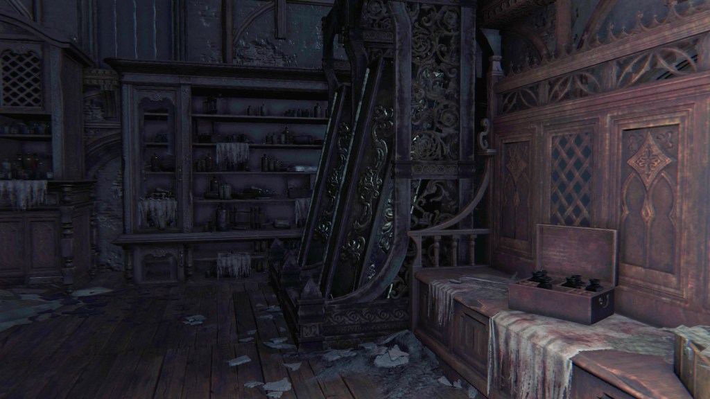 But as the leftover oil jugs in the Healing Church facilities indicate, Old Yharnam’s purification was never completed. The Church of the Good Chalice is burned out, but its cleric beast yet lives. The other church is free of its blood-starved beast, but its oil remains unlit. Worse, in the latter case, the house of god now houses beasts venerating the “holy” blood their former pastor drips and collecting it in a vessel on the altar as part of some twisted, profane ritual. The hunters ultimately abandoned the ruined city to become a town of beasts. Even this evacuation was messy given that a beastly patient remains in the Lower Church, the staircase broken with only a ladder to compensate. The entire operation was an unmitigated disaster.