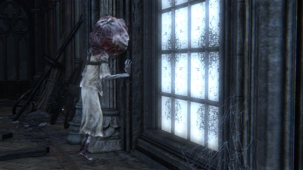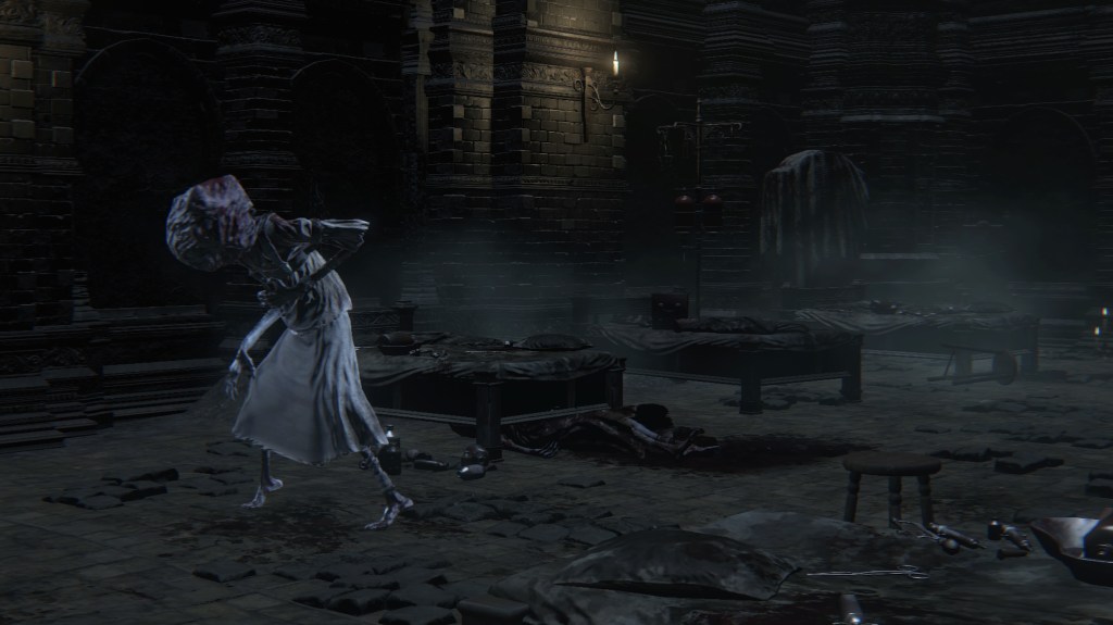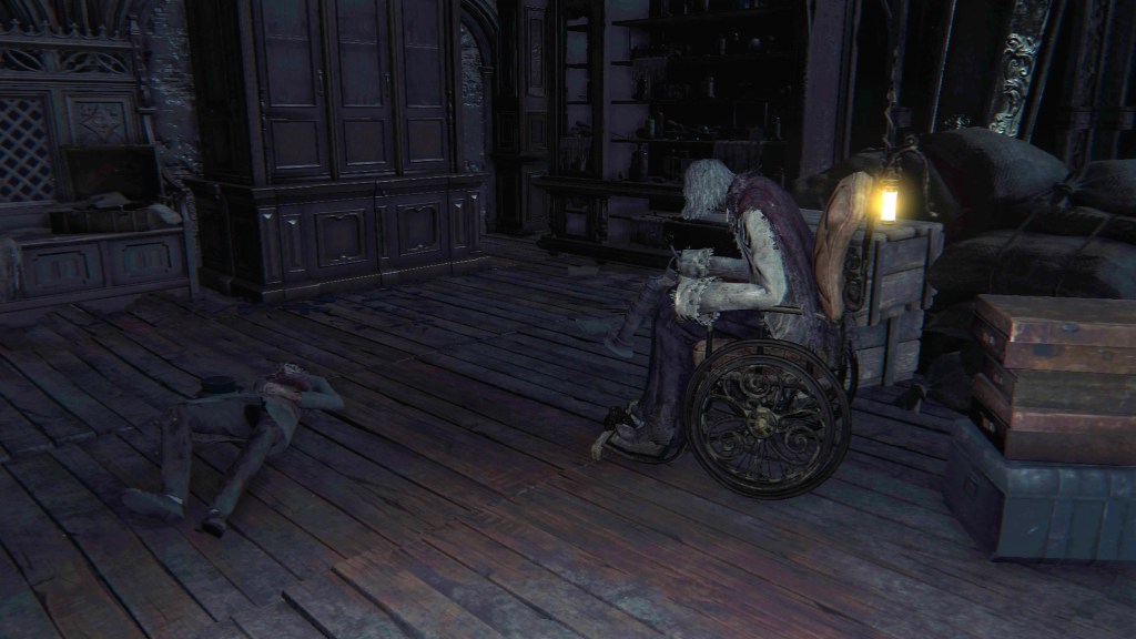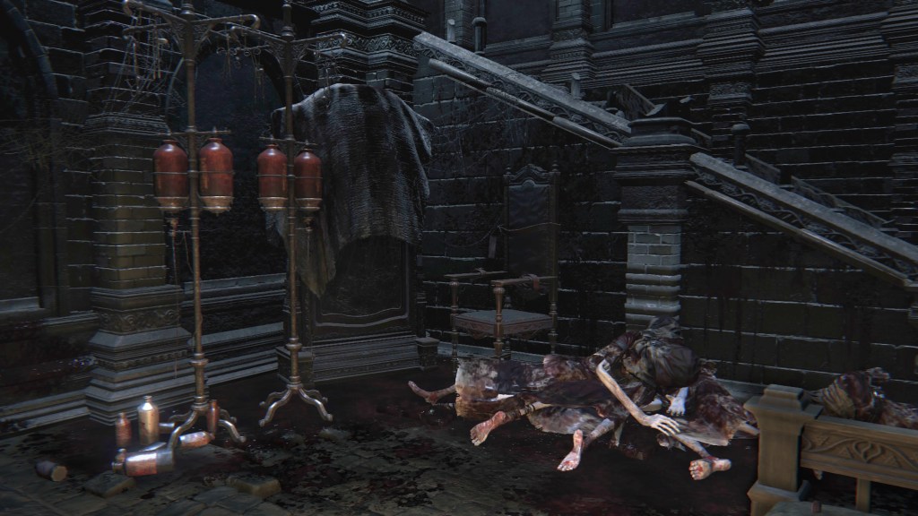 Some of these heads hiding tentacles have been sawed from their bodies. We see headless patients blindly wander the hall outside the patient room with so many of these heads. Despite their miraculous survival, the researchers did sedate them first; the heads carry blue elixirs, which are also carried by dead patients found mostly nearby. Nevertheless, these patients couldn’t handle waking to their body alive but separated, the hostile heads in bearing frenzied blood and madman’s knowledge. For a less extreme example, a few patients have their right arms strange deformed with large pustules which slowly poison us should we be grabbed. This results in them producing murky bloodgems, one corpse even carrying a dirty damp bloodgem. And although we do see a body with the white antidote pills, the wheelchaired researchers prescribing them are also the cause — their patient Adeline has a transfusion needle strapped to the same arm. It was an experiment with different chemical injections. It was always an experiment.