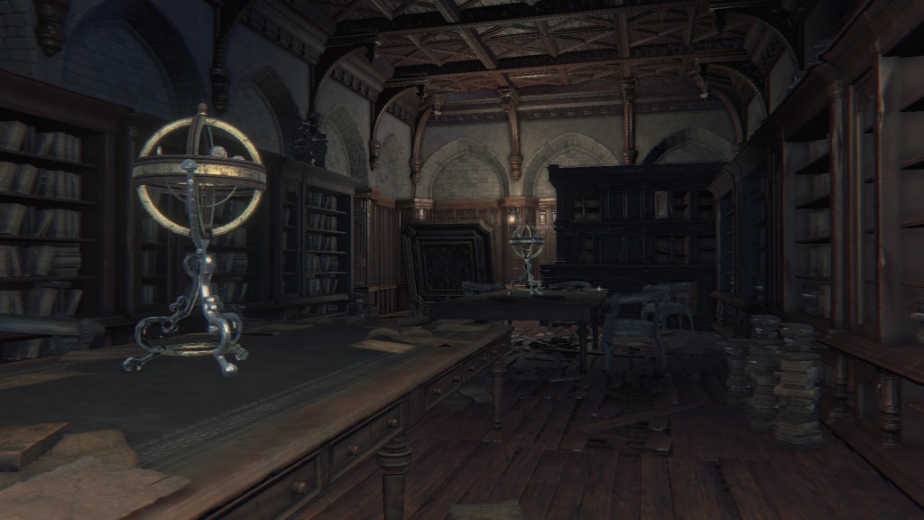 Oedon Chapel lies at the very heart of the Cathedral Ward, all roads in the district ultimately leading back to it; even the sewer line running across the valley to modern Yharnam stems straight from there. We can thereby infer that this “Oedon Church” (オドン教会) was the first from which the later “Church Town” (聖堂街) sprung up. After all, the location is the perfect bridge point between Gehrman’s workshop and Old Yharnam — Gehrman himself even relates his hunters’ advice that fledglings “ascend” to the chapel for the Pthumeru Chalice down below. And looking at the statues and architecture shared with later churches in the district, we can be certain that this was another Healing Church facility, probably the founders’ first move in operations. The building maintains a dedicated study, complete with a library and armillary spheres. They weren’t just examining books, however, as the study also keeps a hatch leading down into the church sewer and, beyond it, Oedon Tomb.
