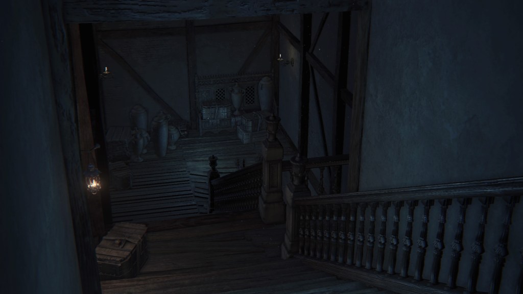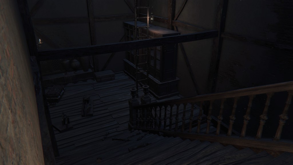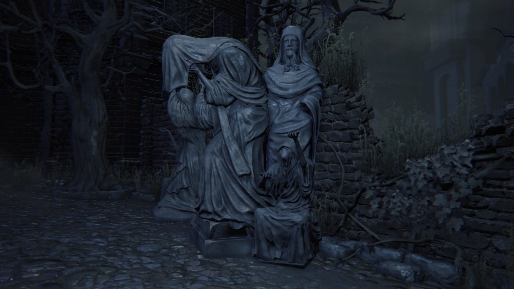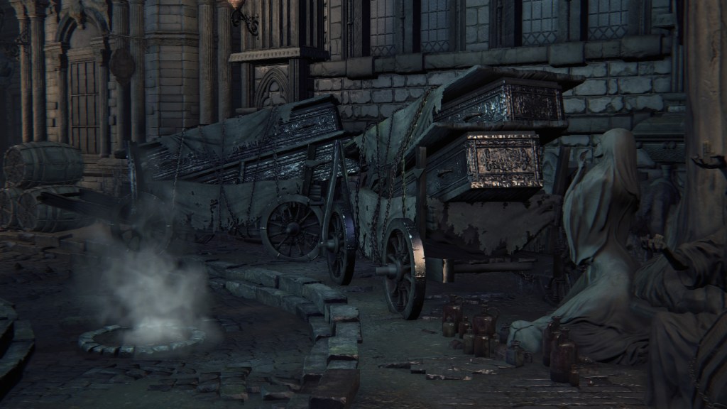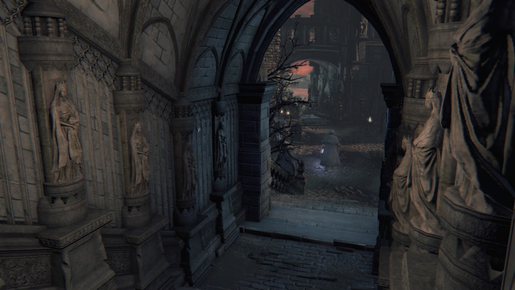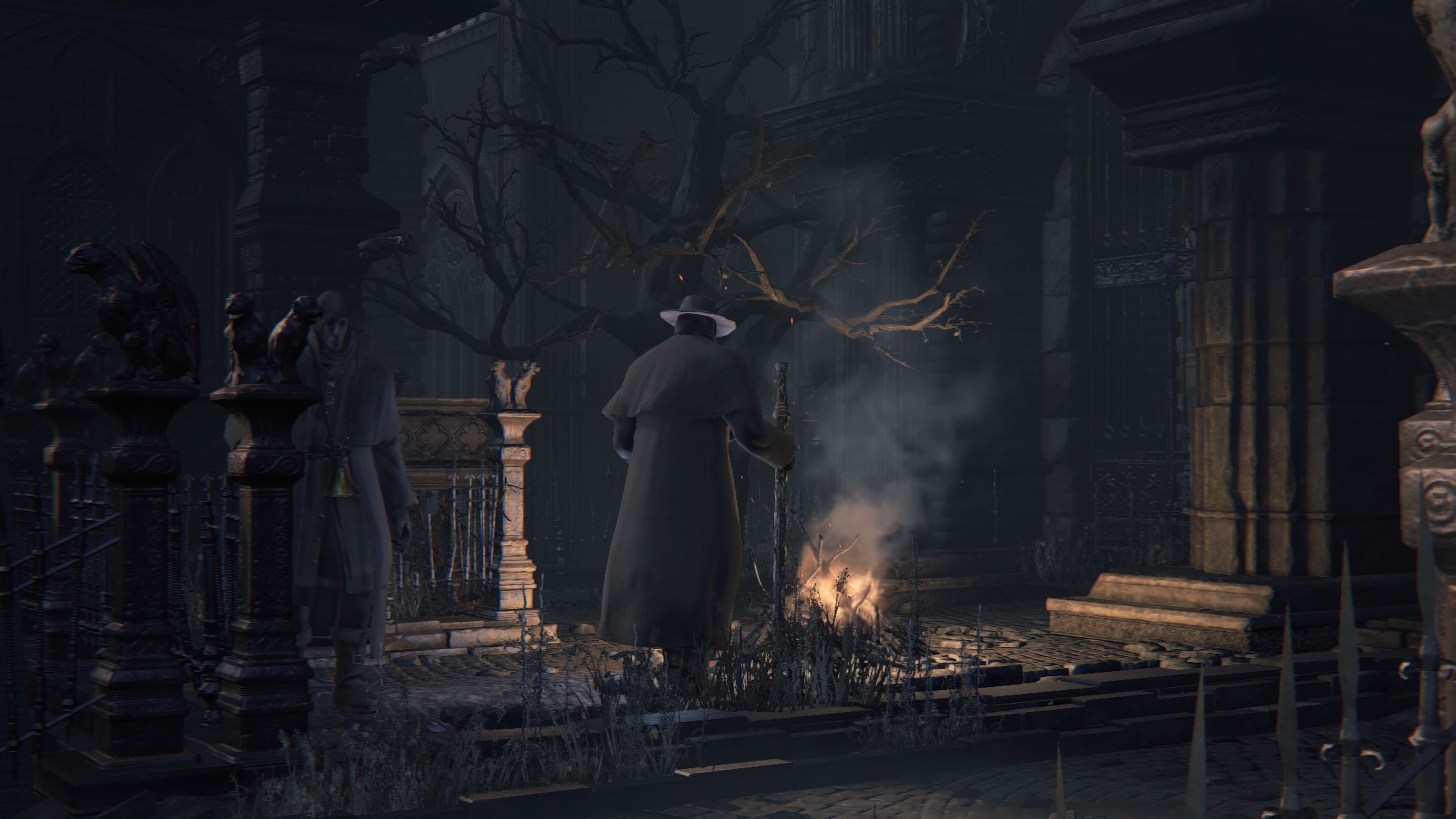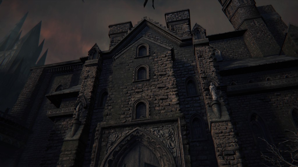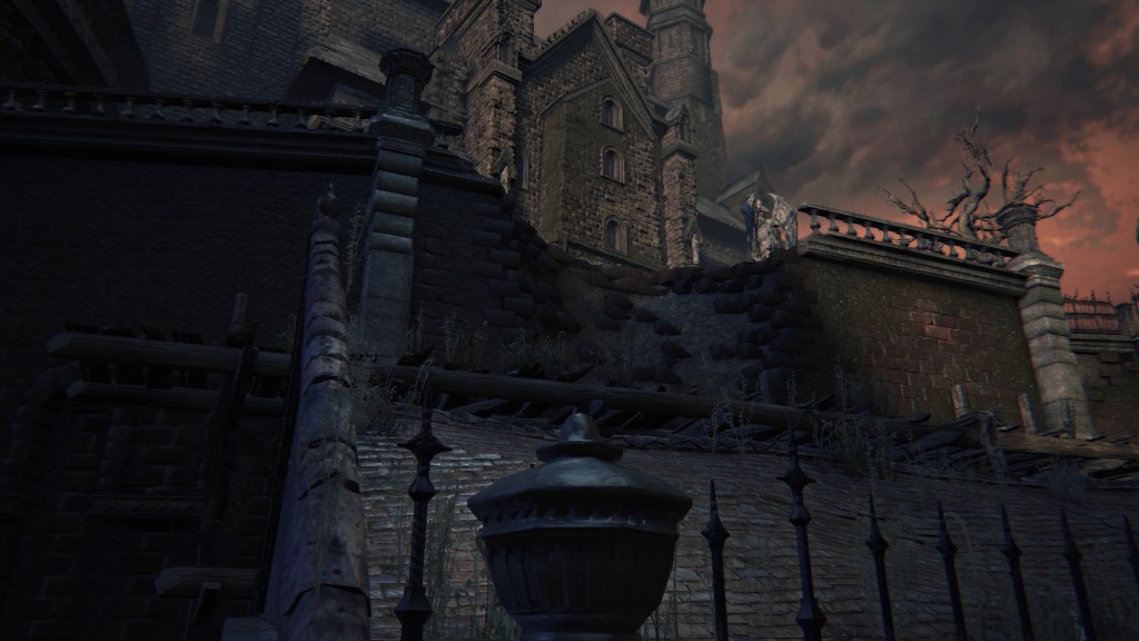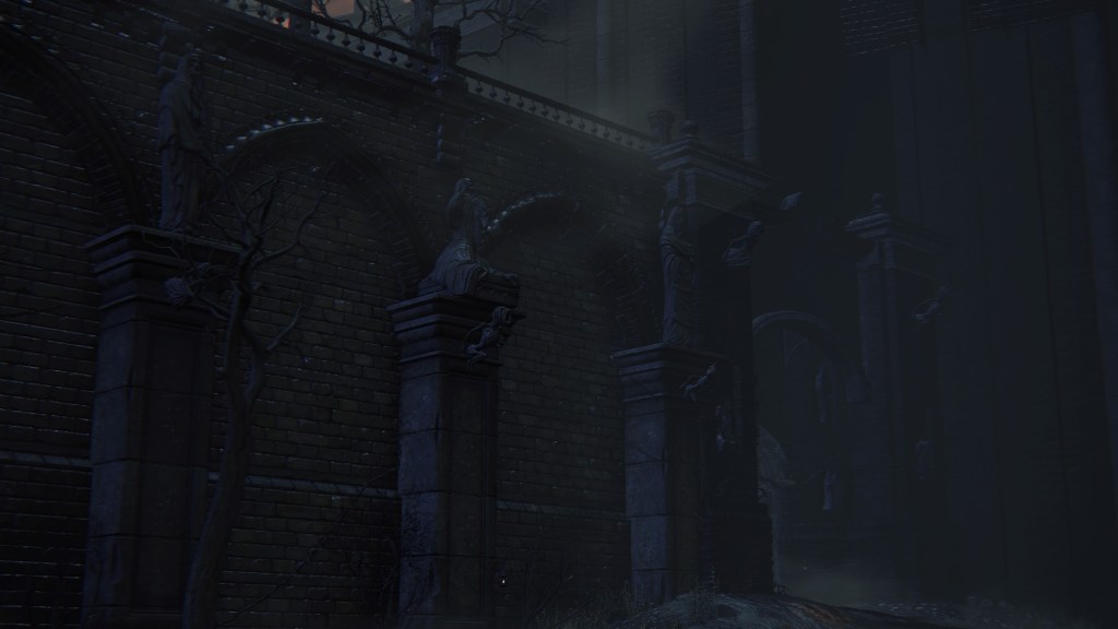 The Healing Church was losing manpower combating this outbreak; worse, those losses were adding to the problem. Gehrman’s hunters did have a good handle on the situation. The building used as their base of operations was the local clinic, where most of the afflicted and thereby beast transformations would be concentrated; the wooden bridges and platforms for navigating atop the building likewise extend to the other Church facilities, including the original church building. Separate infrastructure uses a towering building for straight and easy transit back to the Lower Church and thereby Cathedral Ward. This too wasn’t a random choice. Wise men statues decorate above the doorways like the old city’s entrance to said Lower Church. Coffins and incense urns also rest inside. Taken as a whole, the hunters were utilizing another formal Healing Church facility for themselves.