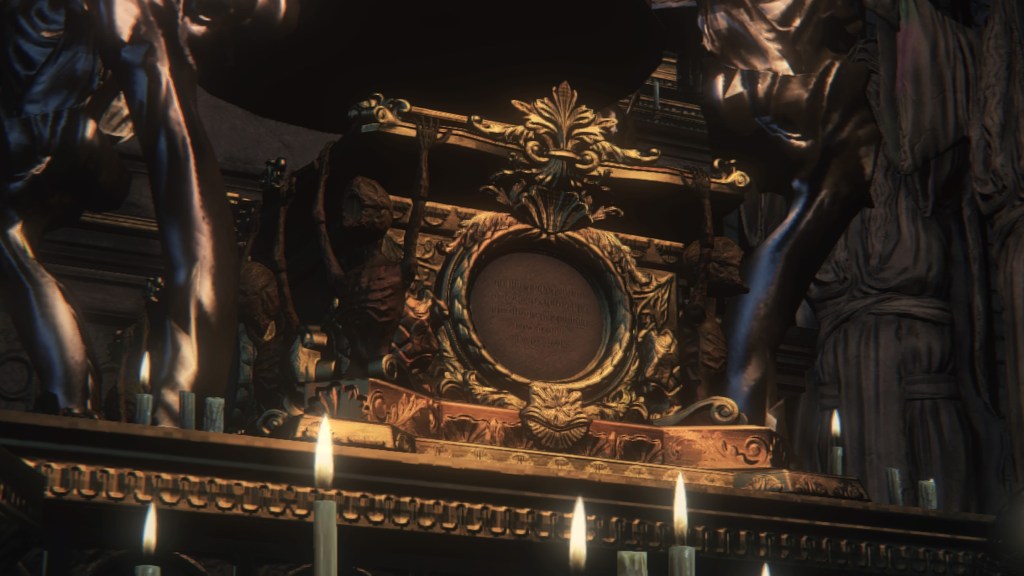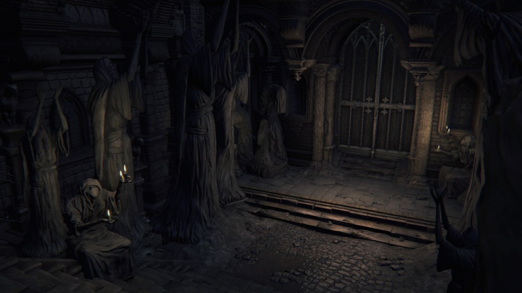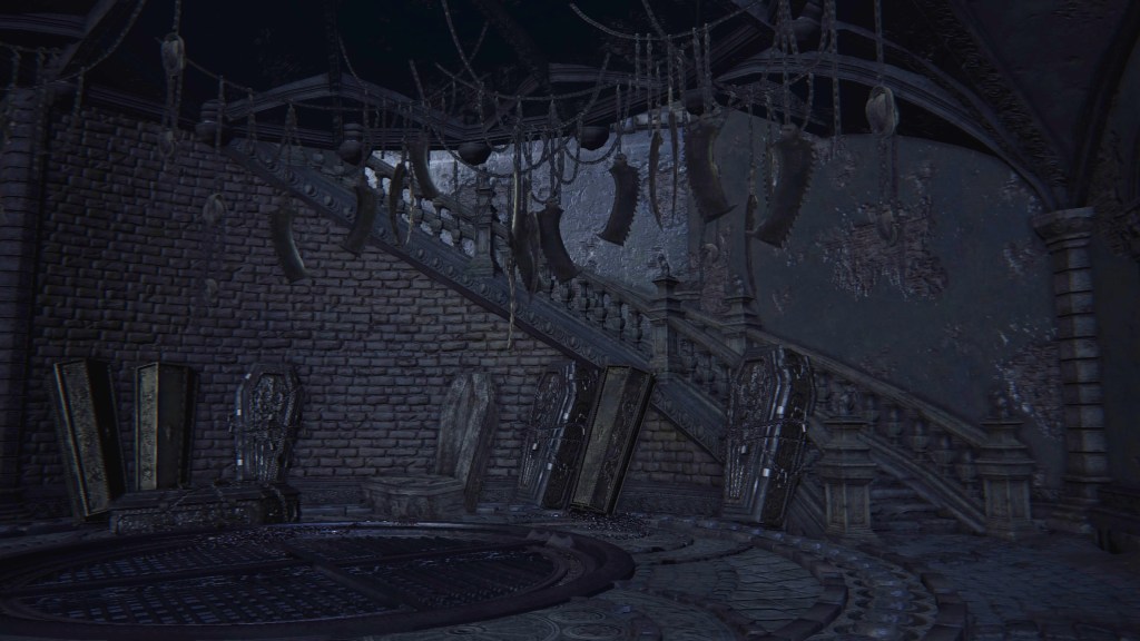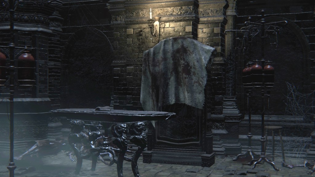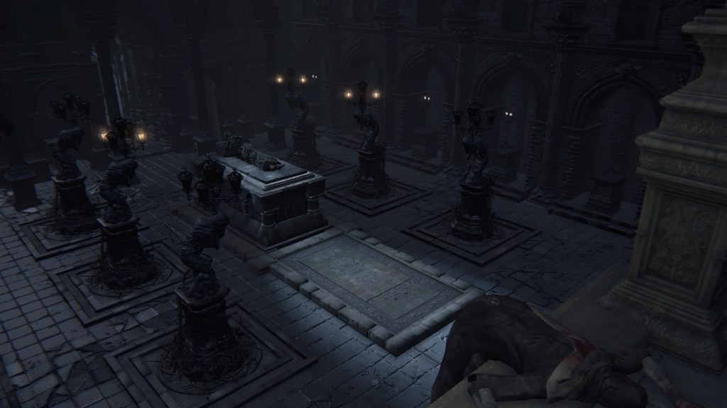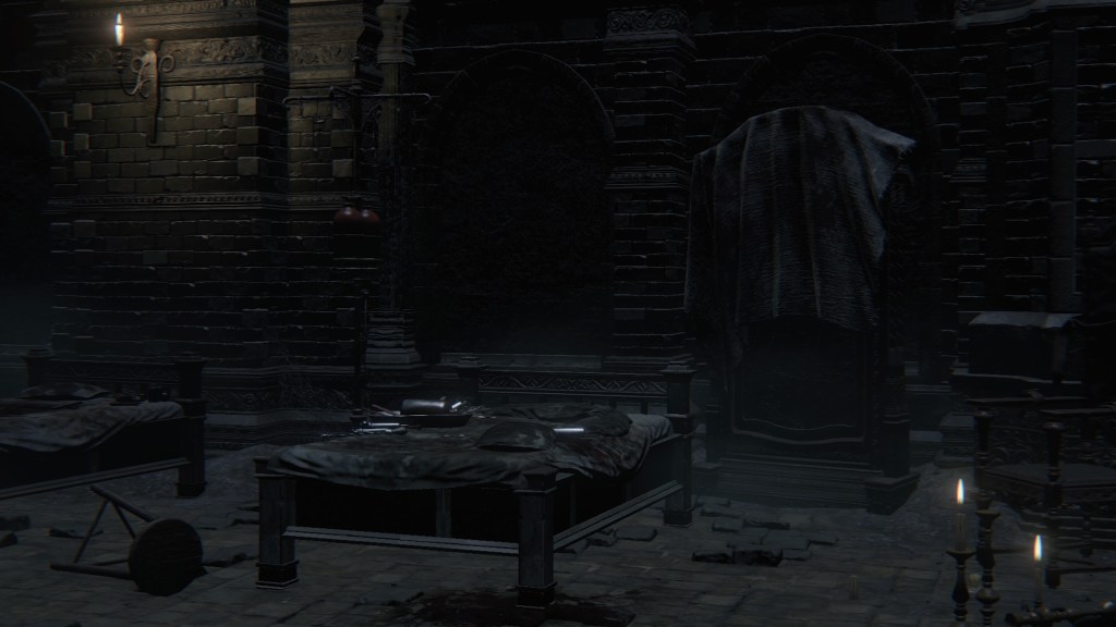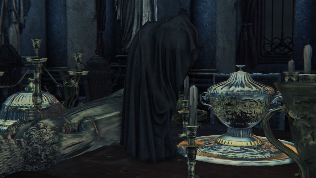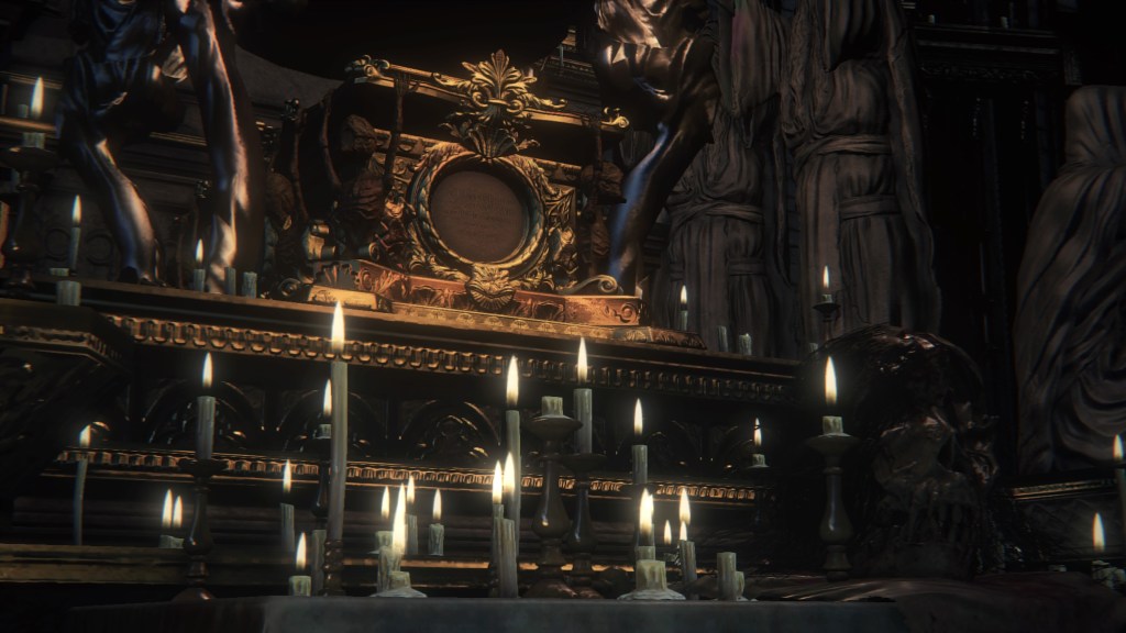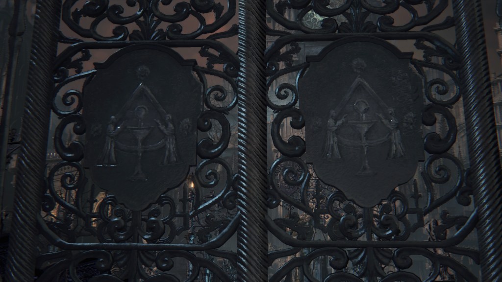 Once Mensis was preempted, the Healing Church could focus on the aftermath of the Old Yharnam Incident. The sliding coffin of the sick was sealed, only to be opened by staff working from the newly added back end of the Lower Church. Lamps held by the veiled afflicted were added around it while the wise men statues were replaced by ordinary candle stands. As the cut Lower Church Key confirms in its description, this is because the building was rededicated to honor the dead as much as block passage. That seal was a ceremonial burial to all the souls lost because of the disease in one sense or another — and mourners don’t visit to disturb the grave.
