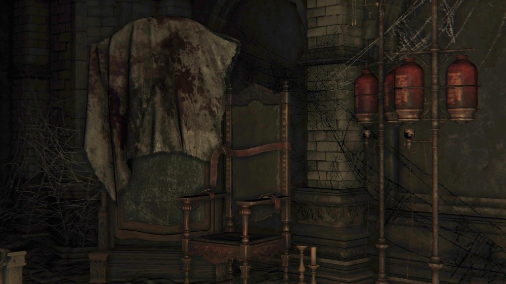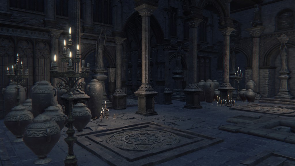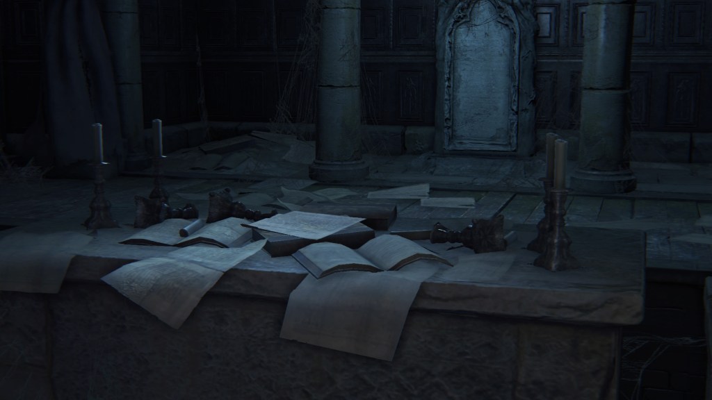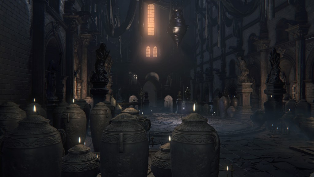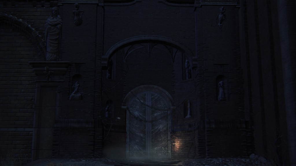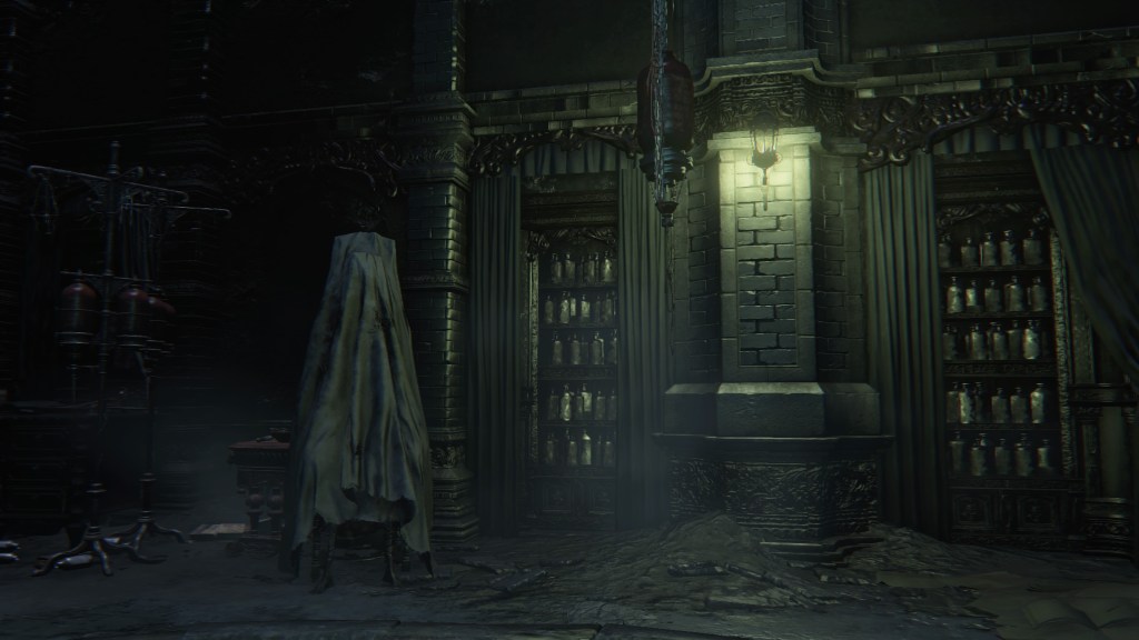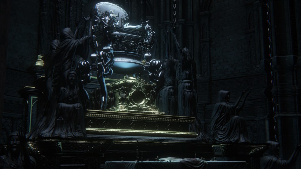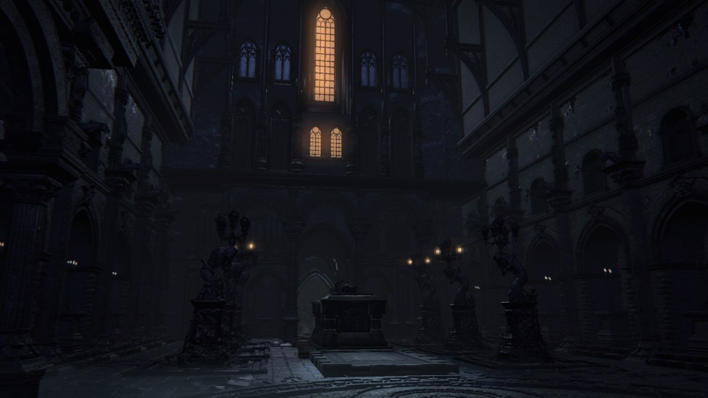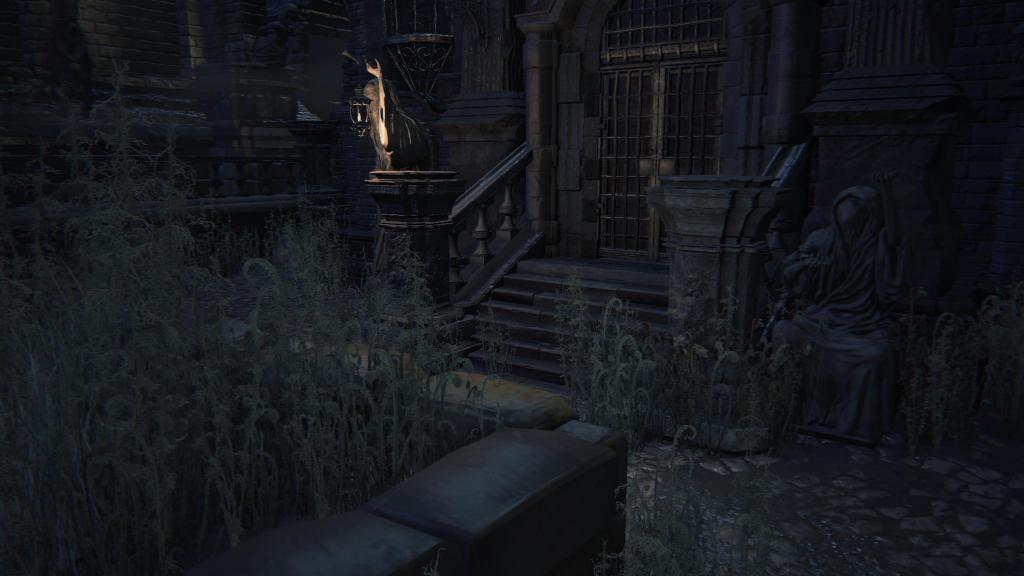 Once Mensis was preempted, the Healing Church could focus on the aftermath of the Old Yharnam Incident. The sliding coffin of the sick was sealed, only to be opened by staff working from the newly added back end of the Lower Church. Lamps held by the veiled afflicted were added around it while the wise men statues were replaced by ordinary candle stands. As the cut Lower Church Key confirms in its description, this is because the building was rededicated to honor the dead as much as block passage. That seal was a ceremonial burial to all the souls lost because of the disease in one sense or another — and mourners don’t visit to disturb the grave.