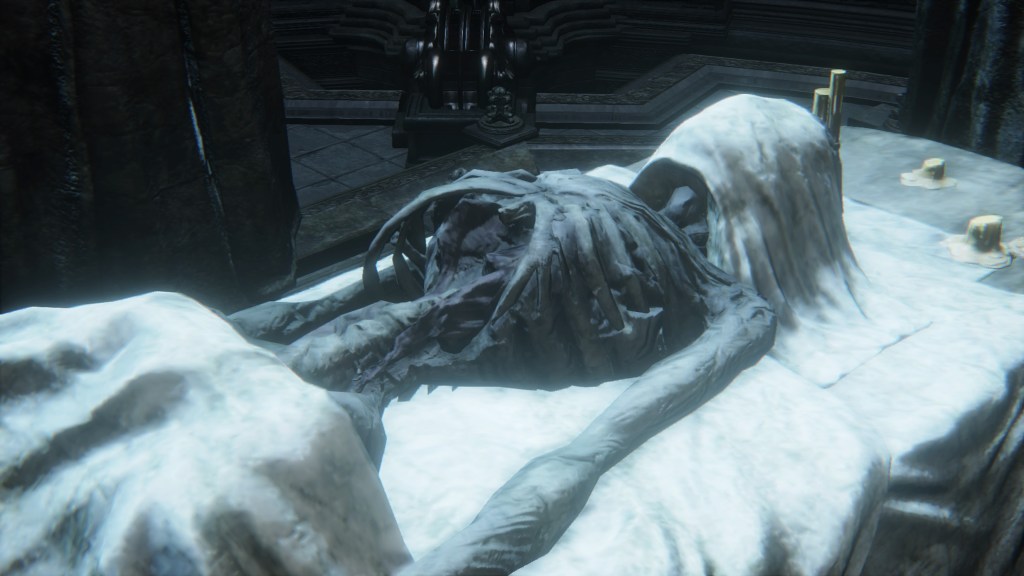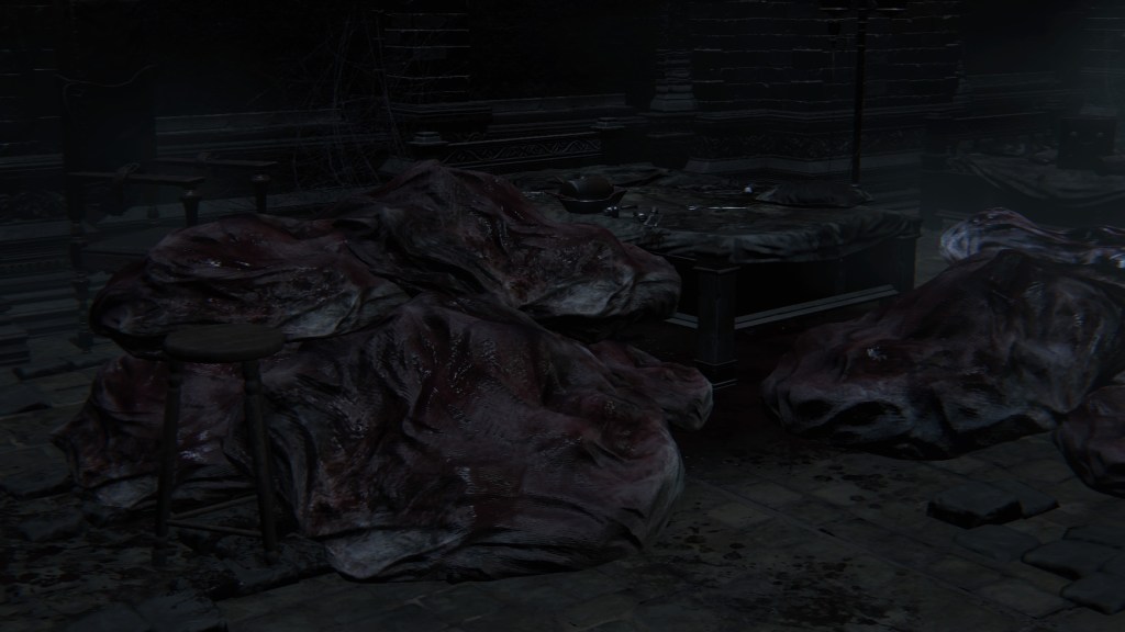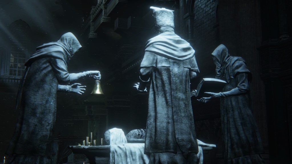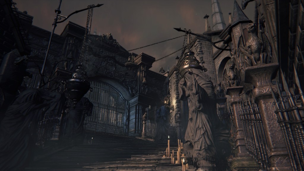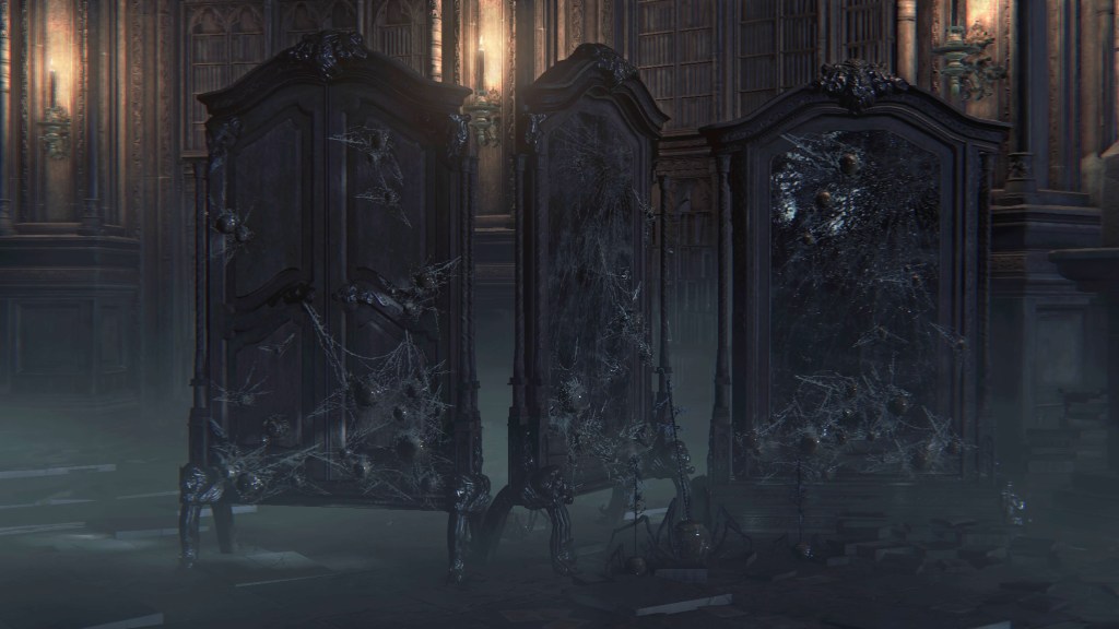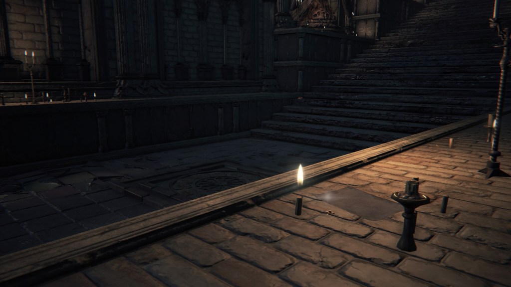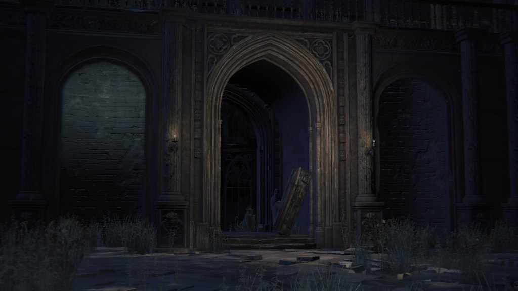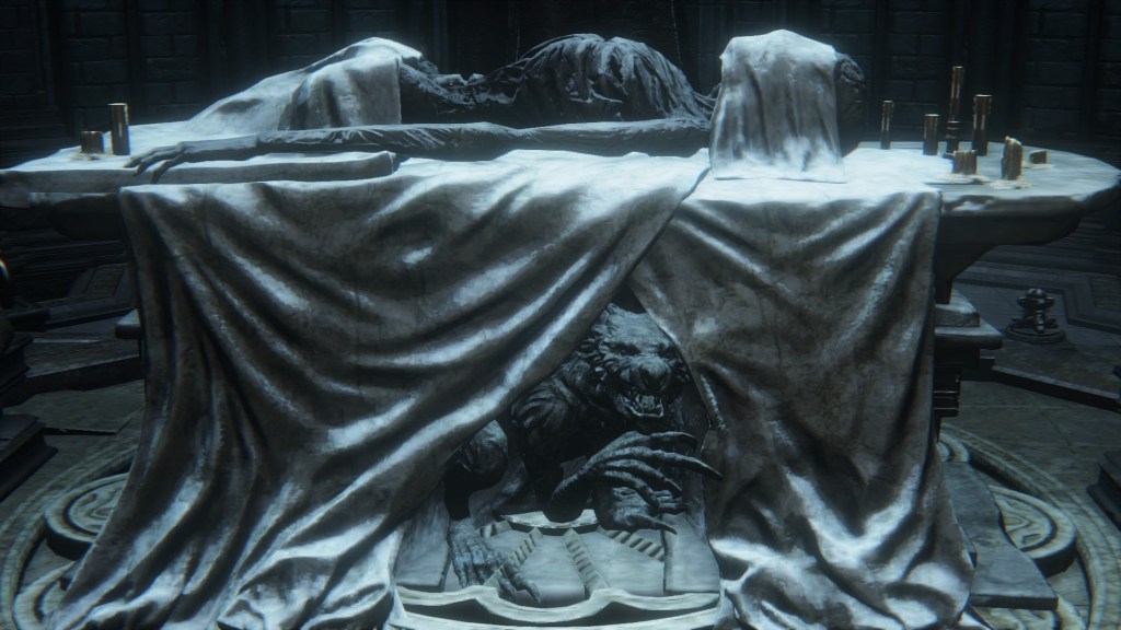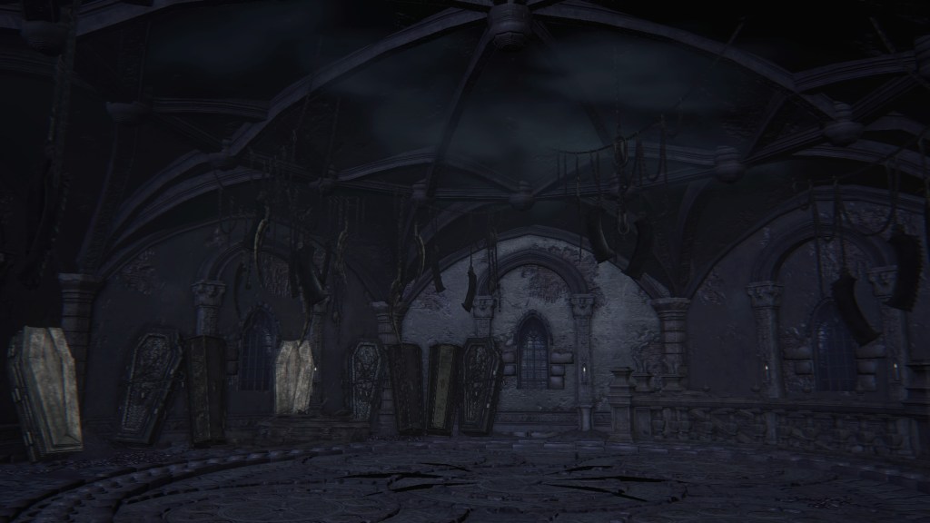 Once Mensis was preempted, the Healing Church could focus on the aftermath of the Old Yharnam Incident. The sliding coffin of the sick was sealed, only to be opened by staff working from the newly added back end of the Lower Church. Lamps held by the veiled afflicted were added around it while the wise men statues were replaced by ordinary candle stands. As the cut Lower Church Key confirms in its description, this is because the building was rededicated to honor the dead as much as block passage. That seal was a ceremonial burial to all the souls lost because of the disease in one sense or another — and mourners don’t visit to disturb the grave.