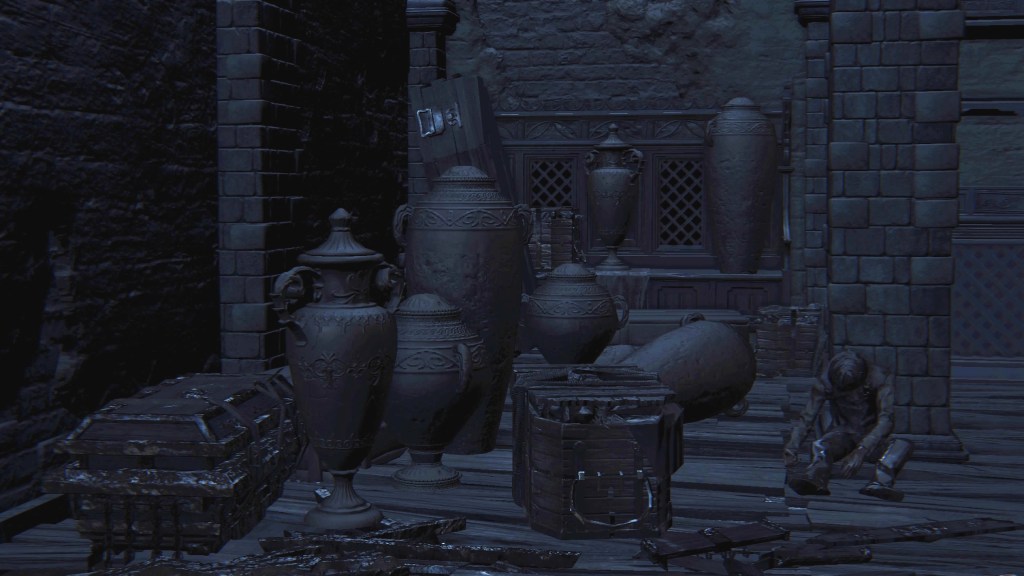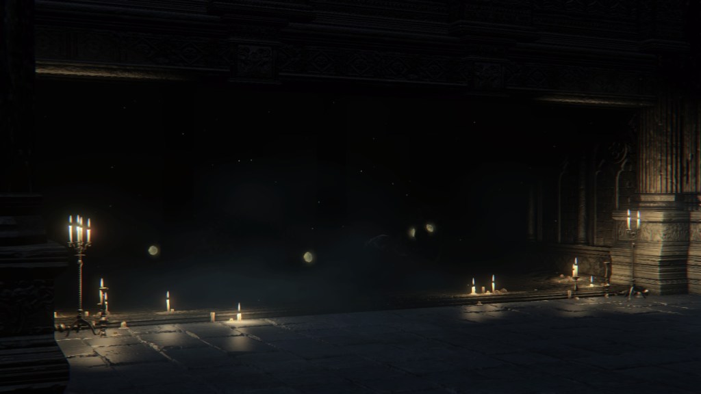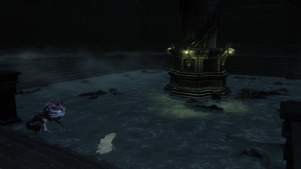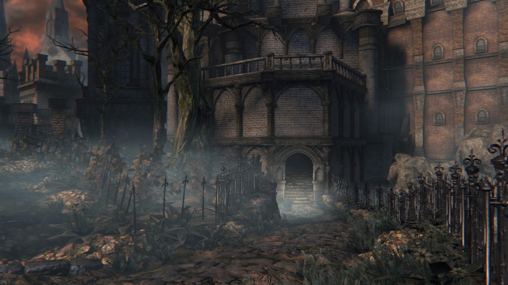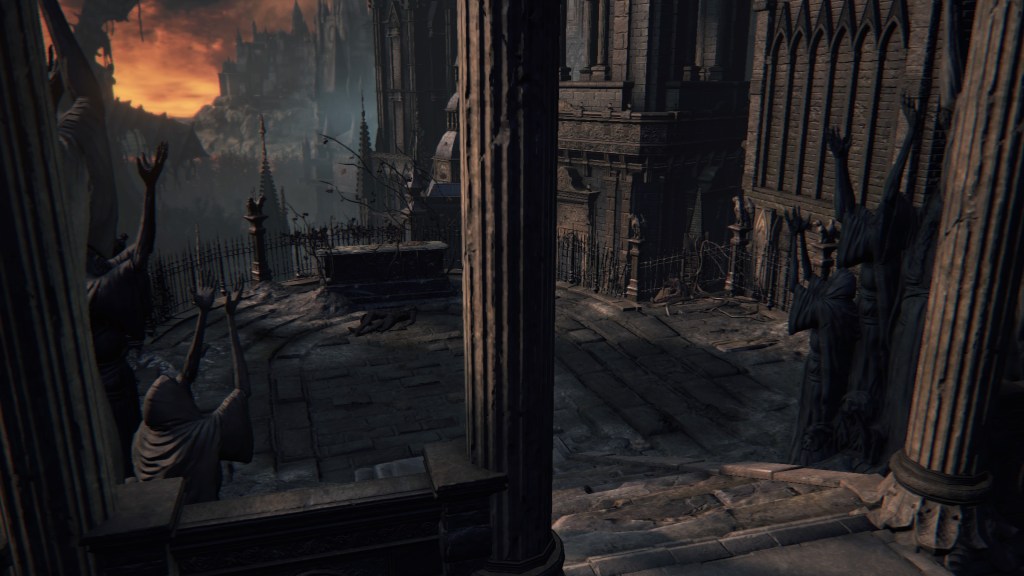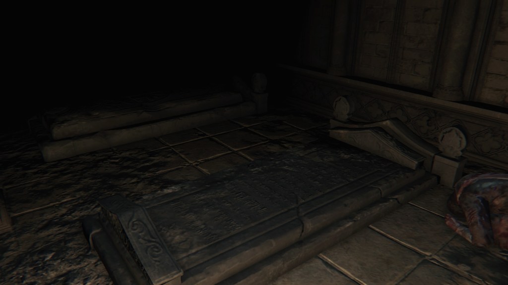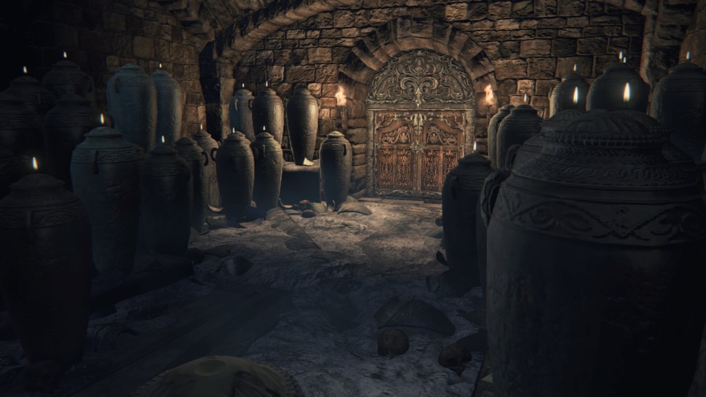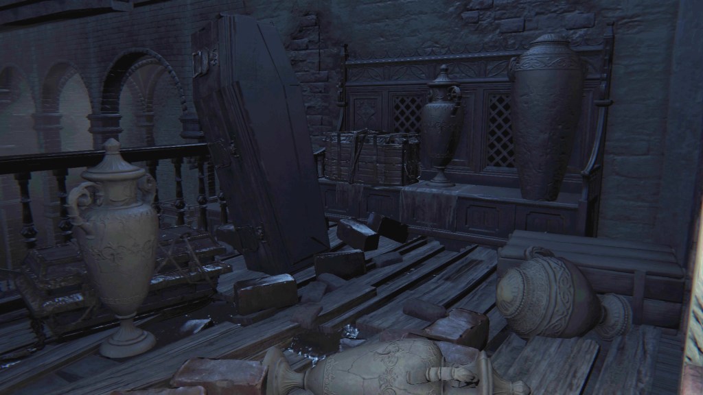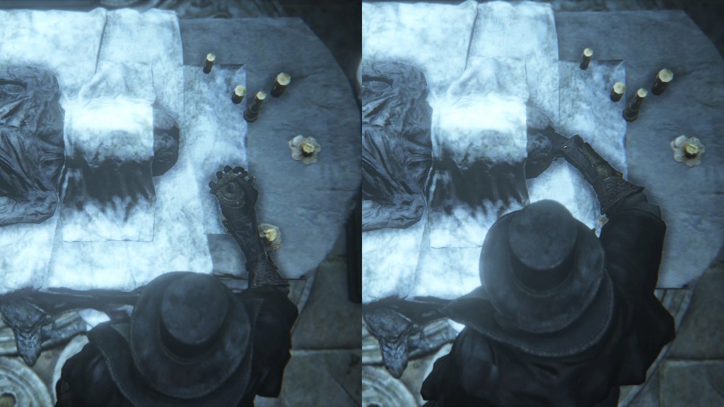 Once Mensis was preempted, the Healing Church could focus on the aftermath of the Old Yharnam Incident. The sliding coffin of the sick was sealed, only to be opened by staff working from the newly added back end of the Lower Church. Lamps held by the veiled afflicted were added around it while the wise men statues were replaced by ordinary candle stands. As the cut Lower Church Key confirms in its description, this is because the building was rededicated to honor the dead as much as block passage. That seal was a ceremonial burial to all the souls lost because of the disease in one sense or another — and mourners don’t visit to disturb the grave.