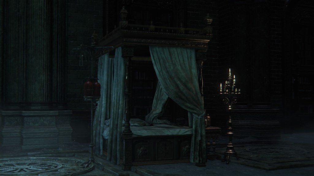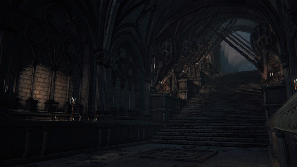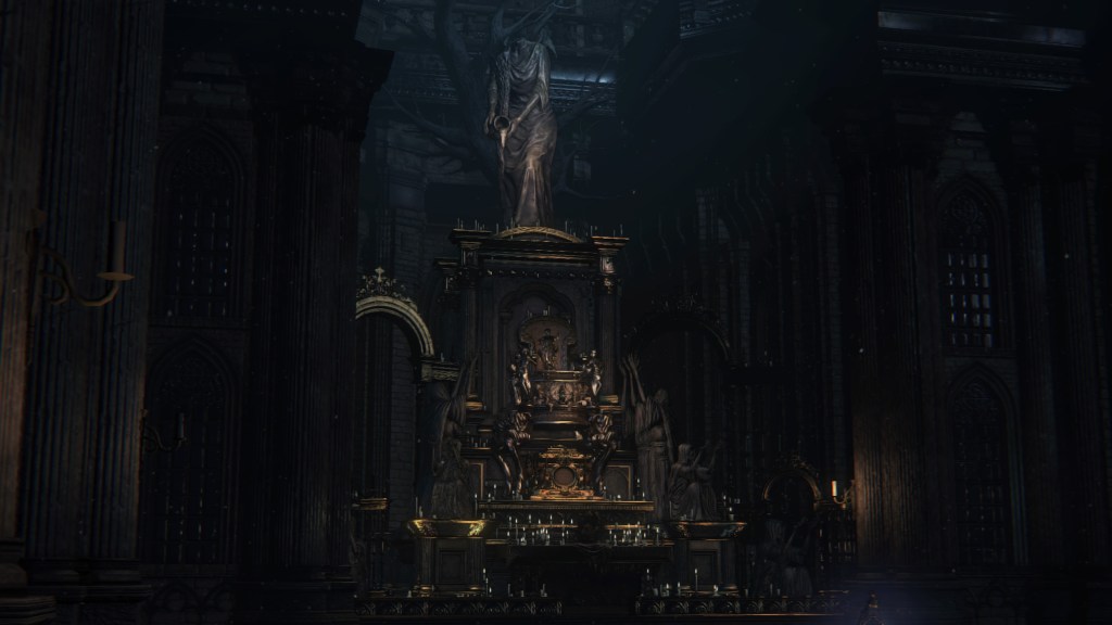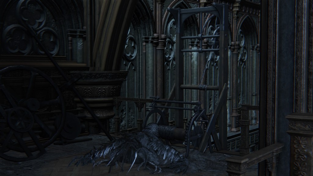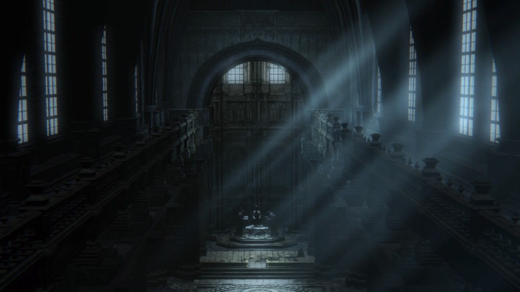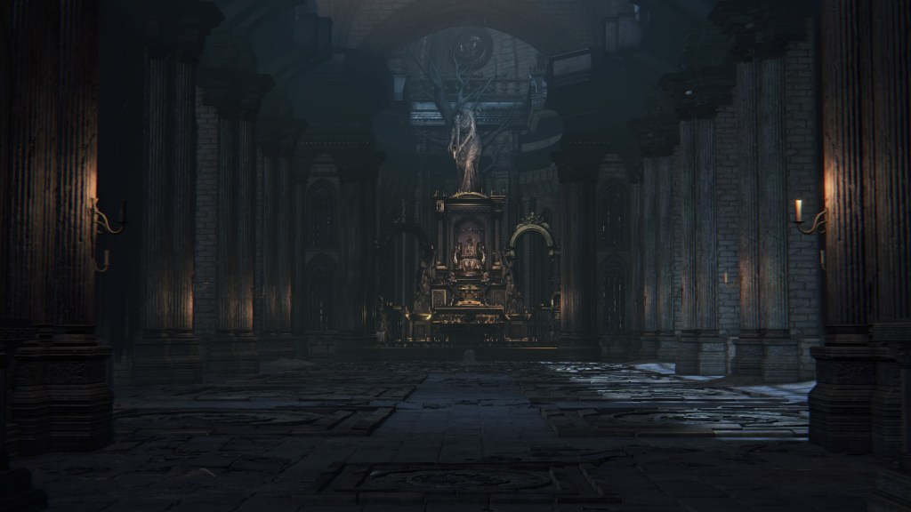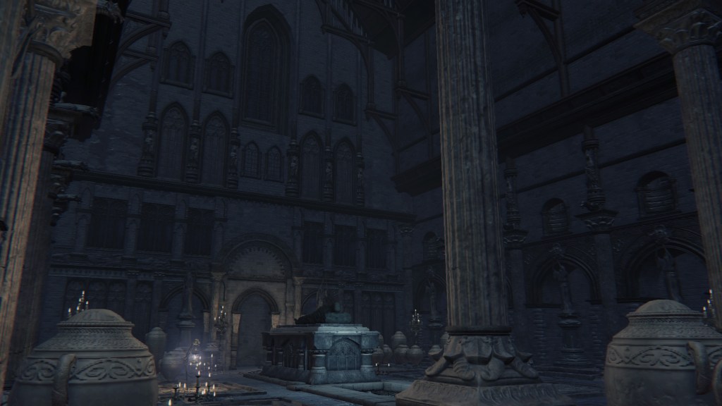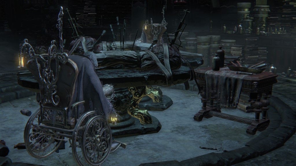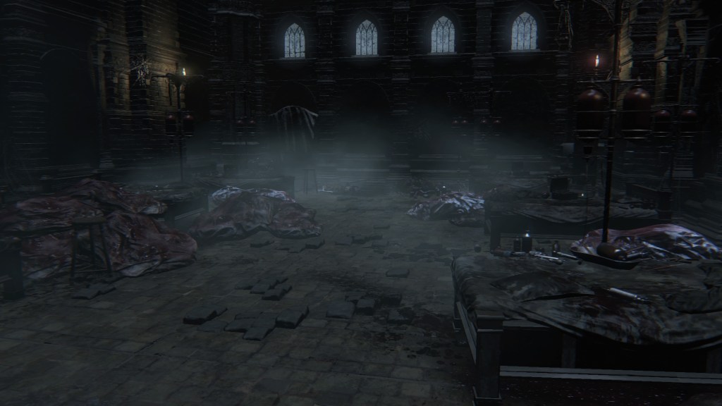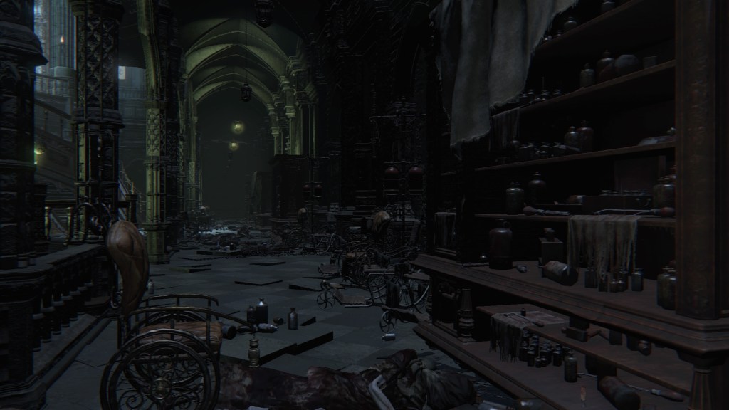 Perhaps that gap in the clergy and laity’s understanding of “bridging man with the divine” is why the second Grand Cathedral in the Hunter’s Nightmare lacks the front entrance. Rather than be open to a congregation, the nave is filled with fancy beds for patients and bookshelves for doctors’ easy reference. Add in the surgical and blood transfusion equipment, and the cathedral was being used as a hospital, ready to move patients with potential up to the inner sanctum where more extensive experimentation could be conducted; most of the beds are empty save for one, the corpse bearing Great One’s Wisdom. This more closed nature to the early Church is reflected in the altar enshrining the blood, which is part of the same lift system. Said altar only reveals itself when the special clerics have taken the platform up to the Research Hall — in other words, when the true nature of the Church’s “treatment” is hidden. This nave in the nightmare doesn’t show a formal entrance, but it is obvious that the building is mainly for its owners, not the faithful.