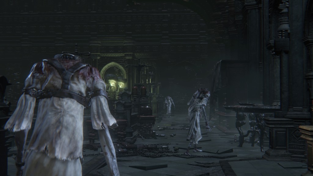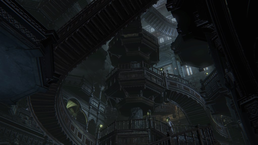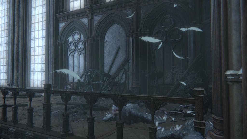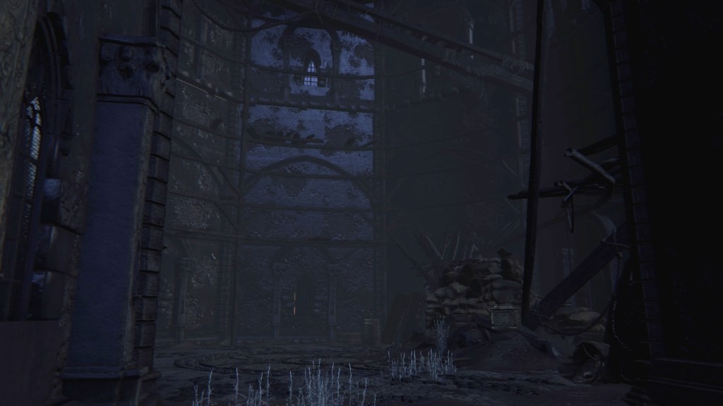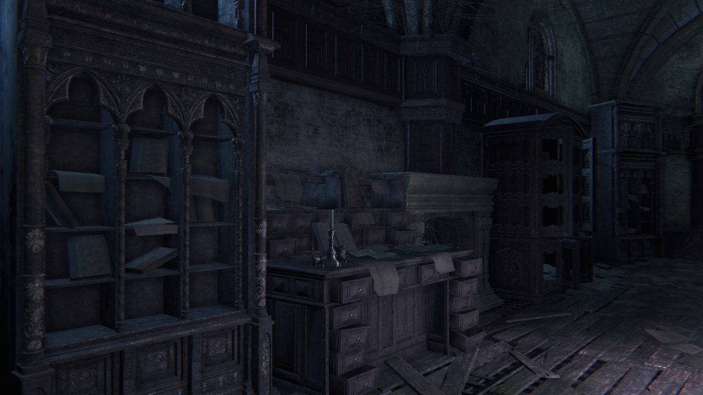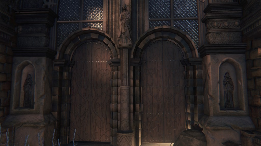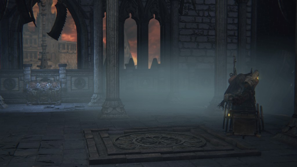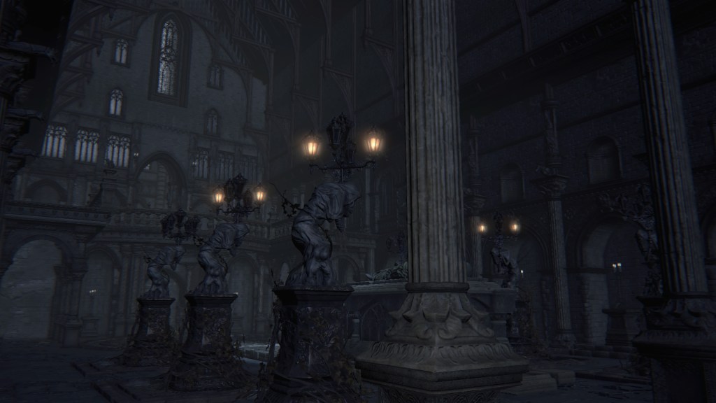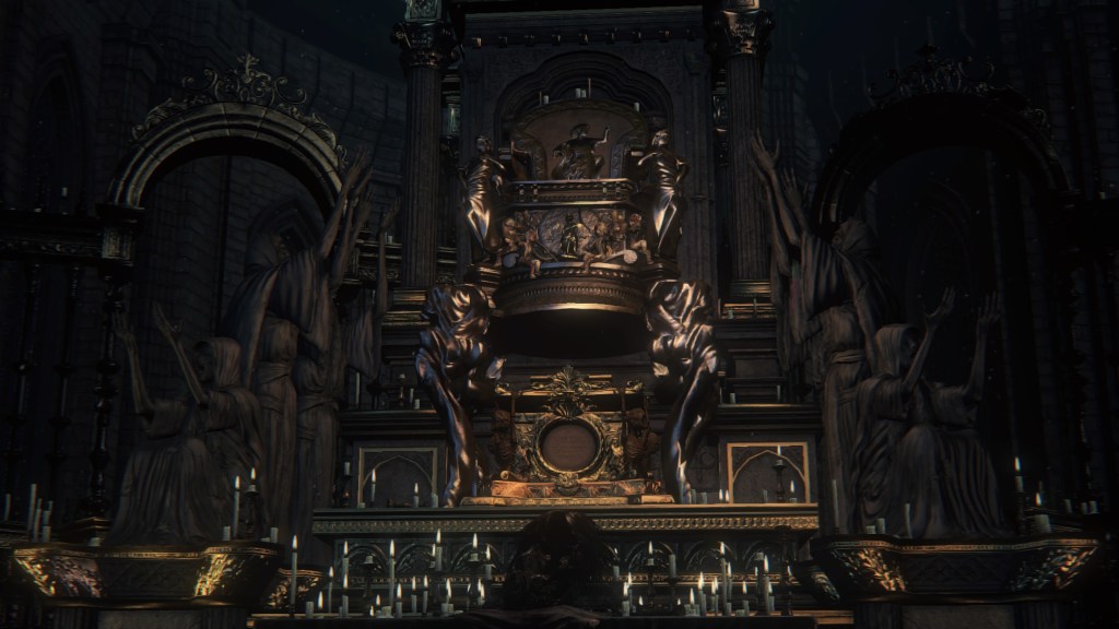 Perhaps that gap in the clergy and laity’s understanding of “bridging man with the divine” is why the second Grand Cathedral in the Hunter’s Nightmare lacks the front entrance. Rather than be open to a congregation, the nave is filled with fancy beds for patients and bookshelves for doctors’ easy reference. Add in the surgical and blood transfusion equipment, and the cathedral was being used as a hospital, ready to move patients with potential up to the inner sanctum where more extensive experimentation could be conducted; most of the beds are empty save for one, the corpse bearing Great One’s Wisdom. This more closed nature to the early Church is reflected in the altar enshrining the blood, which is part of the same lift system. Said altar only reveals itself when the special clerics have taken the platform up to the Research Hall — in other words, when the true nature of the Church’s “treatment” is hidden. This nave in the nightmare doesn’t show a formal entrance, but it is obvious that the building is mainly for its owners, not the faithful.