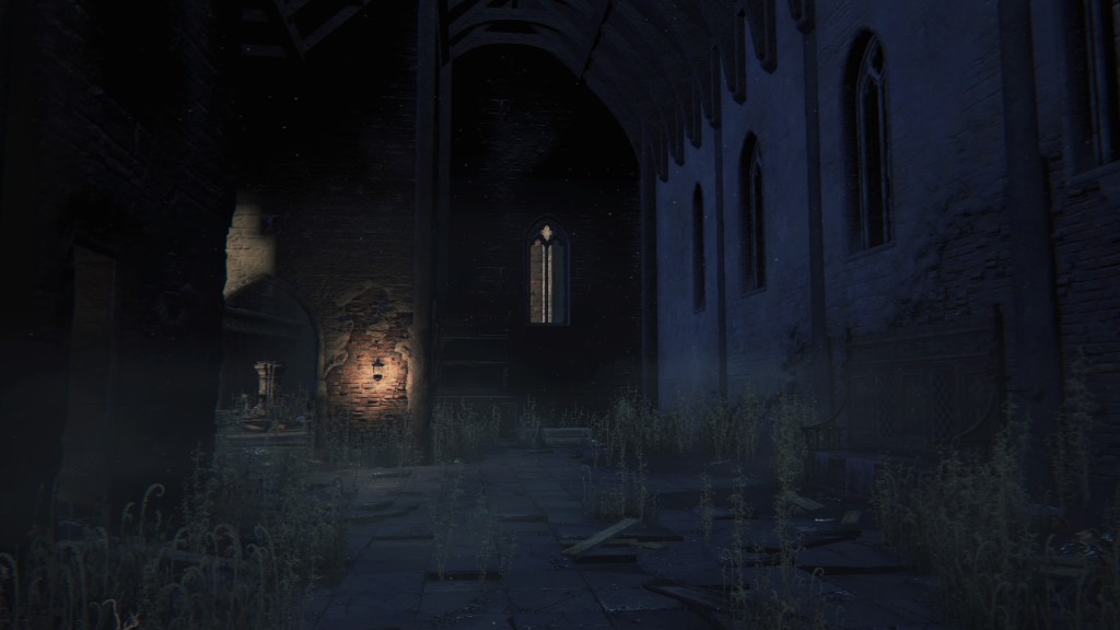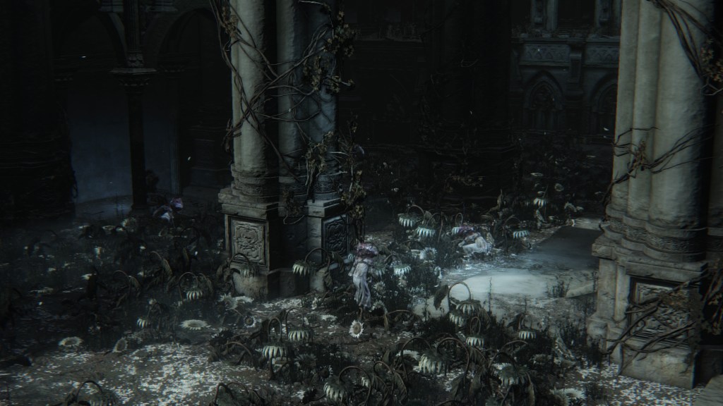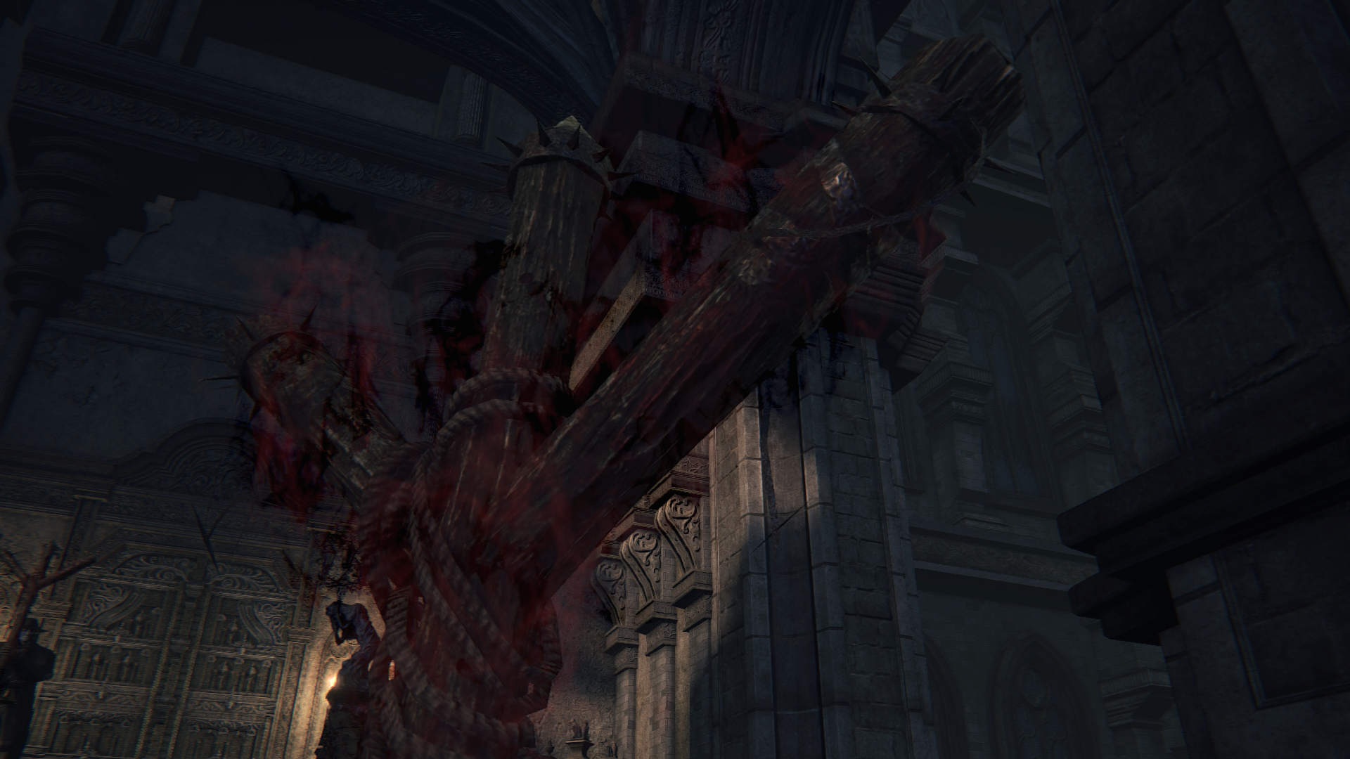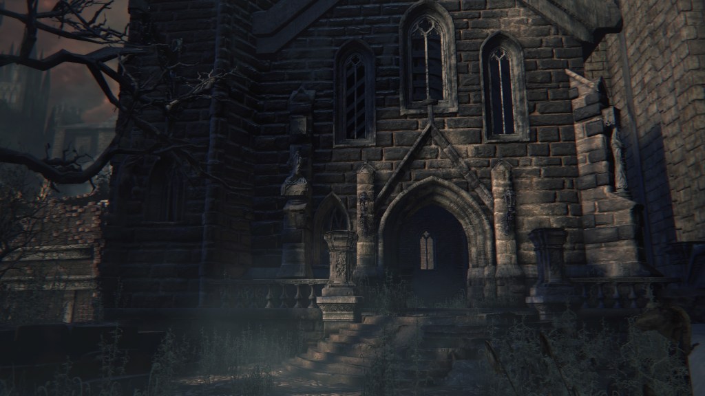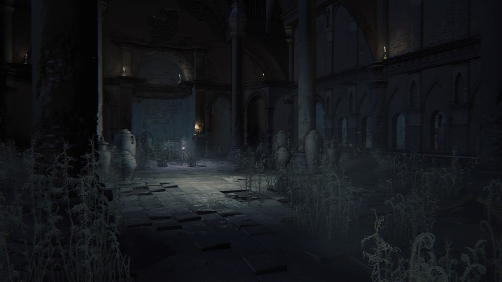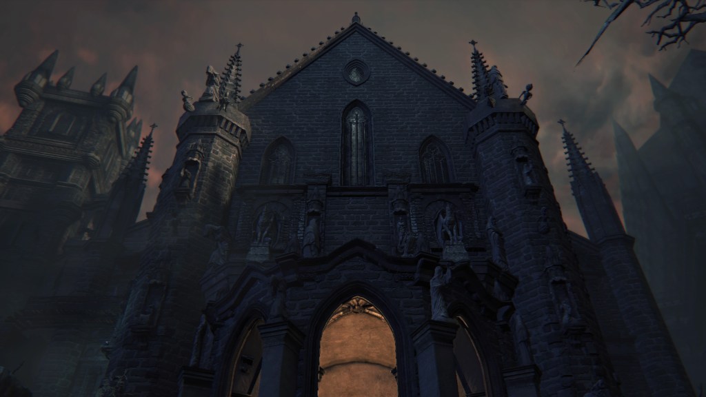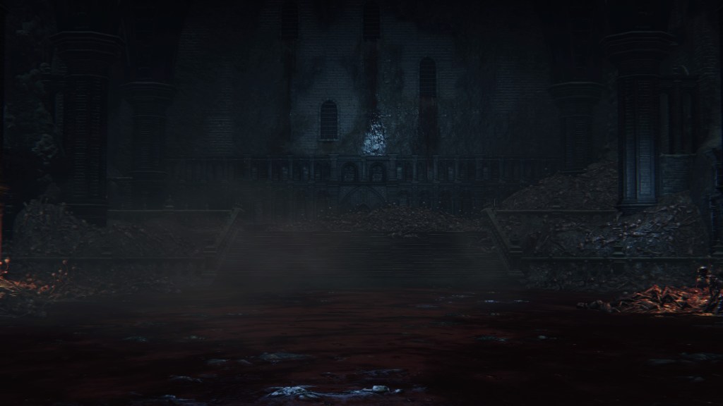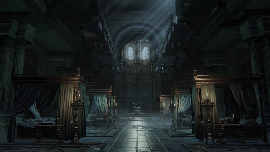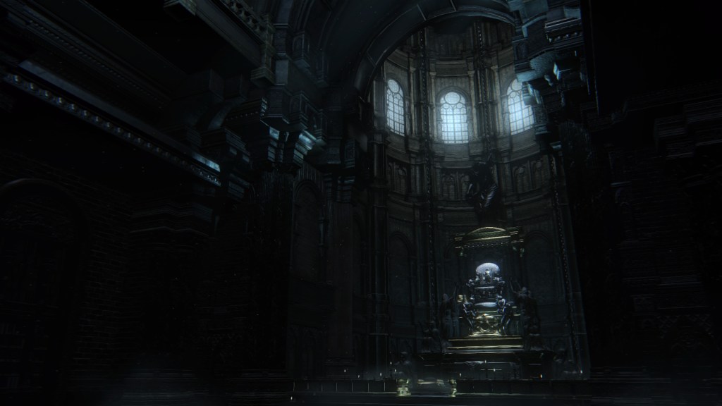 Perhaps that gap in the clergy and laity’s understanding of “bridging man with the divine” is why the second Grand Cathedral in the Hunter’s Nightmare lacks the front entrance. Rather than be open to a congregation, the nave is filled with fancy beds for patients and bookshelves for doctors’ easy reference. Add in the surgical and blood transfusion equipment, and the cathedral was being used as a hospital, ready to move patients with potential up to the inner sanctum where more extensive experimentation could be conducted; most of the beds are empty save for one, the corpse bearing Great One’s Wisdom. This more closed nature to the early Church is reflected in the altar enshrining the blood, which is part of the same lift system. Said altar only reveals itself when the special clerics have taken the platform up to the Research Hall — in other words, when the true nature of the Church’s “treatment” is hidden. This nave in the nightmare doesn’t show a formal entrance, but it is obvious that the building is mainly for its owners, not the faithful.