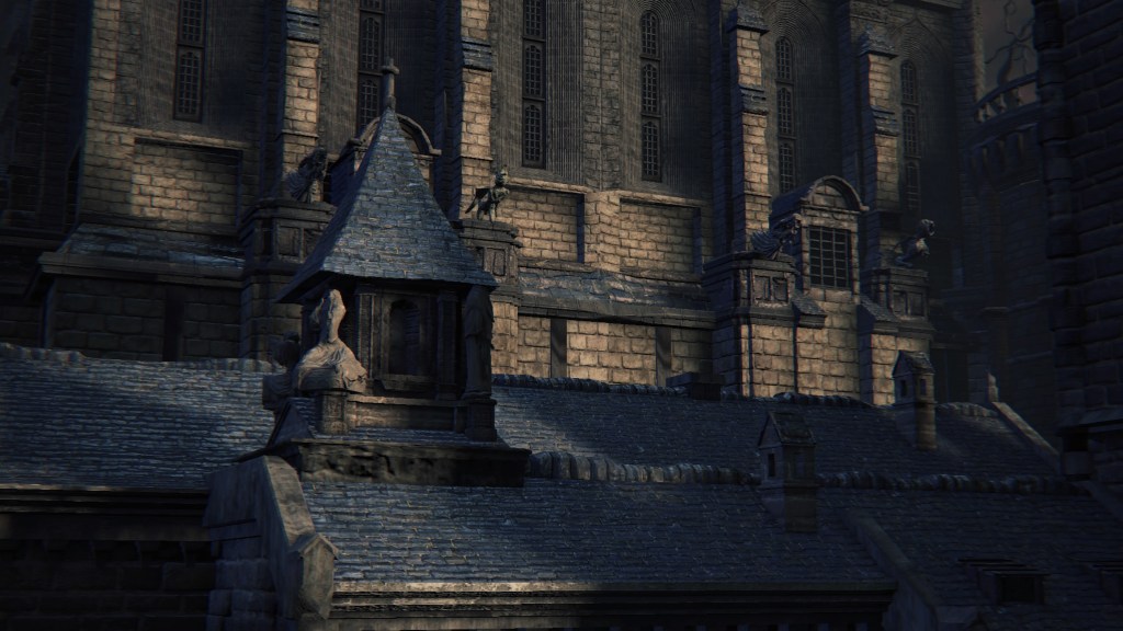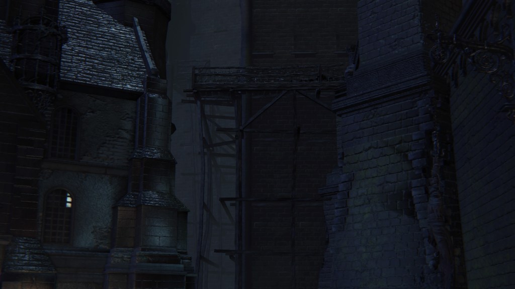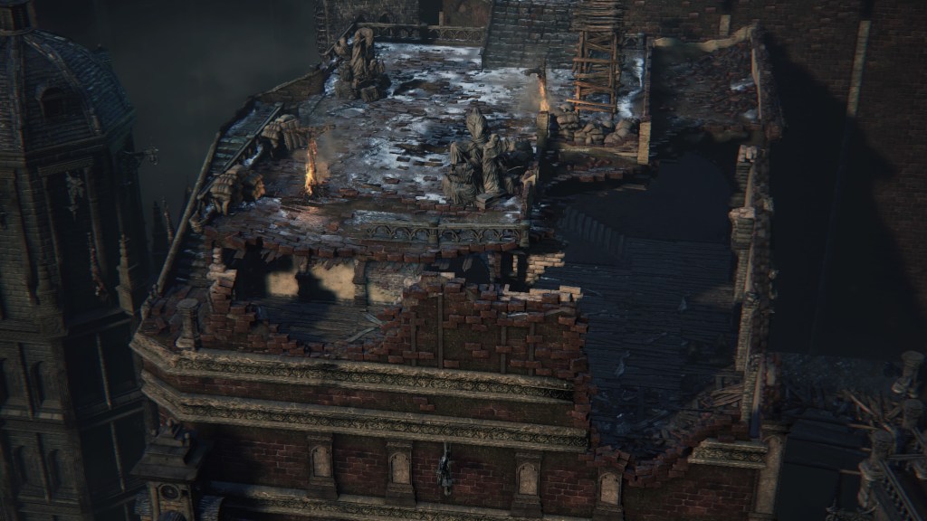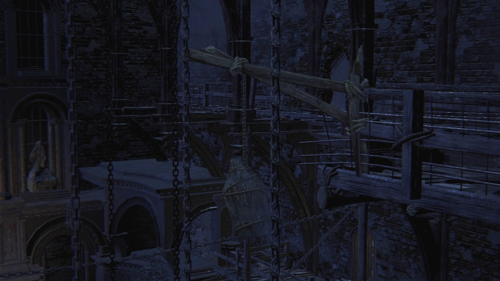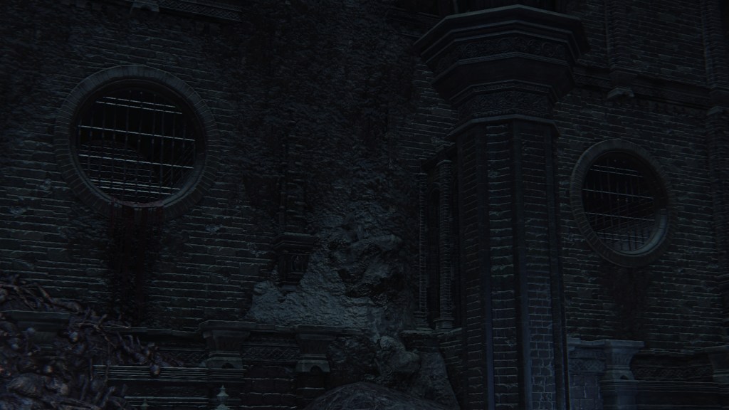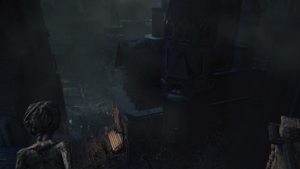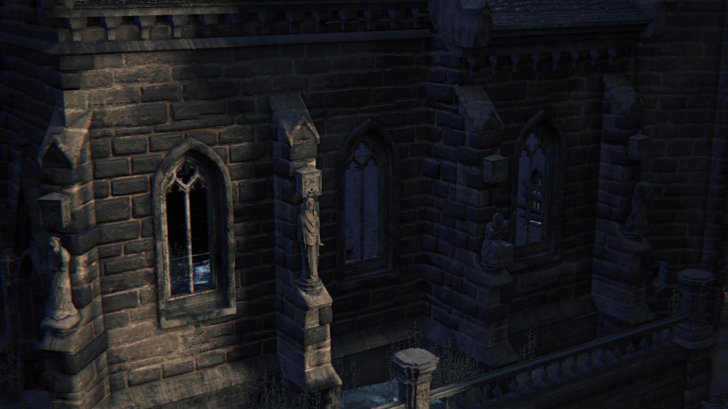 Finally, the district’s last major landmark is the Lower Church, named in a cut key’s description — appropriate considering it requires we descend stairs from Oedon Chapel to reach. Unlike the others, this small church seems to serve no purpose beyond facilitating entry to Old Yharnam, the architecture extending all the way down to atop the buildings in the valley below. Although it is possible for this church to be the last constructed in the Church Town, the fact that we can come across a smaller iteration in the Hunter’s Nightmare hints to it existing prior to the Old Yharnam Incident, wise men statues praising any coming up from the sliding coffin featuring a sick man. Clearly, the Lower Church originally honored the old city as the Healing Church’s starting point, a land of sickness bringing the sages to literal new heights. In practical terms, the building just regulated access to the city below, not to mention streamlining the trek up and down the valley. After descending some staircases, the edifices’ “bottom” floor leads out straight to the rooftops to cross in order to head further down into the city proper.