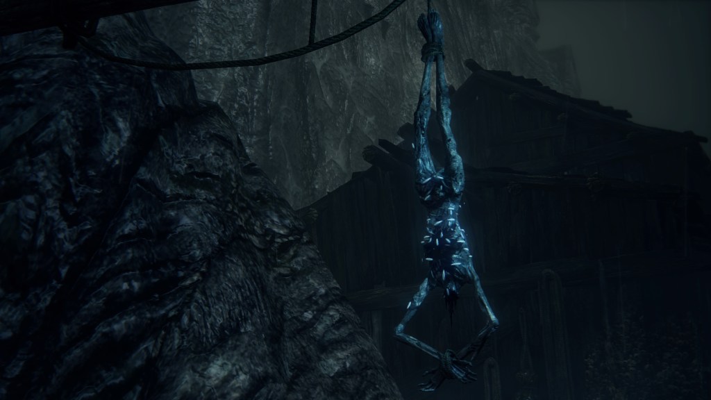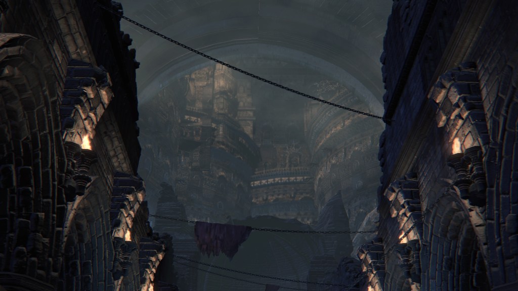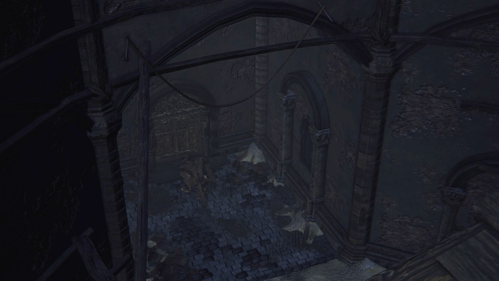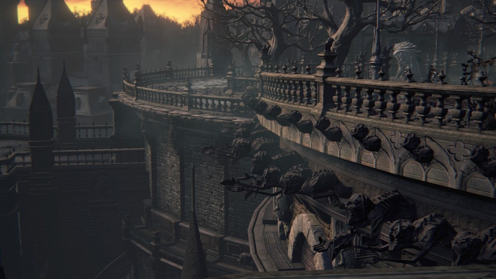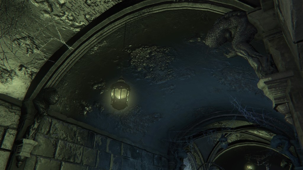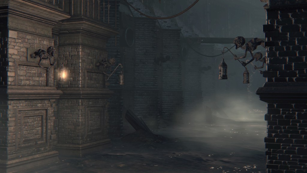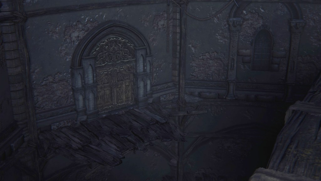 Finally, the district’s last major landmark is the Lower Church, named in a cut key’s description — appropriate considering it requires we descend stairs from Oedon Chapel to reach. Unlike the others, this small church seems to serve no purpose beyond facilitating entry to Old Yharnam, the architecture extending all the way down to atop the buildings in the valley below. Although it is possible for this church to be the last constructed in the Church Town, the fact that we can come across a smaller iteration in the Hunter’s Nightmare hints to it existing prior to the Old Yharnam Incident, wise men statues praising any coming up from the sliding coffin featuring a sick man. Clearly, the Lower Church originally honored the old city as the Healing Church’s starting point, a land of sickness bringing the sages to literal new heights. In practical terms, the building just regulated access to the city below, not to mention streamlining the trek up and down the valley. After descending some staircases, the edifices’ “bottom” floor leads out straight to the rooftops to cross in order to head further down into the city proper.
