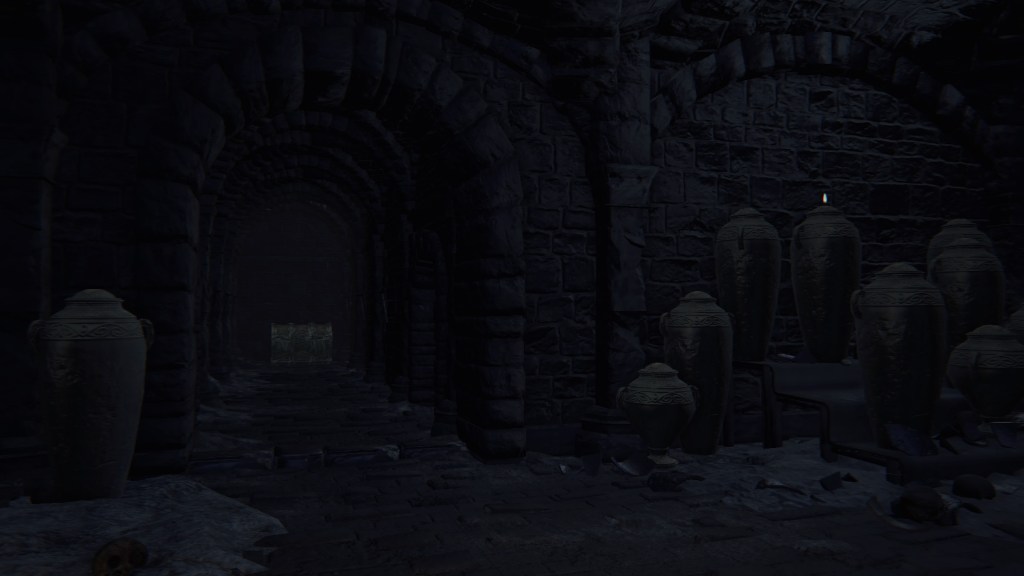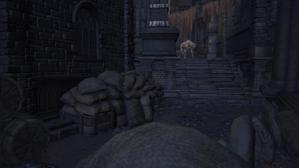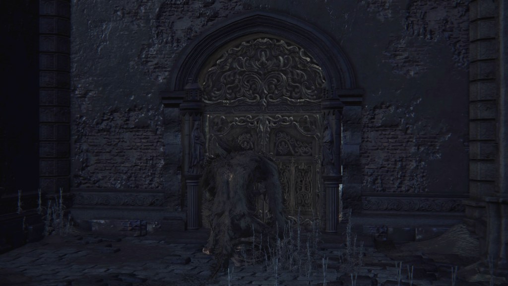 However, the top clerics’ chief concern was preventing another red moon from blindsiding them, which Rom helped accomplish. Afterward, they forbid entry to the woods where Rom and Byrgenwerth resided. Any who already knew the gatekeeper’s password were ordered to hold off on sharing or making use of it themselves. This includes to supply the gatekeeper with necessities, leading to his death — his corpse sits on rubble for the building, which has fallen into disrepair. The Church obviously knew what would result from ignoring the building, hence the coffin enshrined before the stairs to the gate; the least bit of ceremony they could afford Willem’s manservant. But until the threat from the School of Mensis had passed, that entire exit out of Cathedral Ward would be off-limits.