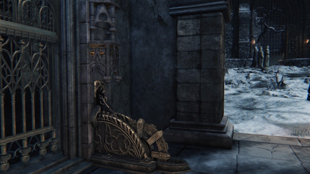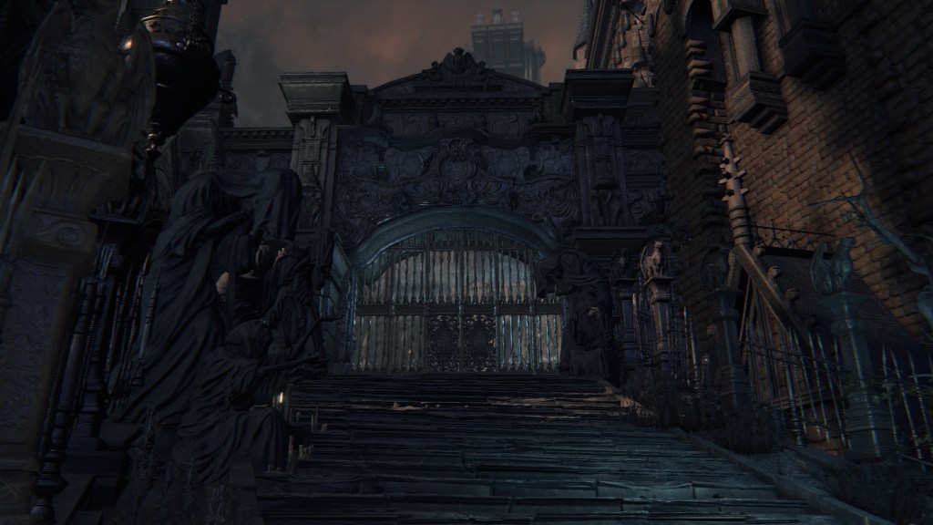 The plaza is the sole juncture for reaching Byrgenwerth’s gatekeeper, whom the Healing Church kept well accommodated. The man’s gate is part of a towering building identical to the church workshop, which might suggest that they were both built during the same period. In either case, it provided the lunatic with ample space to reside, though how much he used outside his place just behind the doors is an open question. The Church clearly showed deep respect for Willem’s emissary, which is further reflected in the lead-up to the building. Before descending the staircase curving around to the gate, one must pass through a fancy chamber in the Healing Church’s typical style, statues of wise men in praise flanking the sides. All of this presents the scholars from Byrgenwerth as deeply reverential toward their teacher’s representative, to approach the gatekeeper and request passage to the clergy’s origin having an air of consequence unlike anywhere else in Cathedral Ward. This was hallowed ground meriting a reminder of the maxim required to pass through the gates.