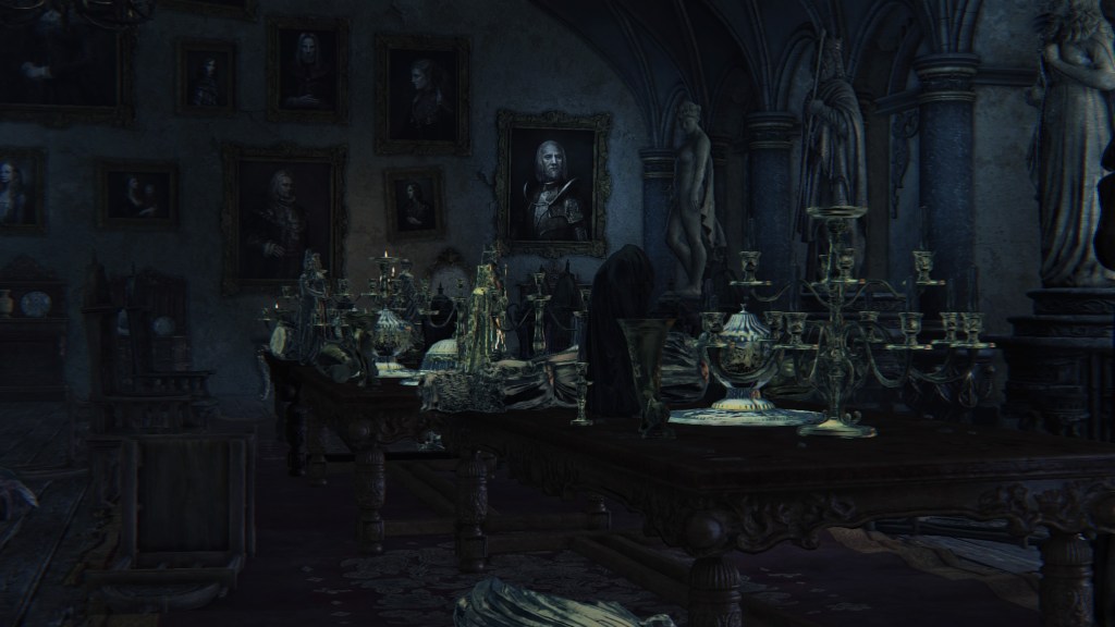 In all likelihood, the portrait depicts Laurence. According to Alfred, at least one traitor from Byrgenwerth brought the forbidden blood to the castle. This requires, at minimum, that the most prominent among the group approached the nobles. And this person would be their leader, Laurence — who better to send as emissary to the noble clan, especially an audience with their queen, than the first Vicar? The man was unlikely to have gone alone, of course. One of Queen Annalise’s relations became an apprentice to Gehrman, implicating him as another guest of the castle. And factoring their close relationship since betraying Willem, this contact between the clan and Yharnam’s first hunter most likely coincided with Laurence’s own stay. And not just him, but the other former students as well. The castle dining tables are littered with statuettes of the queen and the same multi-eye horrors seen in Upper Cathedral Ward. Together, they indicate a similar intermixing of the aristocratic and scholarly elite. Both Laurence and kith and Annalise and kin made merry in Cainhurst’s lavish banquets.