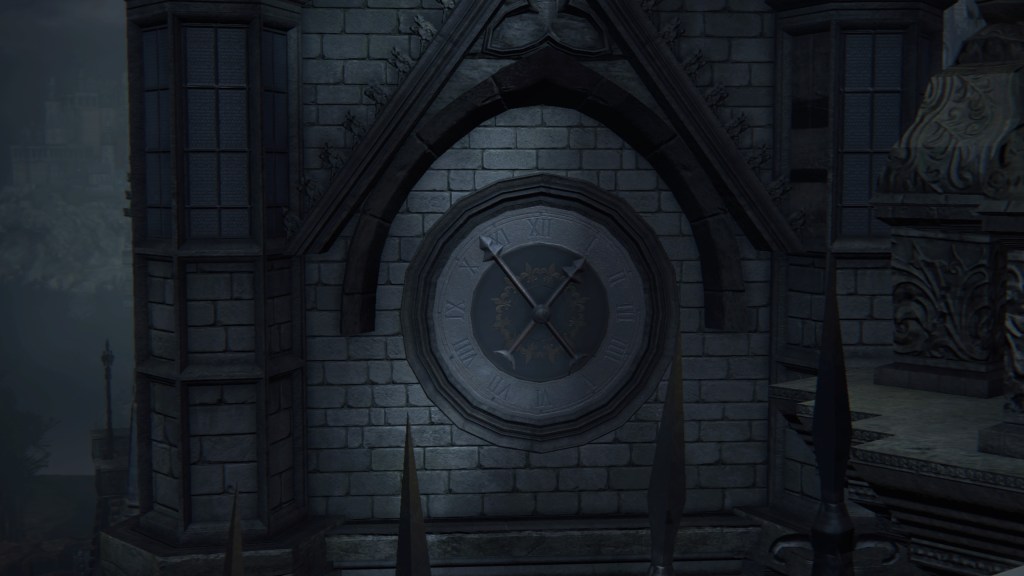 Adjoining the church is a peculiar clocktower. The clock face brings the astronomical clock in Prague to mind, which proves appropriate. We can see a larger such tower front and center above the Grand Cathedral, a more traditional one looming even taller behind it. Why build two when just the one could tell the time for anyone in town? Yharnam already has no shortage of clocktowers. Unless, the tower isn’t for telling time, and maybe isn’t even for the same audience. The irregular clock faces don’t bear obvious numbers or hands, after all. Perhaps the tower’s message isn’t supposed to reach those below but above. We learn the Make Contact gesture from a corpse facing the cathedral tower, our arms acting like clock hands moving along the dial. Considering that we can use this gesture to communicate with Great Ones, the clocktower might serve the same function. The clock hands pointing to runes on the backside of the face cement the notion, as does the “stargazing disc” (星見盤) which uses a replica “stargazing clock” (星見時計) for “observation” and operation.