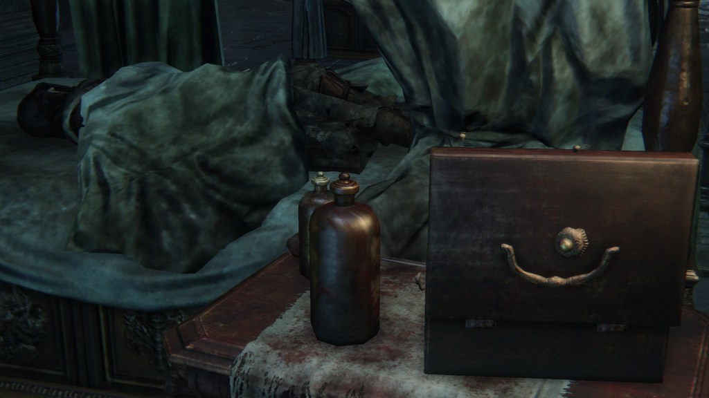 Despite the initial outbreak dealt with by Ludwig, it wasn’t as if hunters would stop using blood vials in the field, unwittingly spreading the beast scourge further in the process. This was only helped along by the Healing Church. In the Hunter’s Nightmare, we can come across a hunter’s corpse in “Yharnam” with beast blood pellets, followed soon after by a beastified old hunter wielding darkbeast claws. Some hunters were beginning to utilize the beasts for more power, becoming beasts themselves in the process. The Church instituted bans on making use of a beast’s blood or any part, ingested or otherwise, but this was hypocrisy since the ministers controlled distribution. By this point, the wheelchair researchers had already been providing one lab patient many of the forbidden pills from the Chalice Dungeons before the bloathead’s death. And if they wanted to keep the pill’s history unknown, they just had to traffic it on the black market. Accelerated transformation means accelerated studies, after all, and Gehrman’s hunters were desperate to compete.