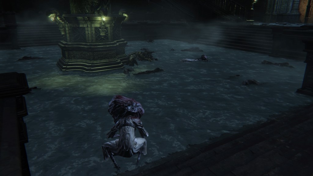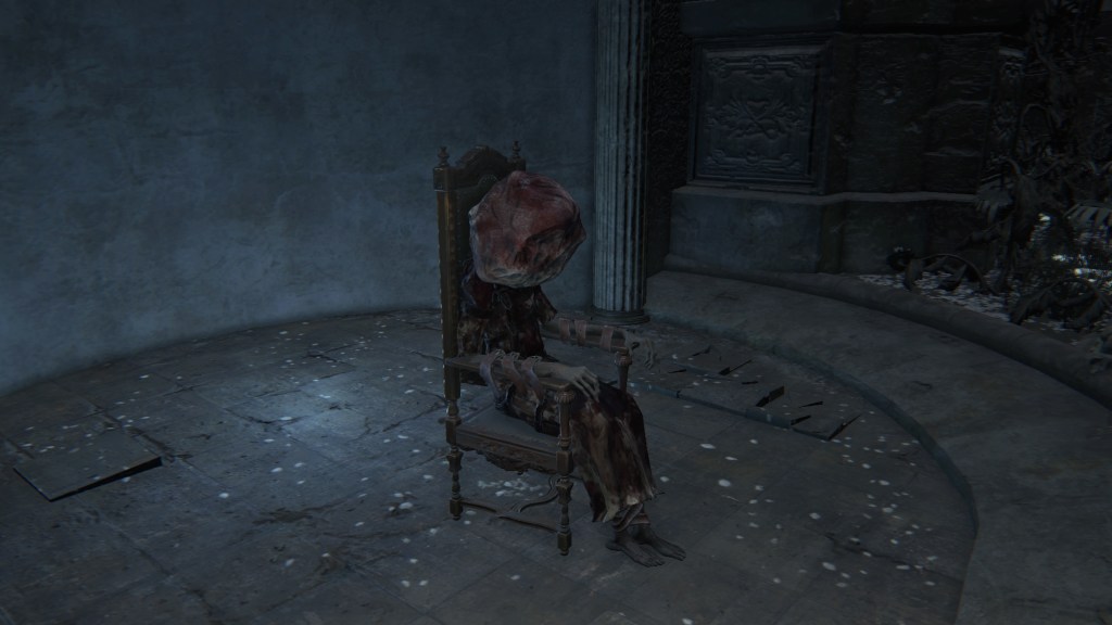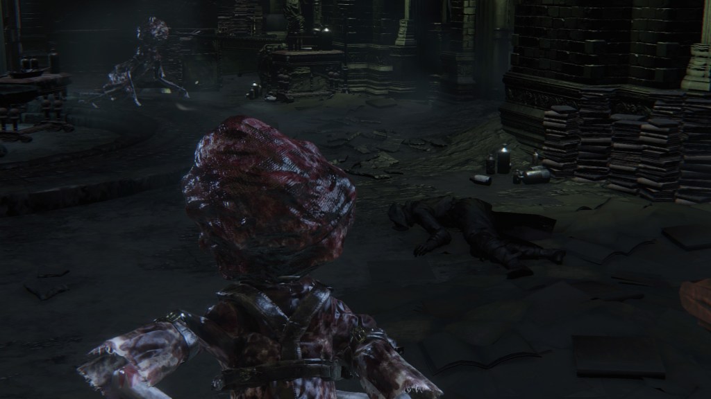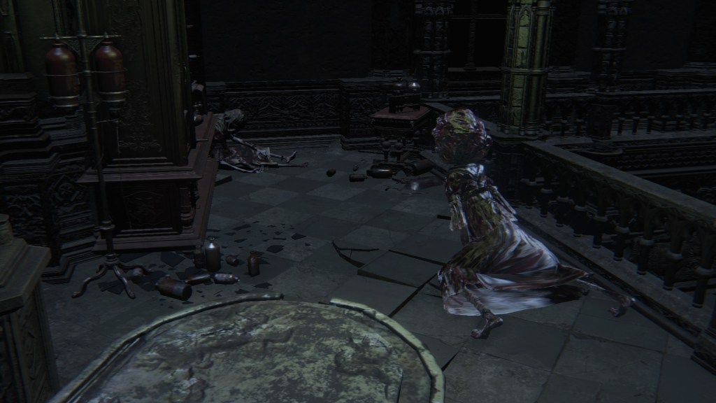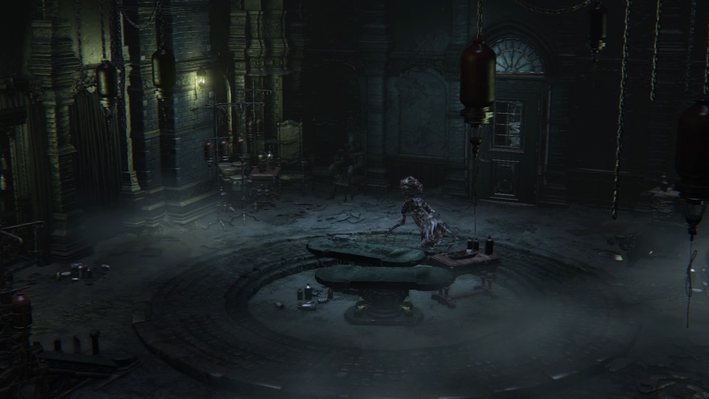 Future prospects look to have fared no better. The patients rove the building in a state of anarchy. Some slam about their blood transfusion stands, some throw around acidic chemicals, some strip down to the nude; none are friendly. One of the corpses which apparently falls into the sunken foyer after we adjust the staircase carries a lethal damp bloodgem, evoking the “struggle to the death” (死闘) amongst themselves as well as anyone else. What few aren’t hostile are rarely still lucid. Two of their corpses carry madman’s knowledge or frenzied coldblood. Evidently, most of the patients did, in fact, drown in the cosmic sea they were tossed into. The researchers tried to keep this under control — one of the dead bloatheads possess sedatives carried by the wheelchair staff, and a black church hunter lurking in the area harbors many more. But in the end, there were simply too many to medicate, and the experimenters have since resorted to cruder methods, one maniacally mowing down patients with his gatling gun. The Researcher Hall was reduced to a madhouse.