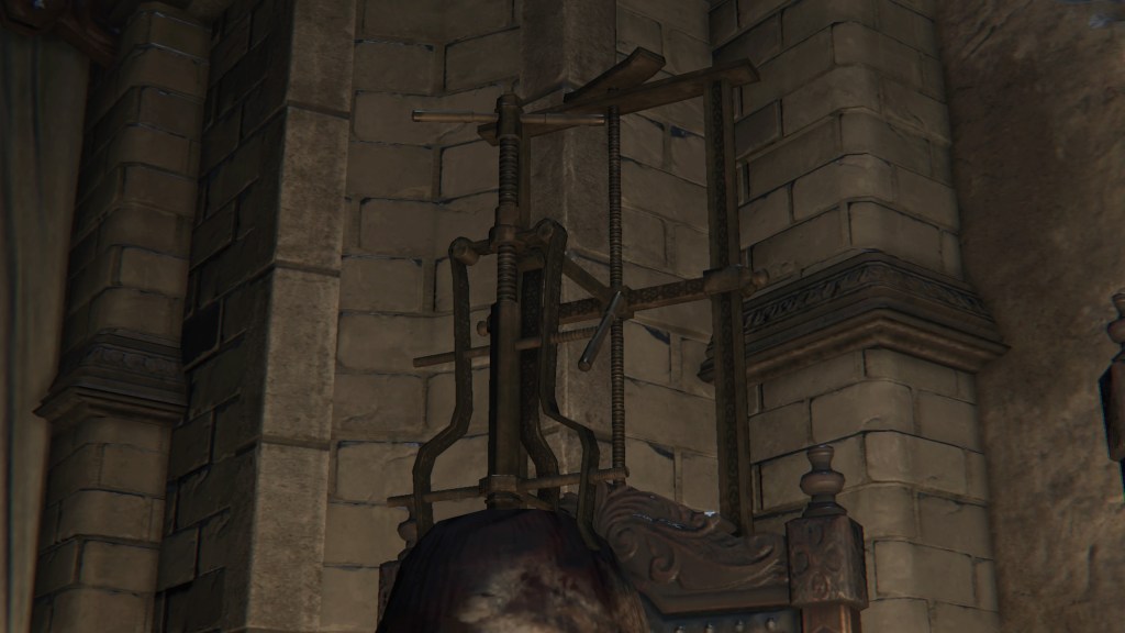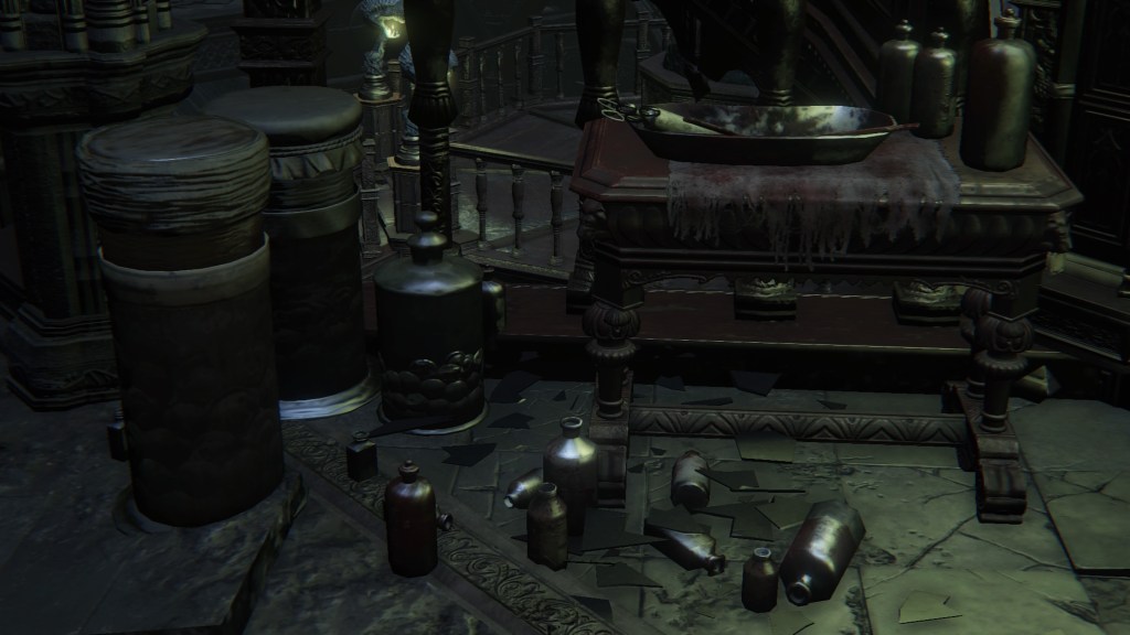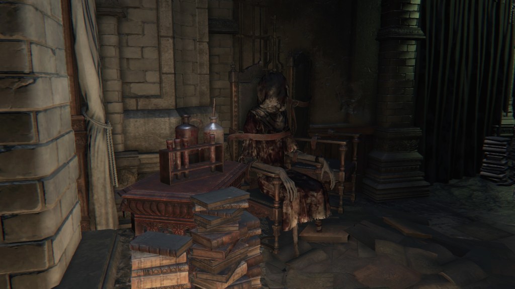The chief outcome of these negotiations appears to be a trade in knowledge. Despite the formula for numbing mist allegedly only being circulated in Cainhurst, it is the Cathedral Ward which harbors by far the majority of it above ground. With so many corpses carrying the stuff, Cainhurst must have shared the recipe with Laurence and associates. We also find a lift up to the library in the castle courtyard, which is odd when guests would typically be driven up to the front doors and led through the main foyer — why give any visitor ready access to the clan’s private records? But, in the context of an alliance between the Healing Church and Cainhurst, the lift allows the church fathers to more easily reference the clan’s eons of wisdom, some which the descendants would have even forgotten buried in the forest of books. And so, it was probably installed for that purpose, the Queen permitting the scholars a trove of reading material to research. Access to writings of a clan tracing back to Pthumerian civilization was no doubt enlightening for their research. And Cainhurst saw value in that as well.