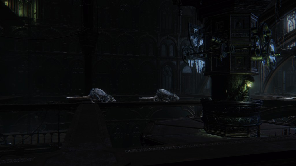 The Research Hall was outfitted with the same equipment as the Grand Cathedral and much more. Aside from the various vials of chemicals in and out of cabinets, every medicine made available from the bath messengers with church badges can be looted there. The five floors are navigated from elevators in the laboratory wing or the branching stairwell in the atrium moved via a mechanism operated from the rafters beneath the clock bells. Blood tanks hang from ceilings, reference books pile on desks, eye vats amass in corners. Chains and locks litter floors to tie patients down to their much less comfortable beds and chairs should treatment cause a violent reaction. And if they die, no matter. Like with Oedon Chapel, the corpses in the cathedral’s custody were buried closed by. Rats lurking among the graves below or the Hall’s rafters above possess poison knives, indicating that both scavengers had been nibbling on surgery subjects; their glowing green eyes betray the arcane nature of the surgeries, as does the body prostrated toward the graves. Burial for later study was the end result of the patients’ faith.