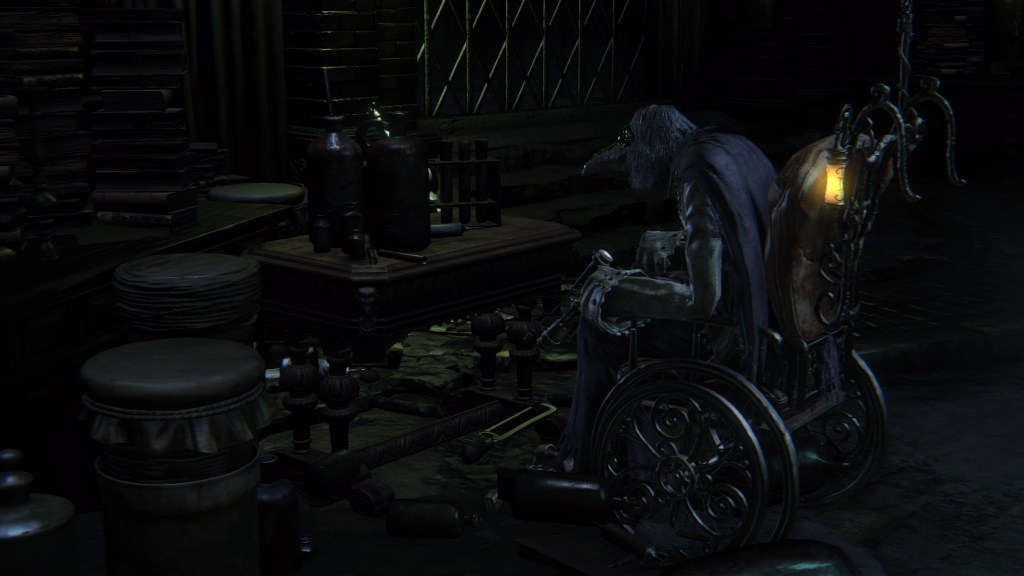 The blood ministers certainly didn’t want Yharnam overrun before their experiments achieved results, so they decided to shore up the hunters with their own funding, drastically expanding operations. As part of this patronage, a new workshop was built next to the old — the tower begins at the base of Cathedral Ward, but a passage still connects the two workshops at the mid-level. This setup hints that the new workshop was treated more like an expansion to Gehrman’s existing operations, and we do see various old shop weapons hanging from the rafters of the uppermost levels. However, Gehrman’s dialogue leaves no doubt that it was the blood ministers’ own facility, so these weapons are likely just representative of the “hunter” armaments being mass-produced. Whatever crossover the two workshops did have, their production would undoubtedly favor their respective masters, and gatekeeping access to the old meant that most would simply be joining the new, as confirmed by cut dialogue for Izzy. Basically, Gehrman lost autonomy, but a new generation supplemented his hunters with additional manpower.
