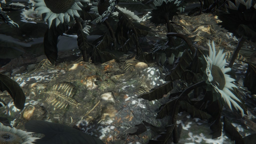 Opening way to the bridge to the Astral Clocktower, we enter a lumenflower garden, specifically a “star flower tree garden” (星輪樹の庭) due to the especially large blooms coalescing into a singular wood at the center. Close inspection of the soil these flowers sprout from reveals human bones half-buried. And then there are the Living Failures. Upon our entry, a bare blue humanoid with deformed head stops exalting the lumenwood to attack with arcane powers, soon joined by others rising from the earth. This coincides with Adeline receiving the Milkweed rune after slurping up the brain fluid which manifested in other patients. Therefore, the most successful subjects were being buried behind the Astral Clocktower to facilitate communication with the Great Ones. The flowers are proof that many have become seedbeds for phantasms, an entire other garden planted directly beneath the bridge. The second may be informal; a single flower has sprouted on a balcony between them, suggesting new flowers germinating as seeds and petals get carried on the wind. Yet they are legitimate.