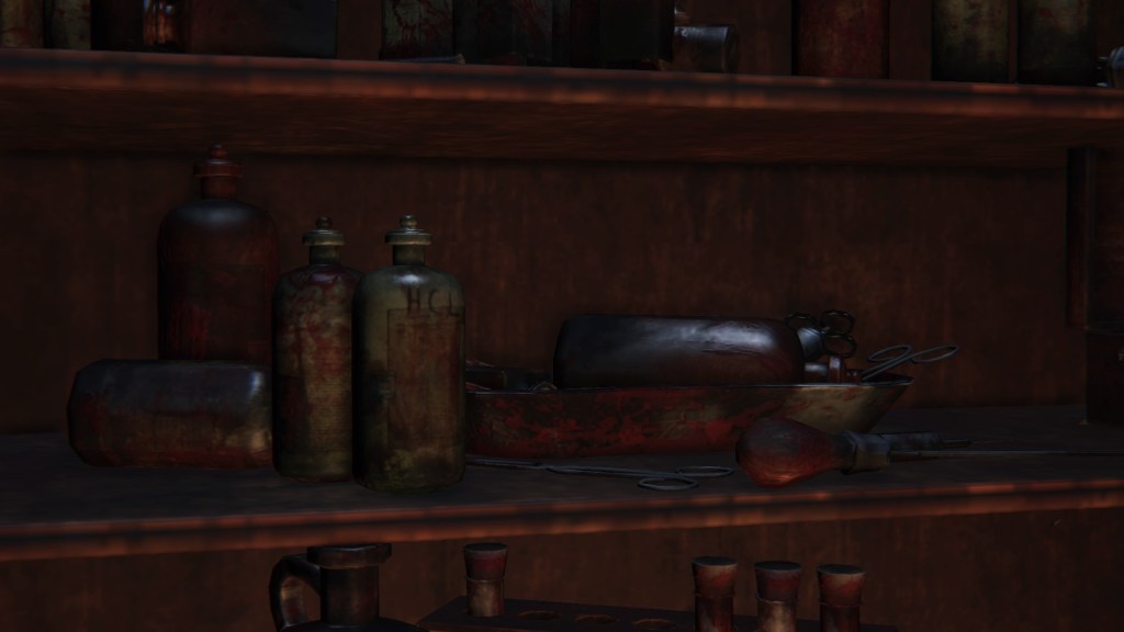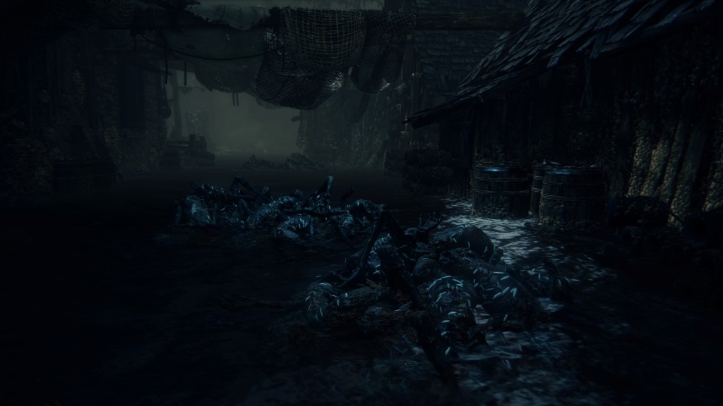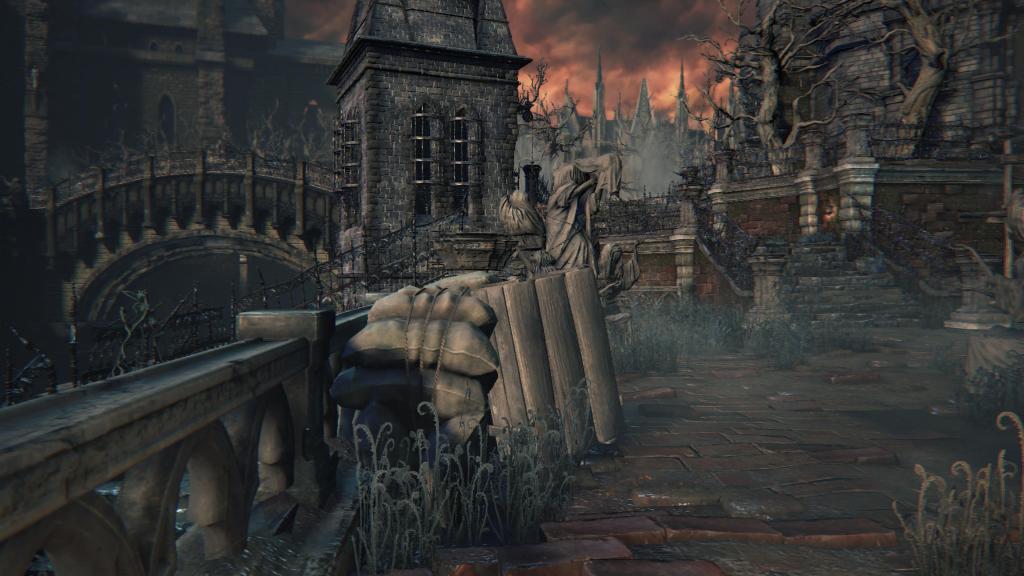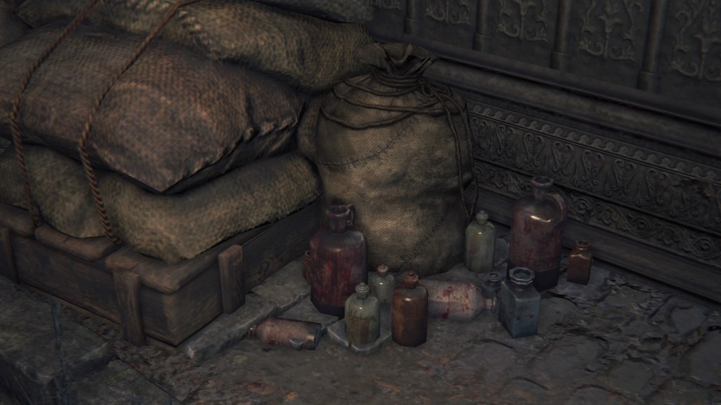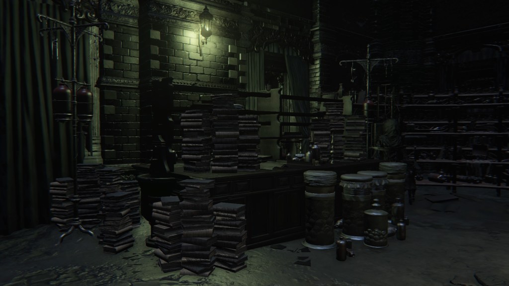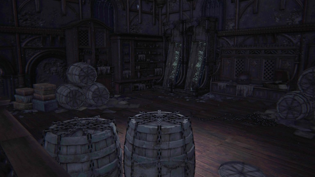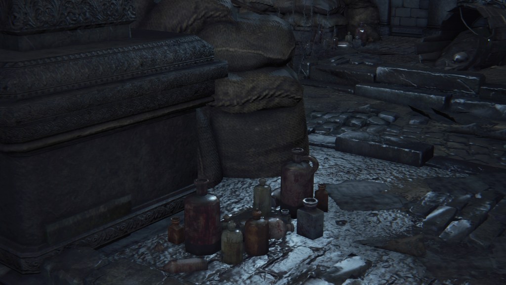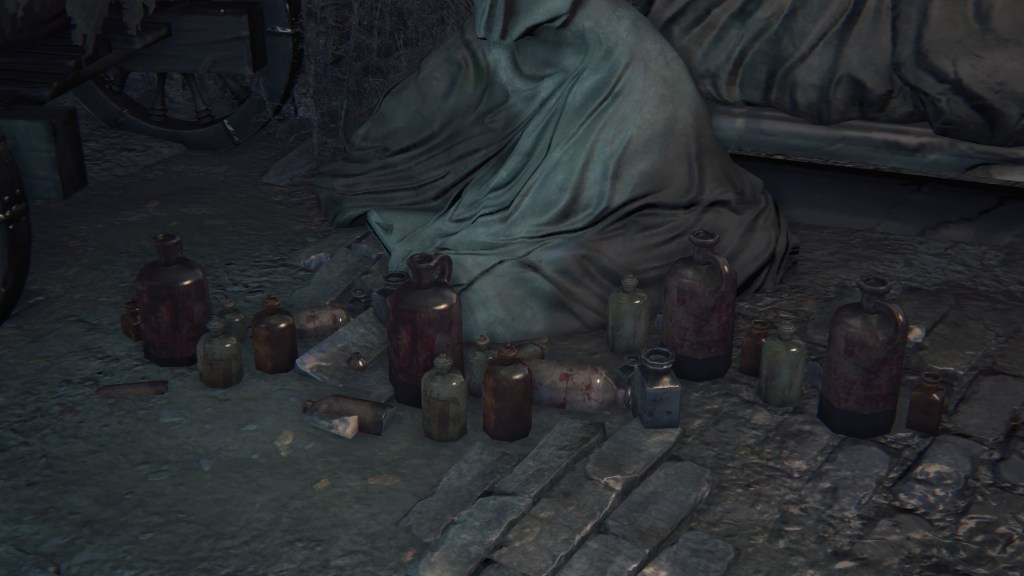 From clinic HQ, hunters of the Dream could quickly dispatch patients who turned for the worst while sending out hunting parties to clean up stragglers in the streets, linking up the Church as and where needed. But those who failed to reach a blood treatment establishment in time were soon outnumbering those who did. Beasts in bandages began plaguing every part of town along with more horrifying beasts closer to home. The hunters managed to deal with some of these bigger threats, like Paarl and the blood-starved beast strung up in the church. However, things were looking dire, and eventually, the relevant parties considered cutting their losses. The explosive oil jugs sit in the clinic or hang from the platforms in the church rafters, a nearby corpse holding onto a Molotov ready to set it all ablaze.