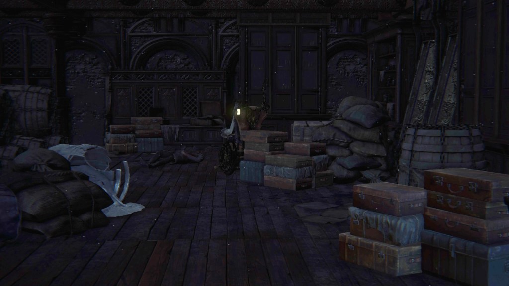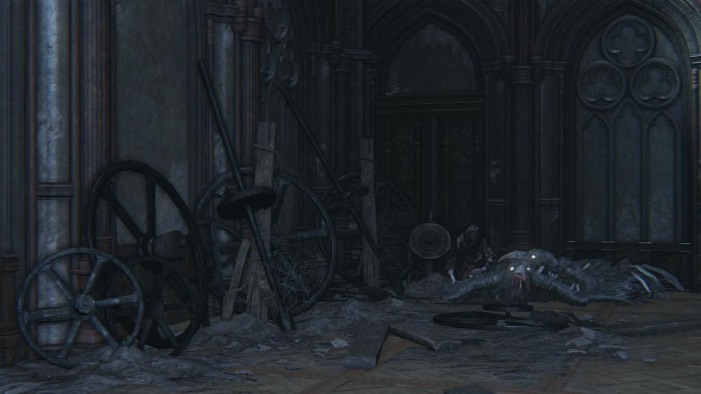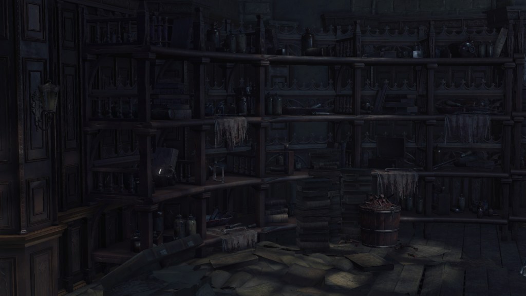 As added evidence, there is the beast-possessed soul sleeping behind the front doors. The additional monstrosity and conjuration of flame suggests that this was a hunter with a predilection for pyrotechnics, the Beast rune in his possession possibly hinting at beast blood pellets being the source of his affliction. In other words, one of the hunters who burned Old Yharnam with gusto and was subsequently booted from the Hunter’s Dream retreated into the church workshop before finally succumbing to his disease. It is possible that he was fleeing from an irate populace, but why seek shelter there? To enter Gehrman’s old workshop, presumably in some desperate attempt to see the dream again. But what greeted him was an unexpected dead end — to be fair, the sheer amount left behind proposes a bit of a rush to clear everything out. The Church was no longer communicating with the dreamers, so the hunter found himself trapped. And thus, he just hid inside securing the doors as beasthood took him, the beast since nodding off.
