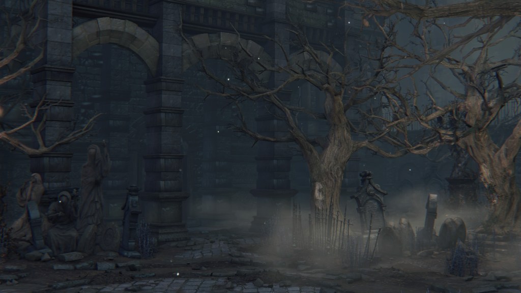 The church is home to two sizable graveyards. One exists up front before the forked road to Old Yharnam or the Grand Cathedral; the other, farther down out back. Although the localization dubs the latter the Tomb of Oedon, these are “Oedon’s underground graves” (オドンの地下墓) in the sense that they rest just outside but beneath the church’s foundations — the gate between them actually blocks visitors like us from unduly infiltrating through the building’s sewer. Given Cathedral Ward’s proximity to the Forbidden Woods, the Healing Church likely established Oedon Chapel in order to maintain control over the bodies they inevitably had to bury per Yharnam’s customs. It is no accident that Oedon Tomb has another wise man statue standing tall above the graves as its centerpiece. The Healing Church would always keep watch over their old research, just in case there were any new developments. But space being limited, a second graveyard soon needed to be added up top, taking over a previous square based on the water well at the center of this small cemetery.