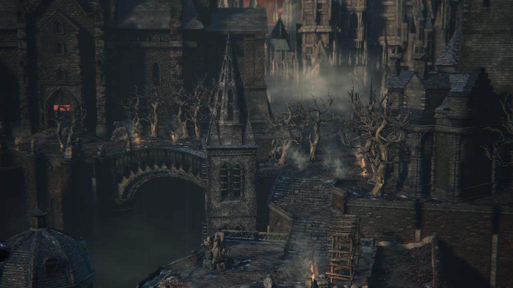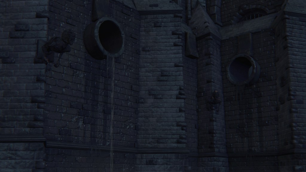 The Healing Church’s new district couldn’t be run on the clergy alone. For one, the urban center so high above the river valley needed a sewer, which began with the bridge to Oedon Chapel. That growing church district on the west side of the valley was likely the reason for a sewer existing on the east end. Walls of the main line are adorned with statues of the messengers, figures also featured around the Cathedral Ward’s main gate and in the Grand Cathedral tabernacle. This implies that the sewer itself was built with the Church’s backing, which required lay workers to manage it. This resulted in homes springing up around the sewer so as to live near where they worked, and soon a whole town was built up. This explains why the buildings feature imagery of not just holy women with the sick but also austere scholars. Yharnam has streets atop the valley because of the Healing Church, a larger bridge constructed to more formally connect the new city with the Cathedral Ward as they built up in parallel. Indeed, the district became its own town, for engineers, builders, and custodians as well as clerics.