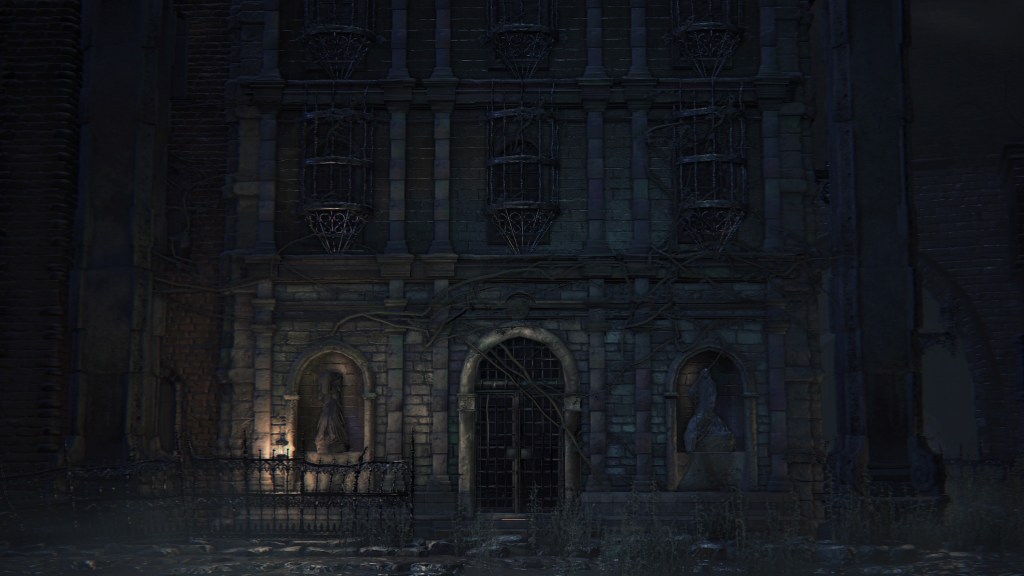Old Yharnam is home to not one but two churches. One is the Church of the Good Chalice, but another sits close by opposite side of the river. And unlike the old church, this was built by the Healing Church. The outside of the building is adorned with all the old city’s statues, while the inside alternates specifically between the sick and bearded men in robes reminiscent of ancient Greek philosophers. The altar stands curiously near the entrance to this grand hall, elsewhere keeping coffins and incense urns. One such coffin has been brought right before double doors at the back of the grand hall. The robed men statues flank either side, and a corpse possessing madman’s knowledge lays against them. Although we cannot interact with the doors, they clearly lead to some inner sanctum, where wise men might study victims of the beast scourge to discover maddening secrets — Adella insinuates that such knowledge pleases clerics. Indeed, corpses in the rafters carry more madman’s knowledge or a bloody head bandage, leaving no reason to doubt this as a Healing Church facility; most likely, the first of its kind.