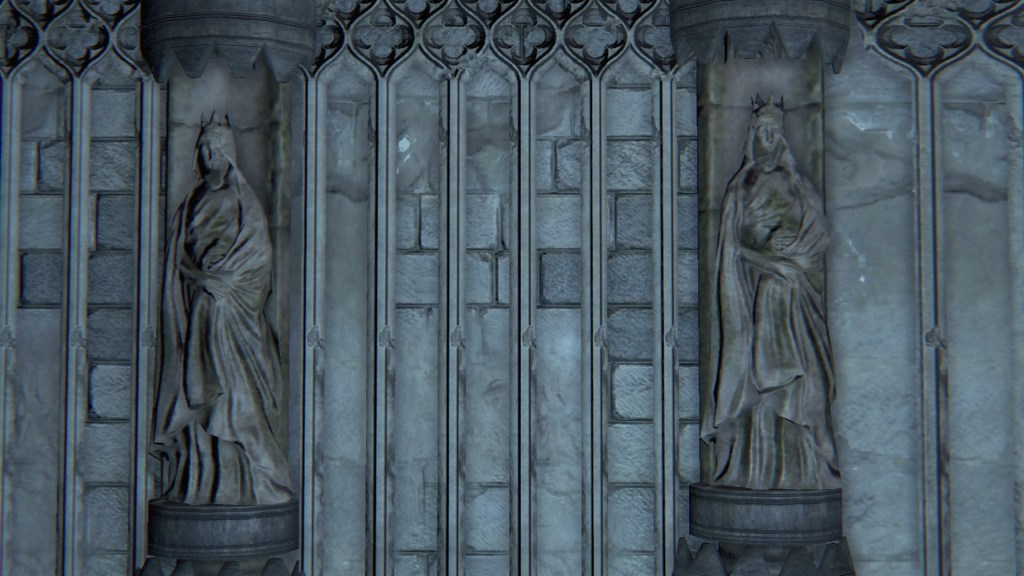 Looming above the tabernacle for the holy medium is the statue of a woman pouring a liquid vessel in its direction. This statue is the same seen in the graveyard of Hemwick, the heads of both damaged from long-time weathering. However, concept art confirms that the figure is a hooded woman with long hair, resembling the figure seen at the Witch’s Abode and the Church of the Good Chalice. The Healing Church thus appears to have co-opted an existing effigy in Yharnam to portray their blood treatment as an outgrowth of the traditional religious culture; we see civil and clerical infrastructure both employ the holy woman imagery above Old Yharnam. The outsiders worming their way in is further exemplified by the blindfolded wise men statues raising their arms in praise toward the woman from either side of the tabernacle, statues of plain laity doing the same at their feet but facing away from the blood. As a result, the altar underlines the importance of this ritual of holy communion to the Church. The institution’s legitimacy is predicated upon the sacrality of its blood, and so the Grand Cathedral is the center of operations for the current heads.