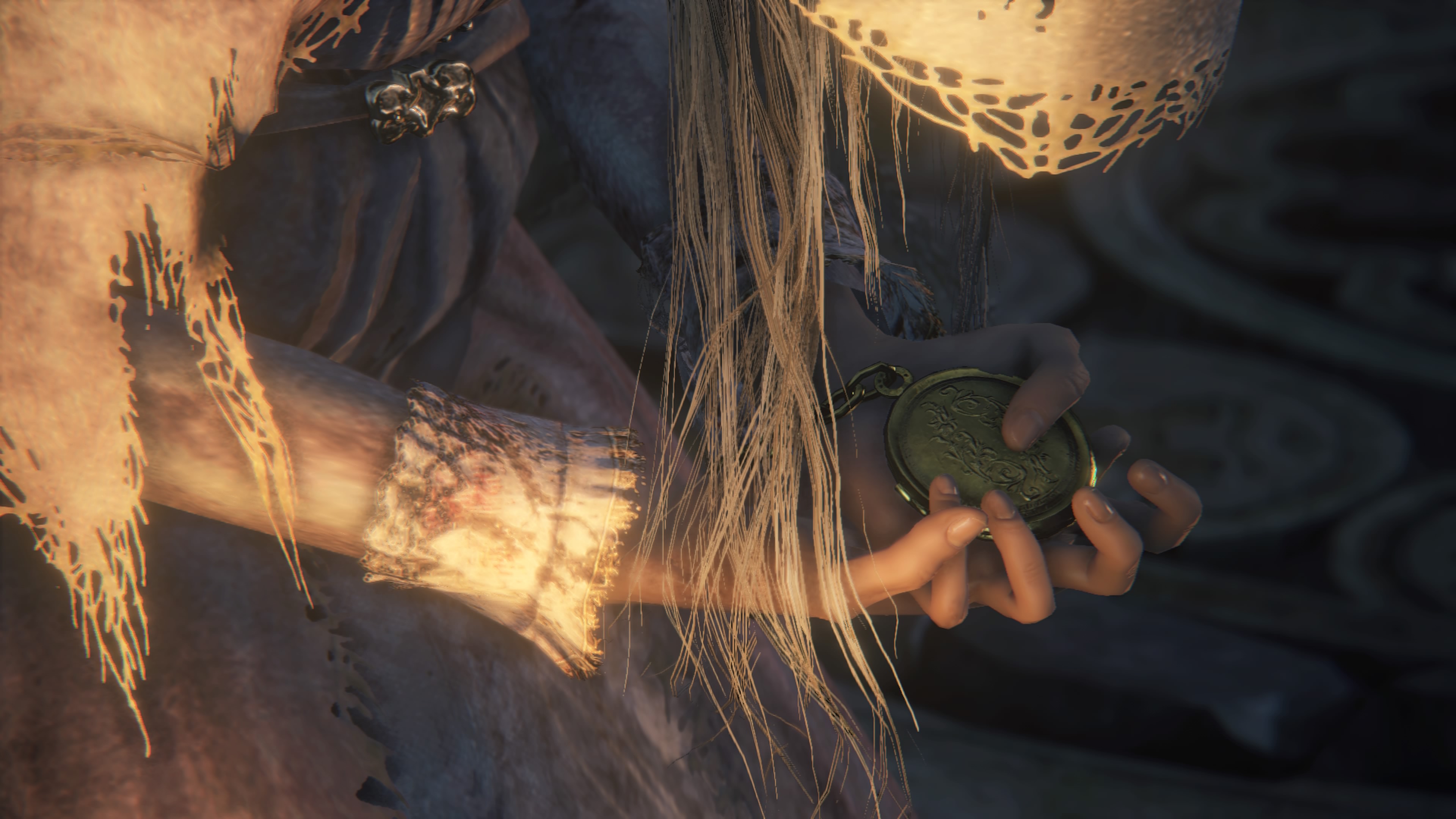 Meanwhile, his head was being used for more blood ministration. Initially, it was probably brought as mere proof that the hunter had found the Church’s missing Vicar. But once a study of the head discovered the nature of the beast blood, it was made the new holy medium going forward. Laurence’s colleagues honored the man like a Catholic Saint, enshrining his remains as holy relics — a note refers to the skull as a “sacred covering” (聖蓋) because the term more literally means “head covering”. (頭蓋) They looked to him for guidance on their path forward, even in death. This is best demonstrated in the ritual for admitting his successor. As said note in the cathedral explains, subsequent Vicars touched Laurence’s skull to learn the adage from his memory of Willem. The first Vicar’s gold pendant has similarly been passed down within the Church to each new Vicar. The Vicars were expected to carry on Laurence’s legacy throughout the generations. Only by inheriting his will would the new leader be allowed to inherit the secret rites behind Yharnam’s blood donations to be managed.