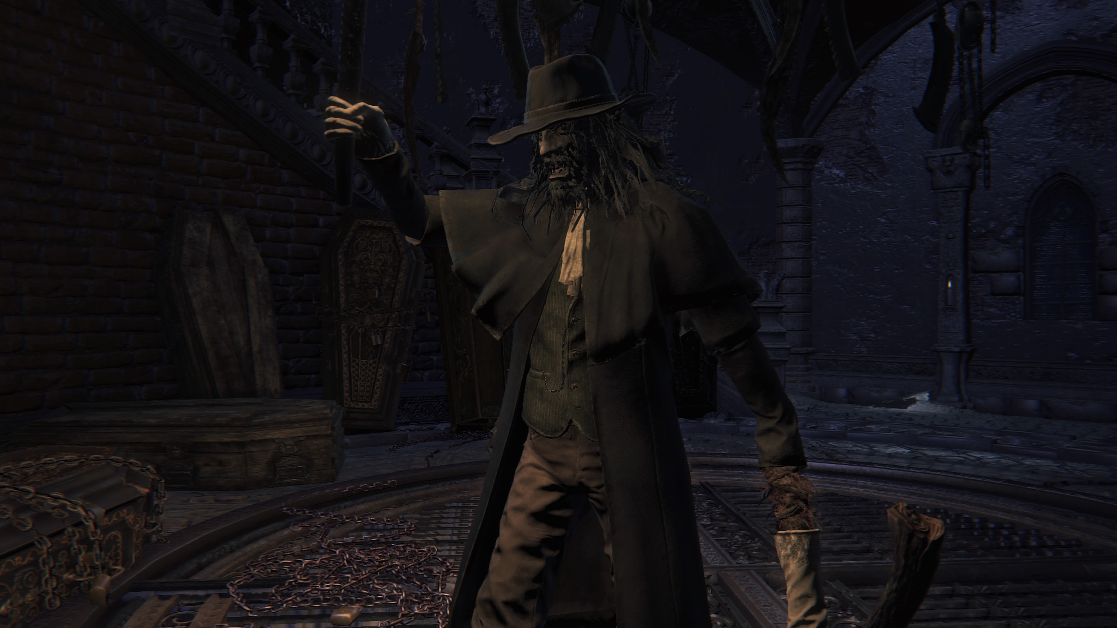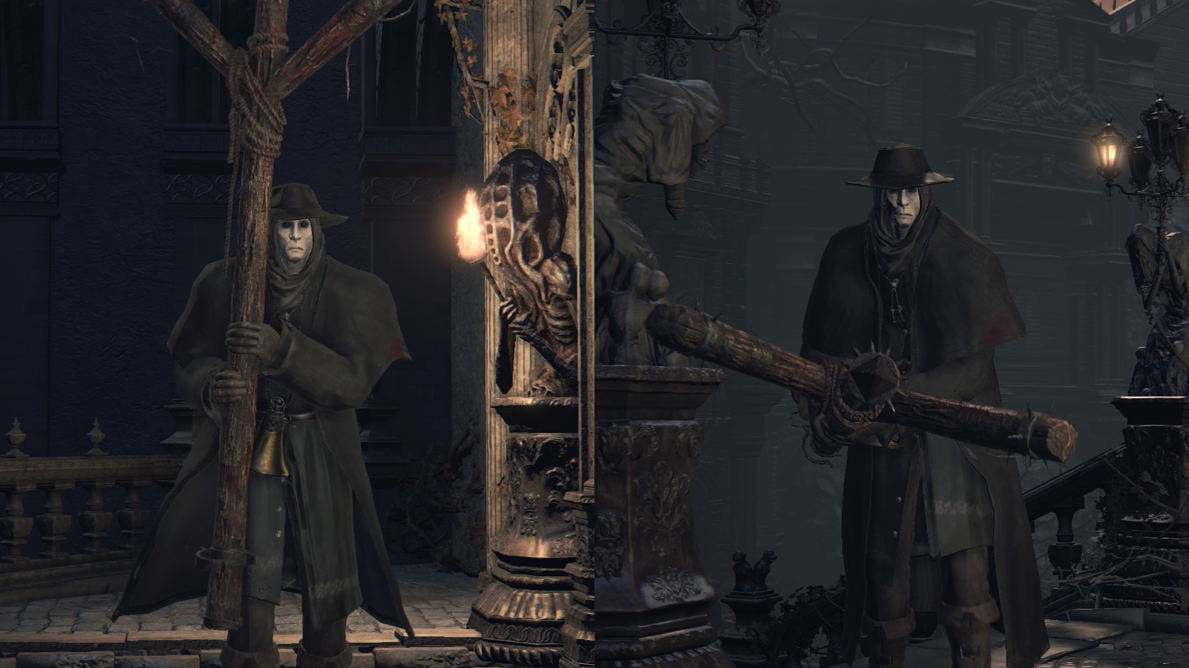 It wasn’t as if the church hunters were completely left to their own devices. On hunt night, they set out with a hunter chief, who receives a special holy cloth bearing the Healing Church’s sign. This fancy handkerchief is waved as a signal to open the main gate of the round plaza, the Grand Cathedral otherwise remaining shut tight. This naturally places the burden on the chief to decide when the hunt ends; failure to follow that lead meant being left to fend against the beasts alone. This gives the hunters ample incentive to obey the chief’s direction, functioning more like an army corps under a captain’s command. But even with a command structure, citizens have still been hunted before they had turned into beasts — being captain didn’t make the hunter any less susceptible to paranoia. It is for that reason that the description to the basic uniform equates its black color with this “dark madness” happening in Yharnam. None were safe from the beasts or the hunters.
