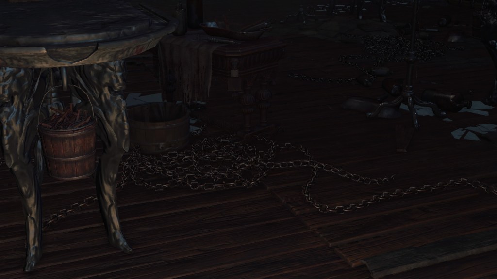With this second area cut off from regular traffic, what is one more? The Church also dissociated from Gehrman, making his hunters the scapegoat for their mutual, unpopular decision. This went beyond just the Hunter’s Dream. The entire bottom half of the Healing Church Workshop interior has been demolished, nothing except some stray wooden platforms and beams along with a pile of leftovers remaining. The only purpose this serves is to prevent entry to the Abandoned Old Workshop, which is too extreme for its operations simply shifting to the dream. In that case, it is more likely that the Church did this to prove how they cut off any connection with the old hunters.