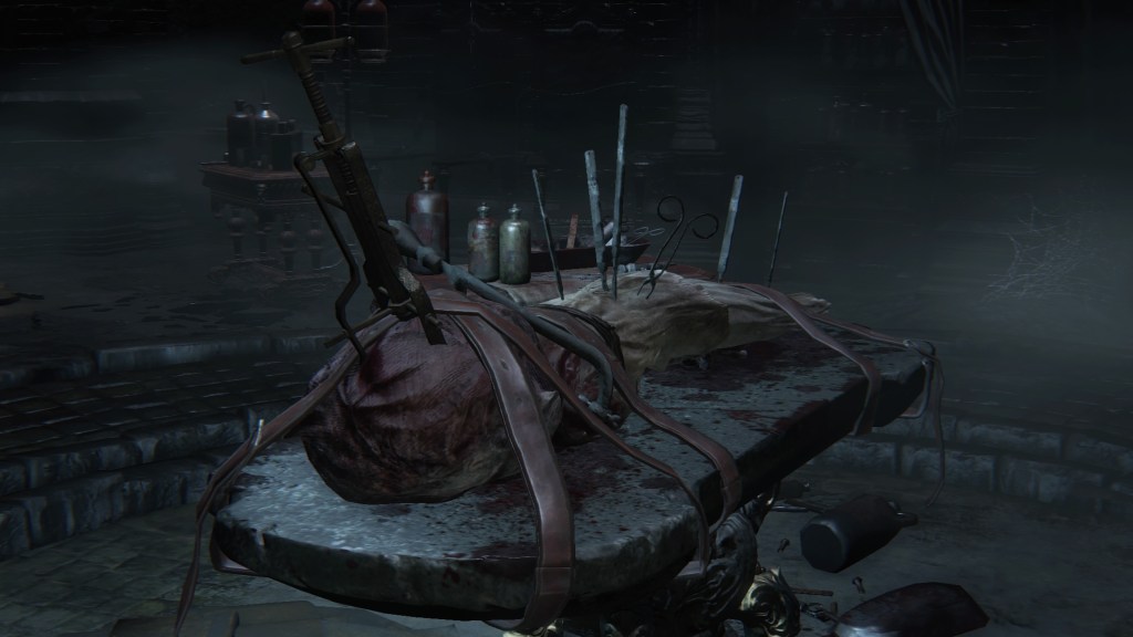 Between their education at Byrgenwerth, relations with Cainhurst, and research in Yharnam, the church fathers developed a number of practices. Most, of course, pertain to their methods in handling the beast scourge. That phrasing is apt since those methods involve physical contact with the disease for understanding. As demonstrated in the surgery altar, all treaters wear long, white gloves for protection during hands-on experience with patients, the detailed embroidery at the cuff acting as a charm; considering that it possesses blood defense rivaling the best for arm wear, arcane enchantment is likely. This way, they can feel or extract blood and viscera without fear of infection. The patient’s abdomen has thereby been eviscerated, the central experimenter’s hands ready to dig into more while his faceless assistants hold a book — representing knowledge — and a bell — representing the arcane — respectively. Peeking out underneath the table behind the hanging cloths lurks a beast, an acknowledgement of the dangerous potential hiding beneath this ill man’s unsuspecting exterior.